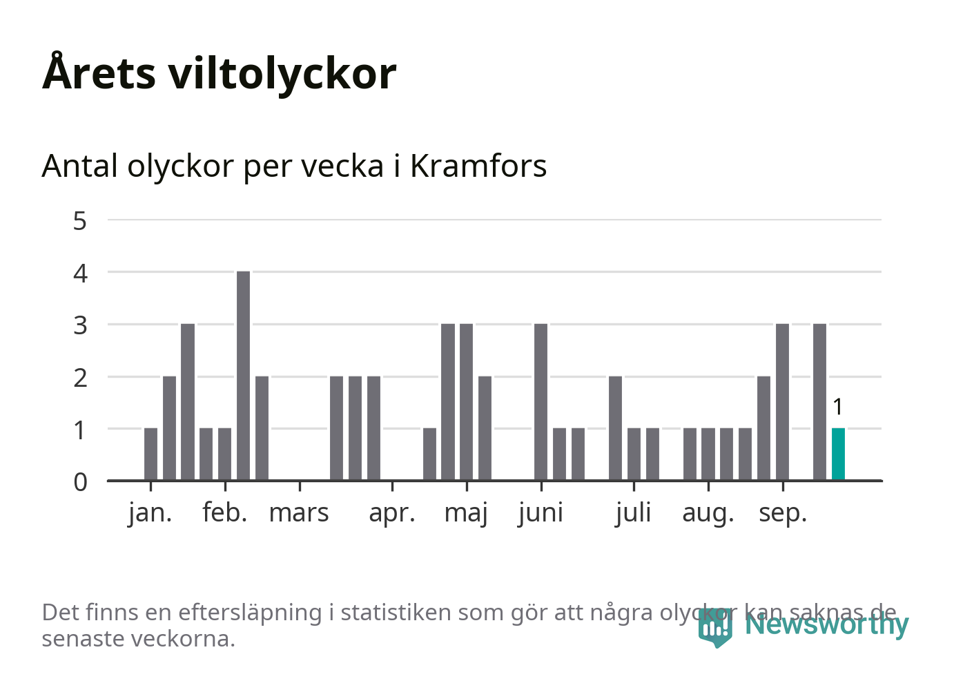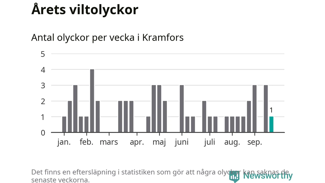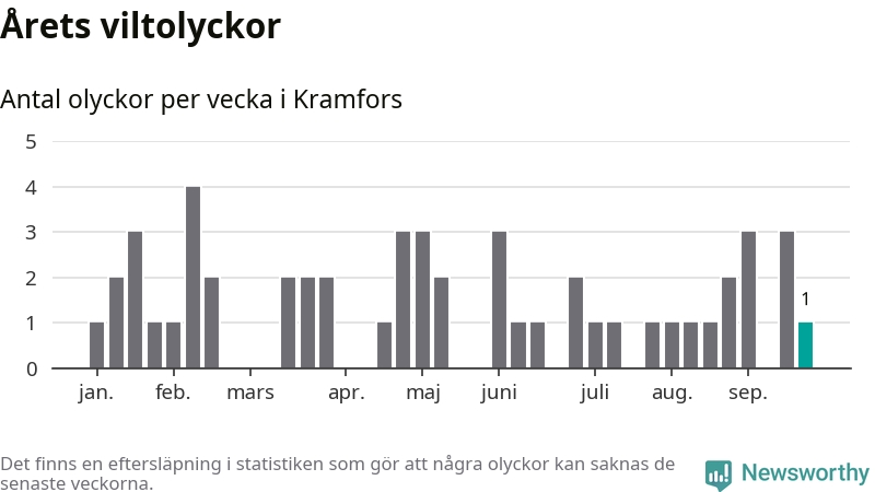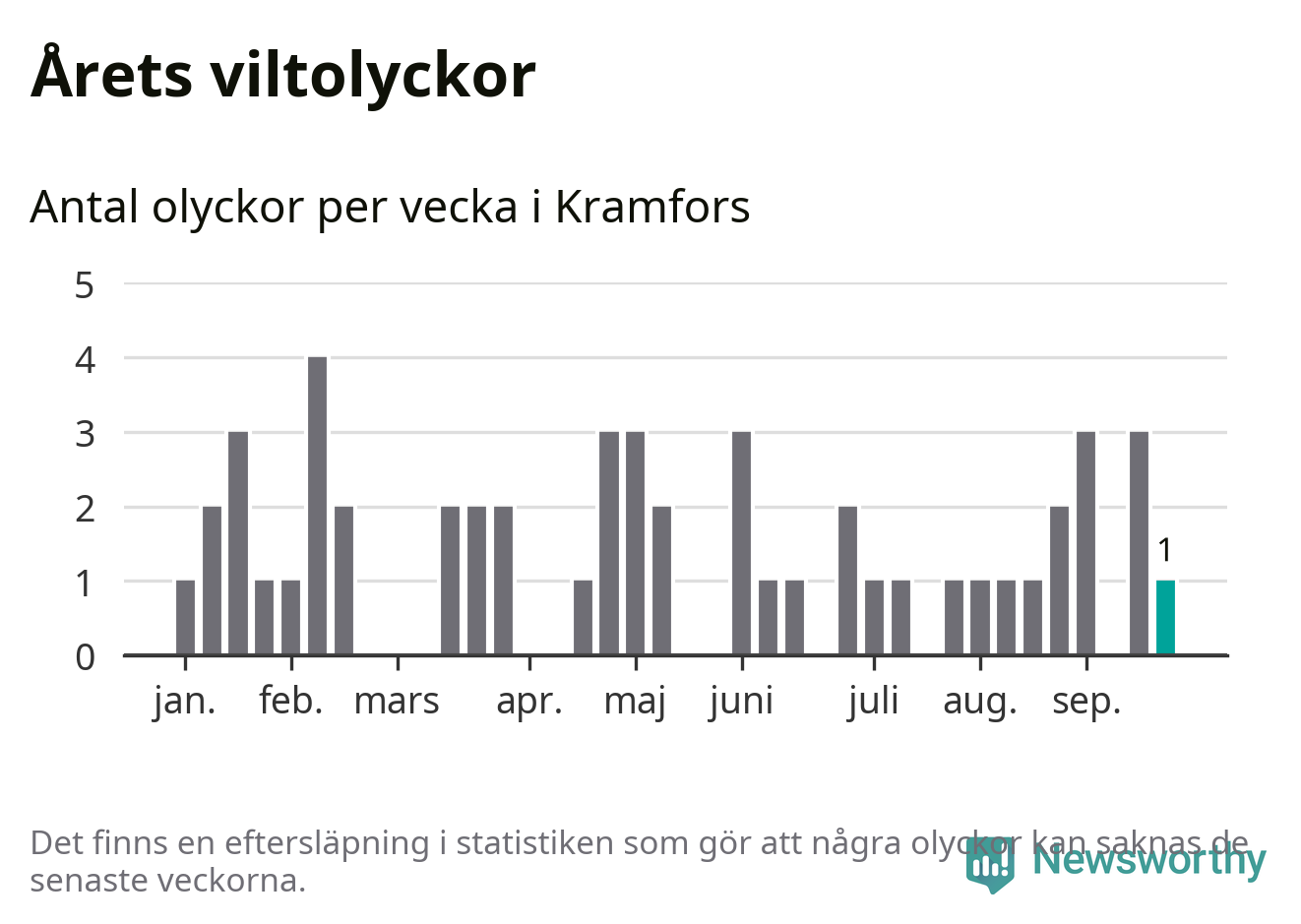 Från förra veckan (vecka 39) har hittills en viltolycka rapporterats in i Kramfors kommun.
