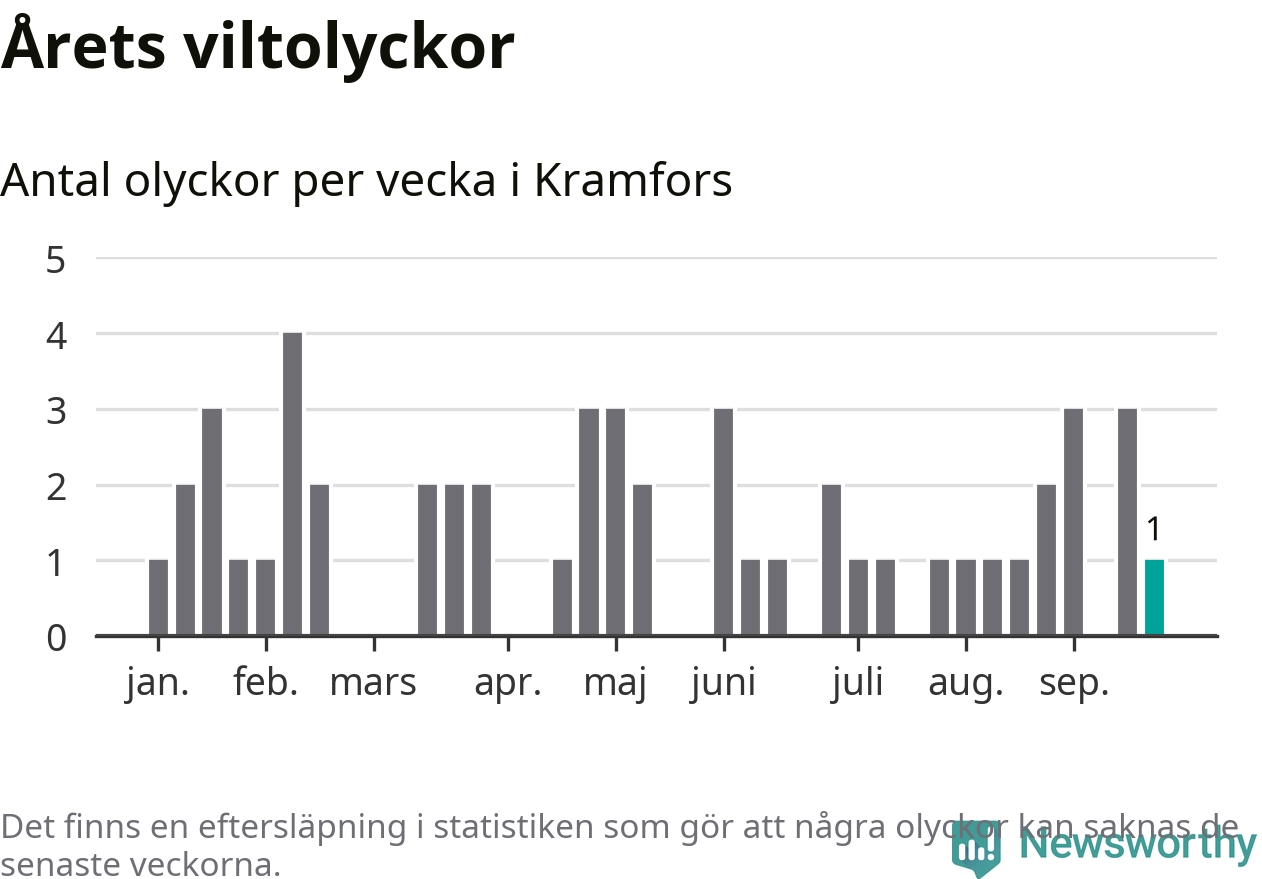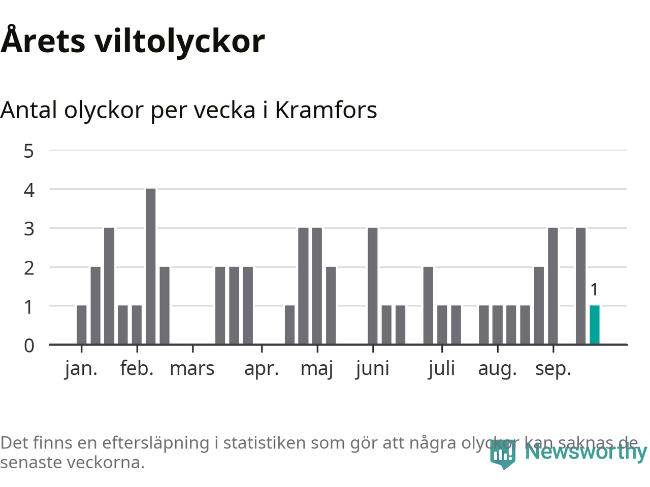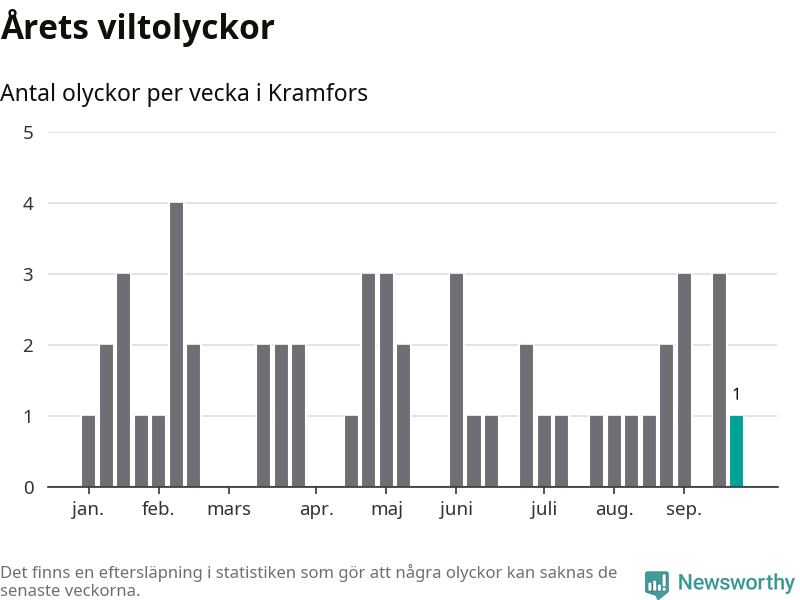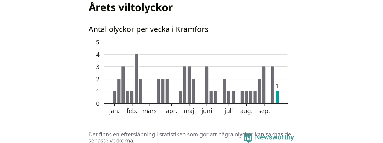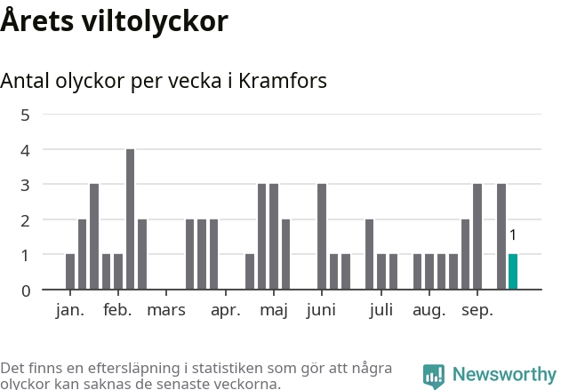 Från förra veckan (vecka 39) har hittills en viltolycka rapporterats in i Kramfors kommun.
