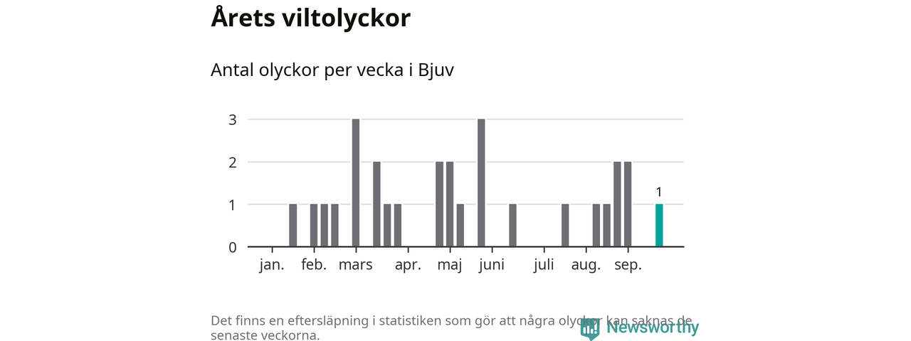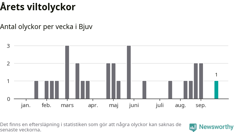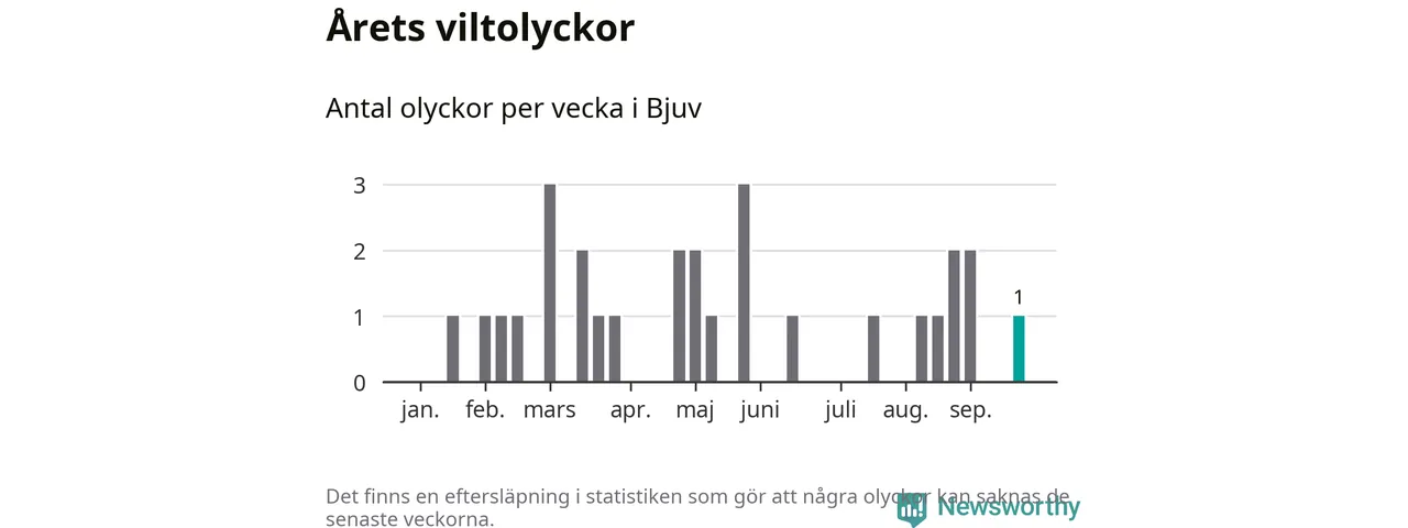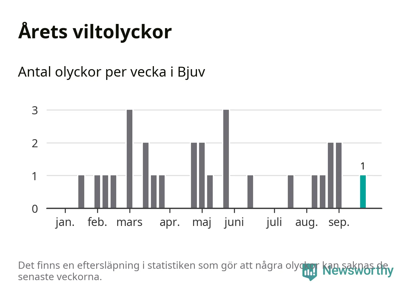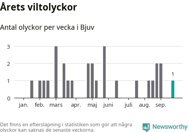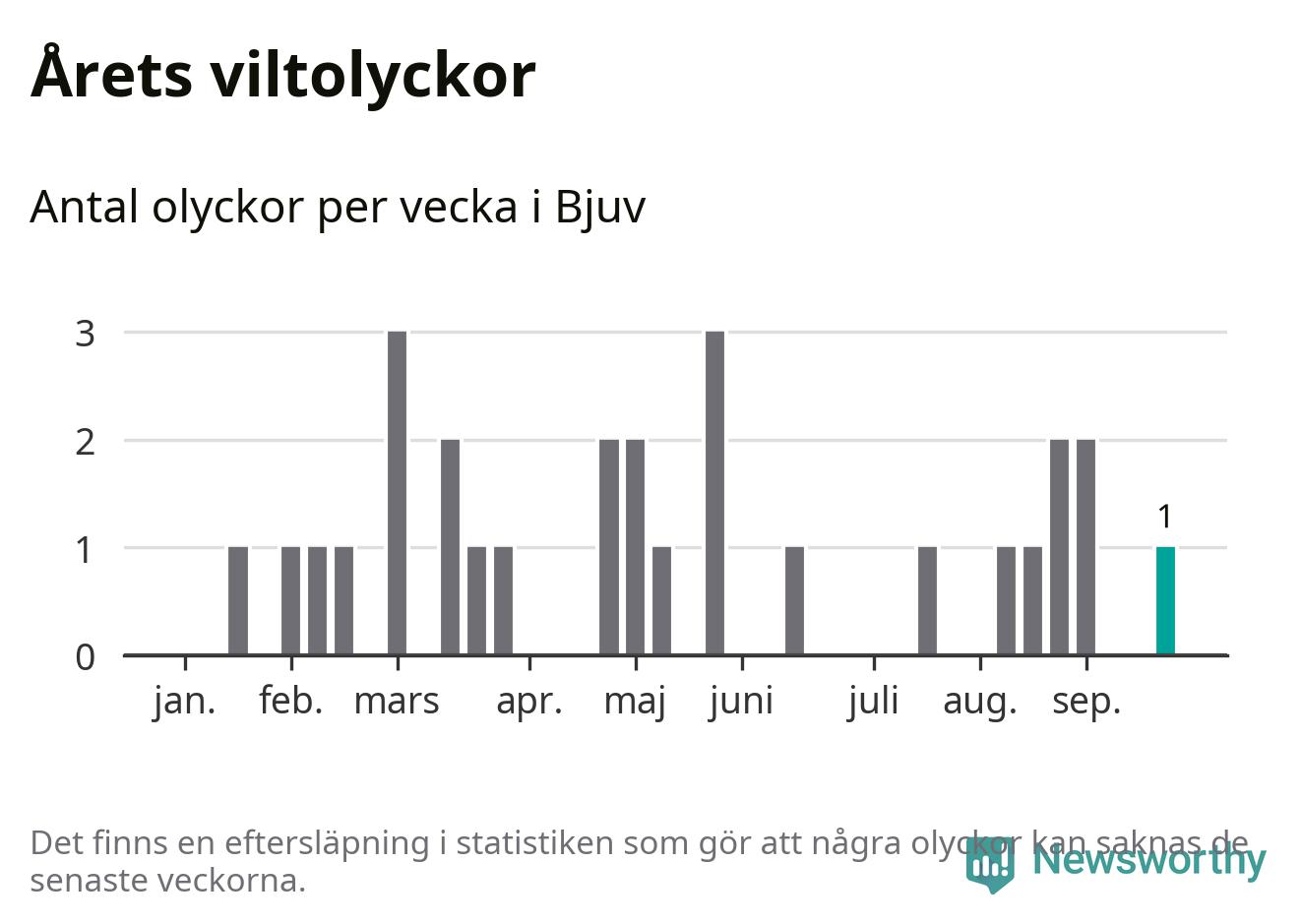 Från förra veckan (vecka 39) har hittills en viltolycka rapporterats in i Bjuvs kommun.