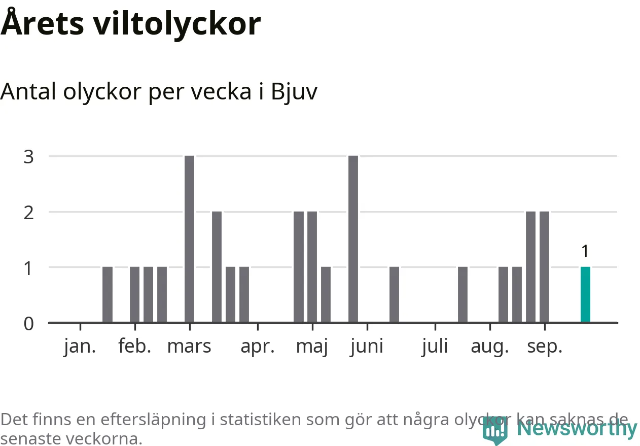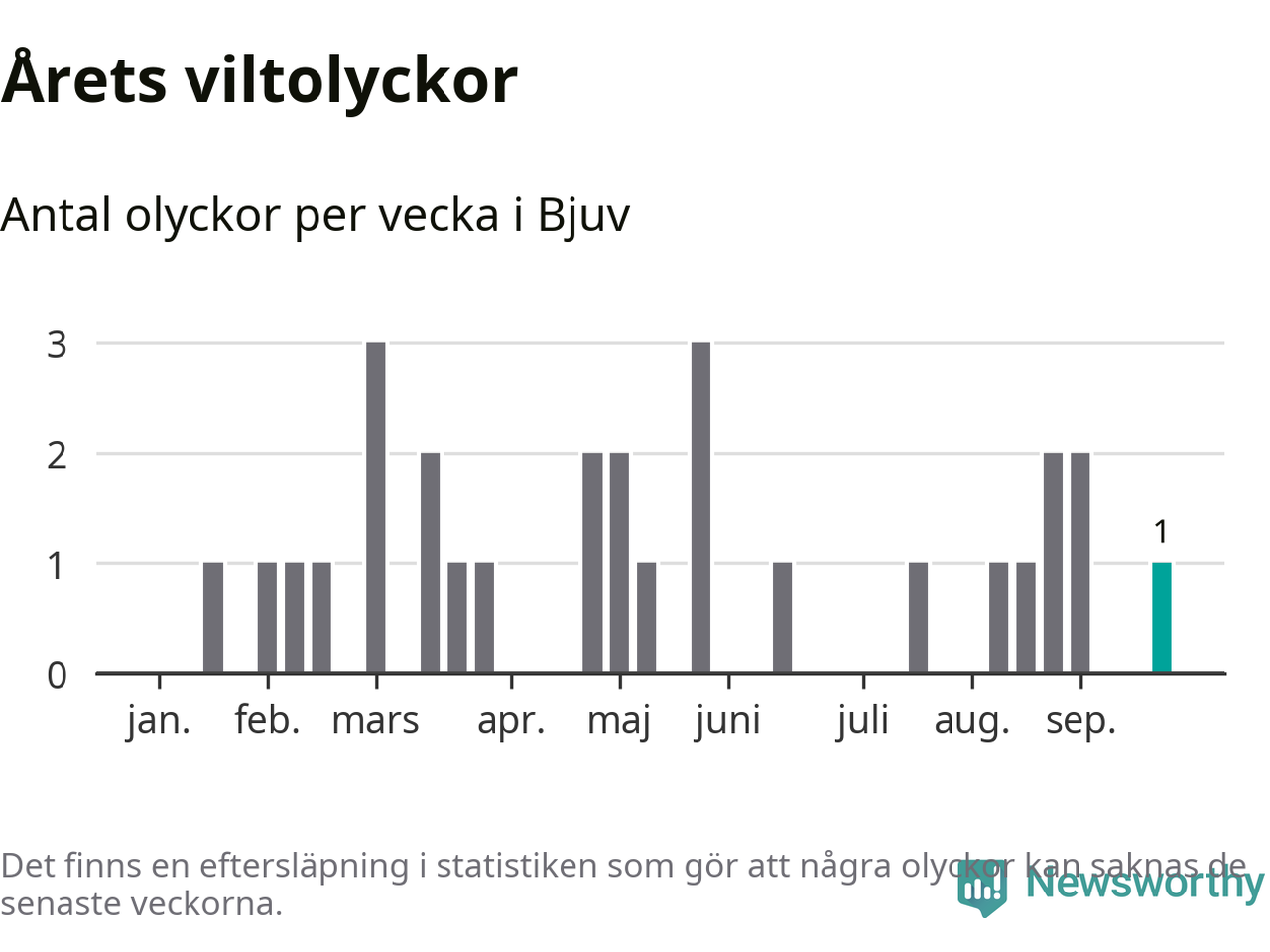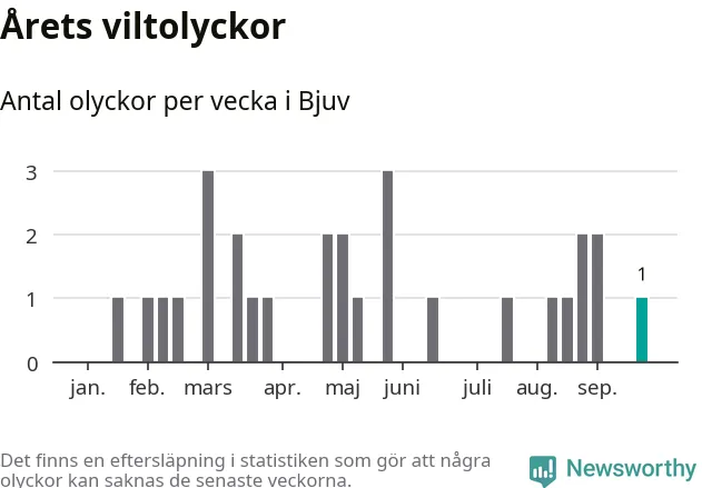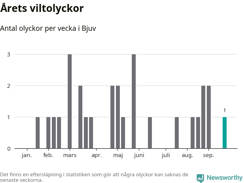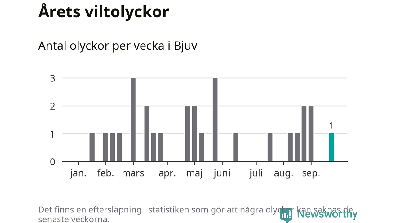 Från förra veckan (vecka 39) har hittills en viltolycka rapporterats in i Bjuvs kommun.
