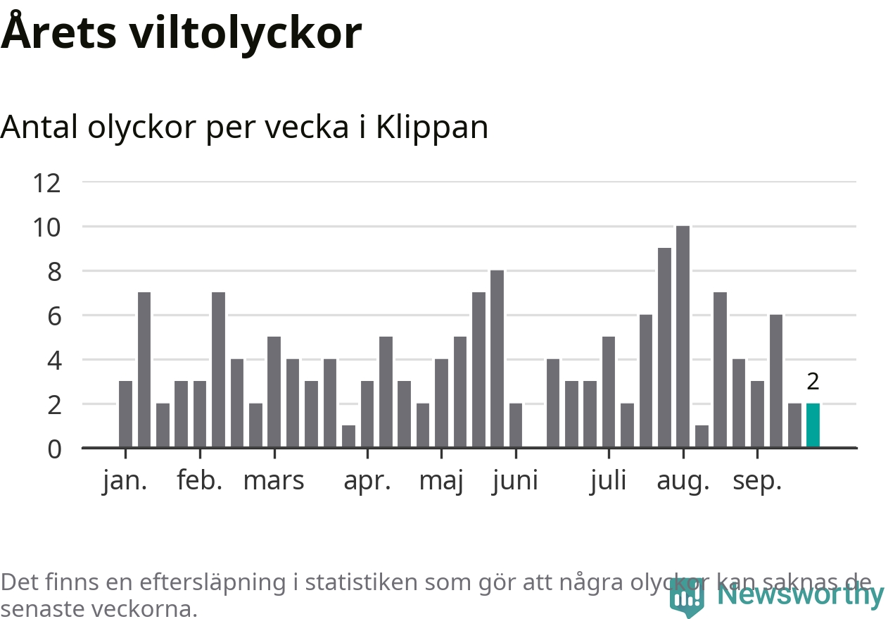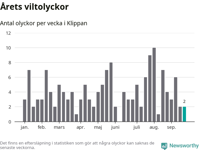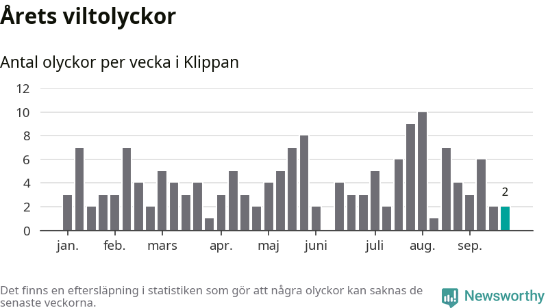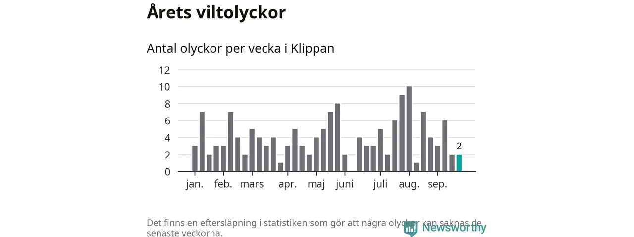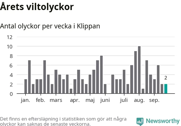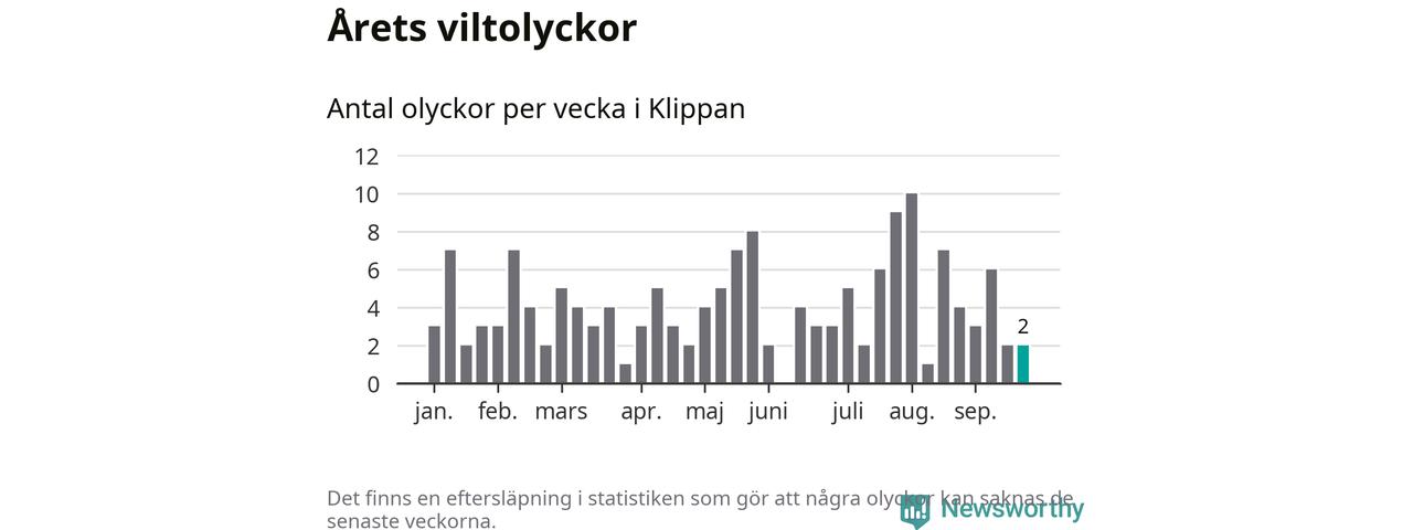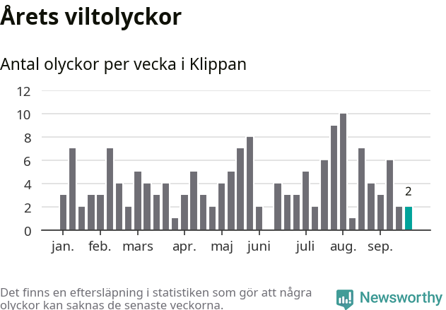 Hittills har två viltolyckor rapporterats in i Klippans kommun från vecka 39. Se listan här.