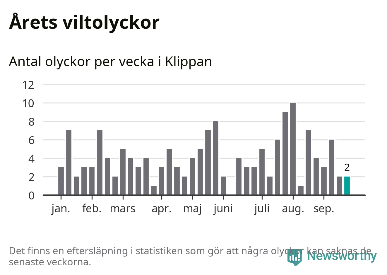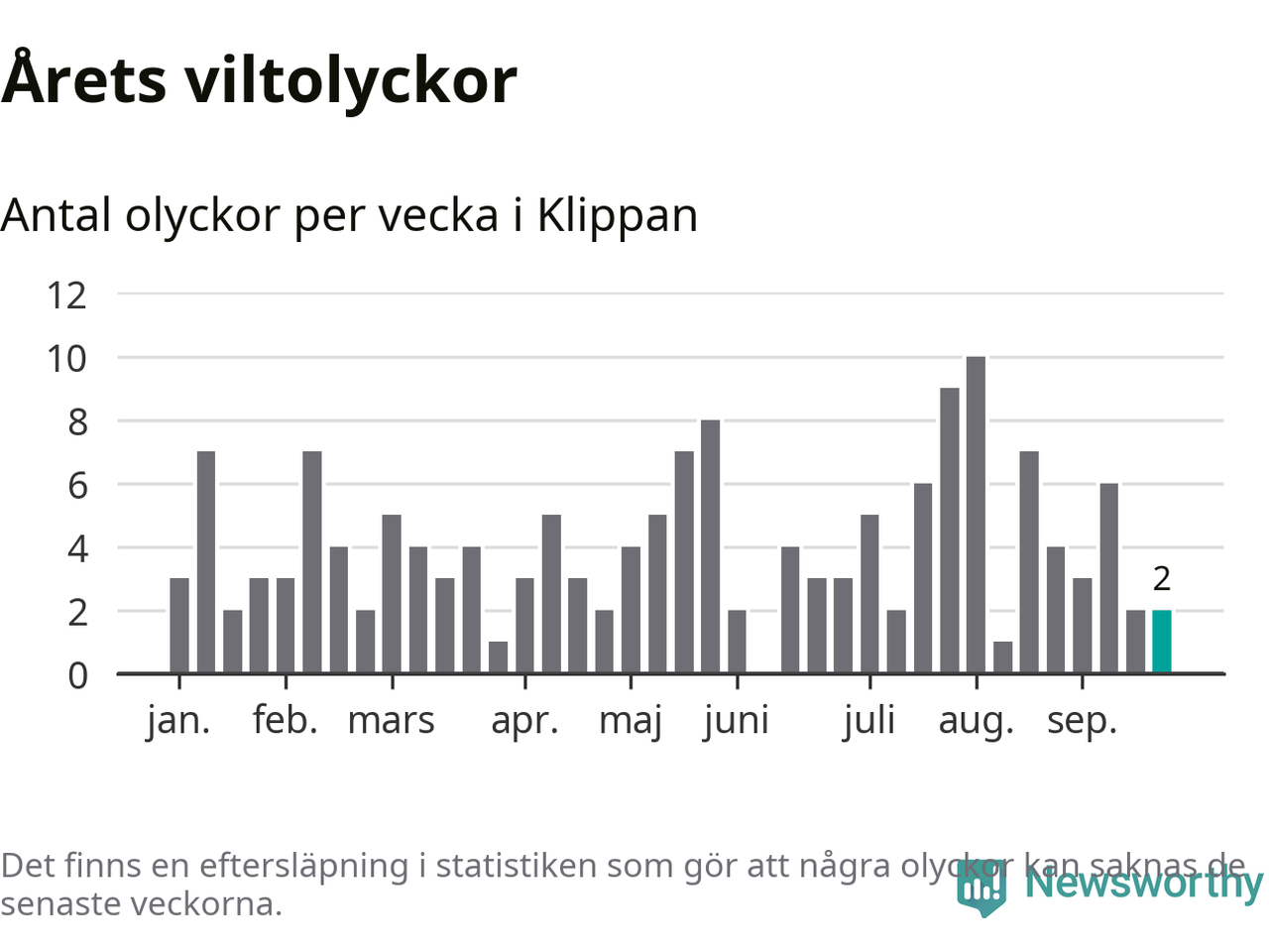 Totalt det här året har det inträffat 158 viltolyckor i kommunen. Det är mer än genomsnittet för motsvarande period (omkring 126) de senaste tio åren.