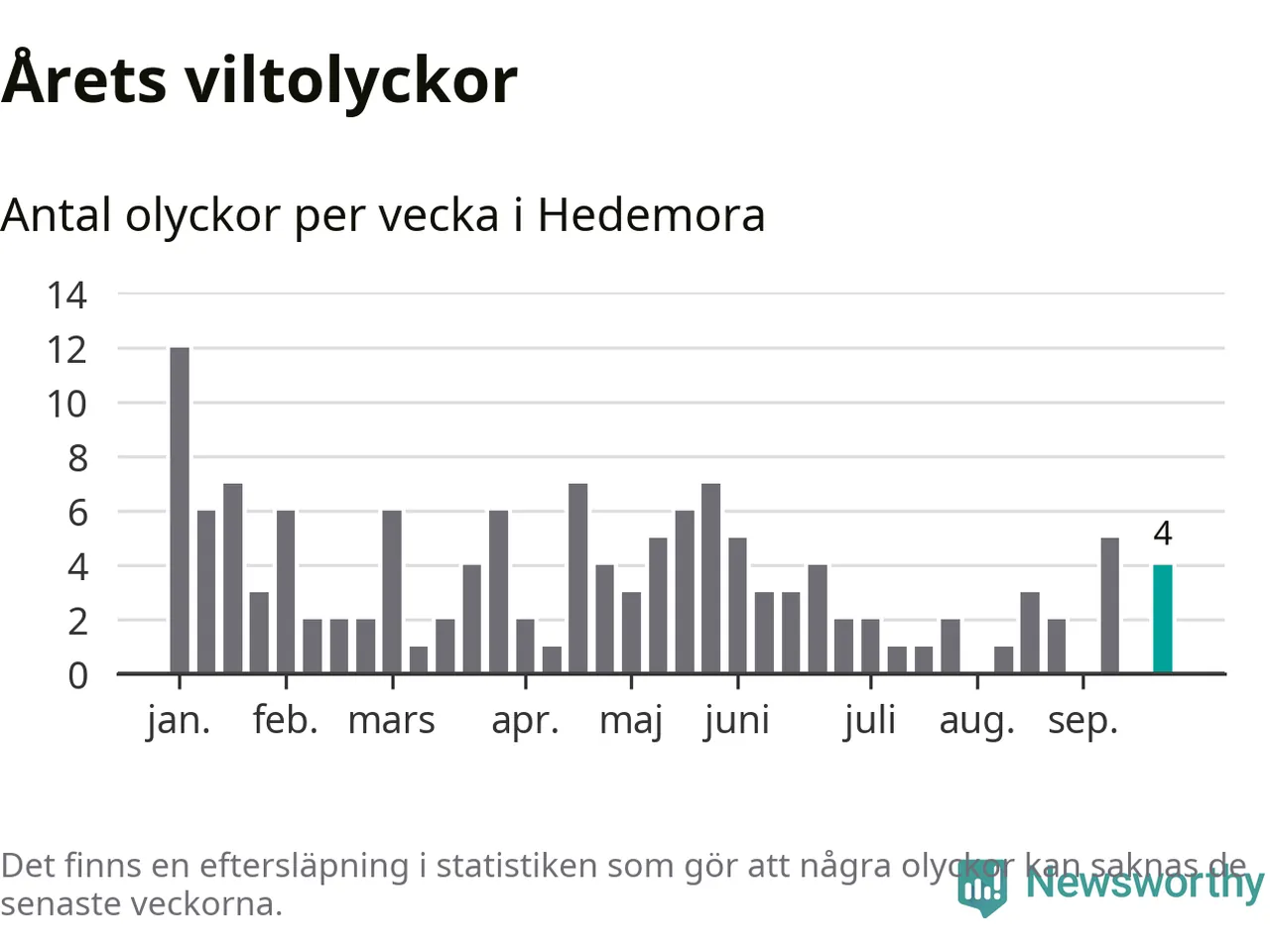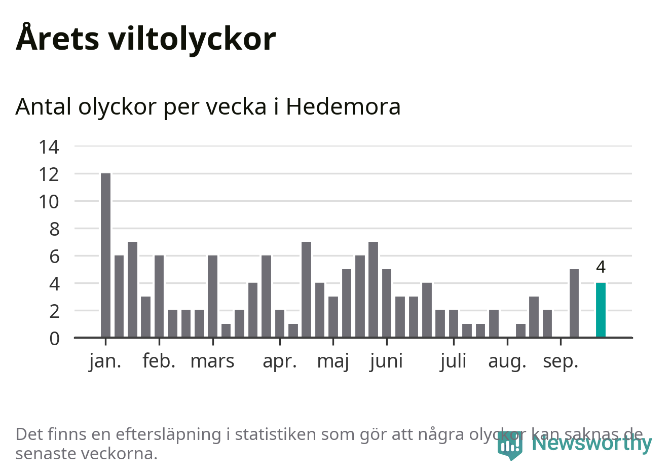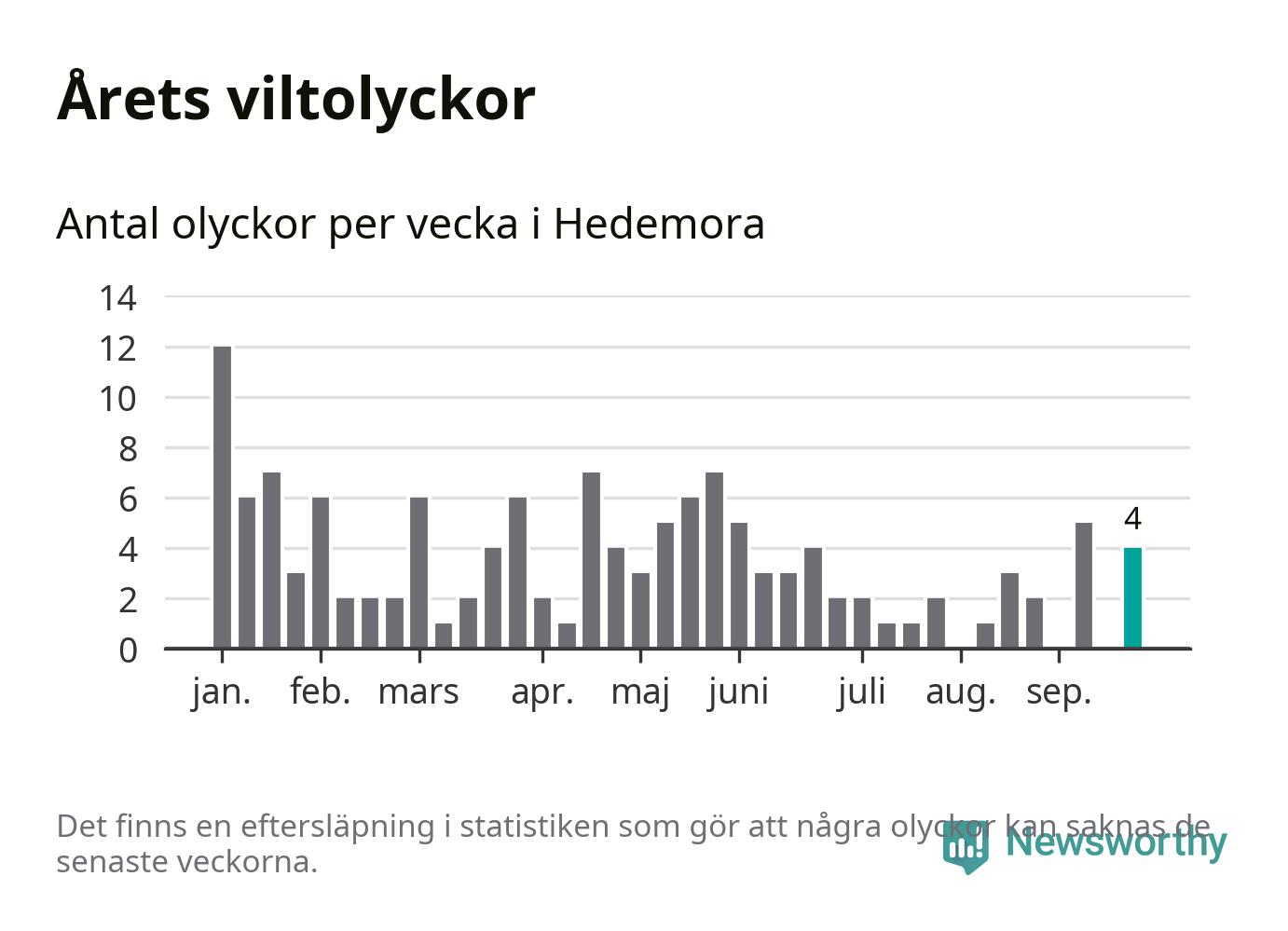 Hittills har fyra viltolyckor rapporterats in i Hedemora kommun från vecka 39. Se listan här.