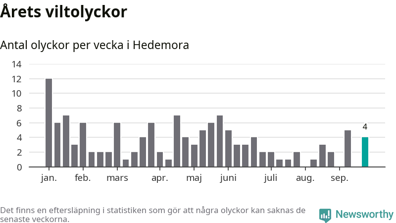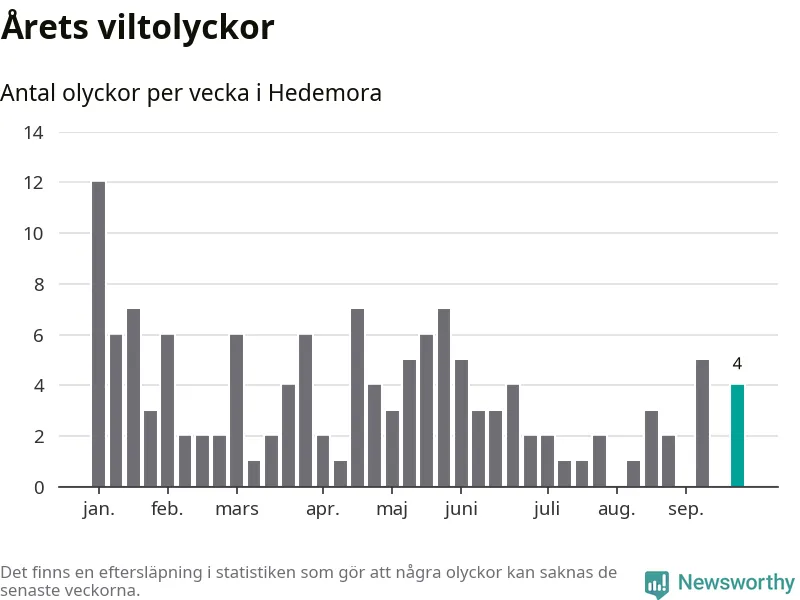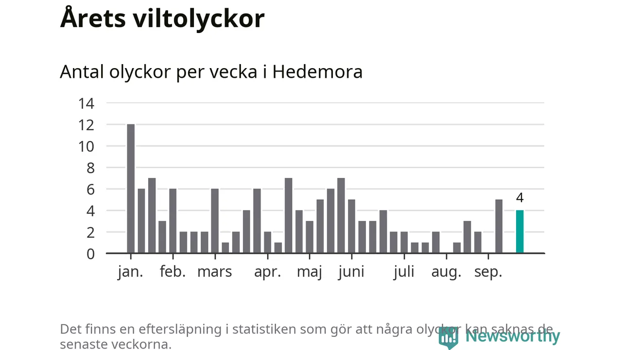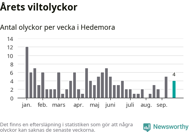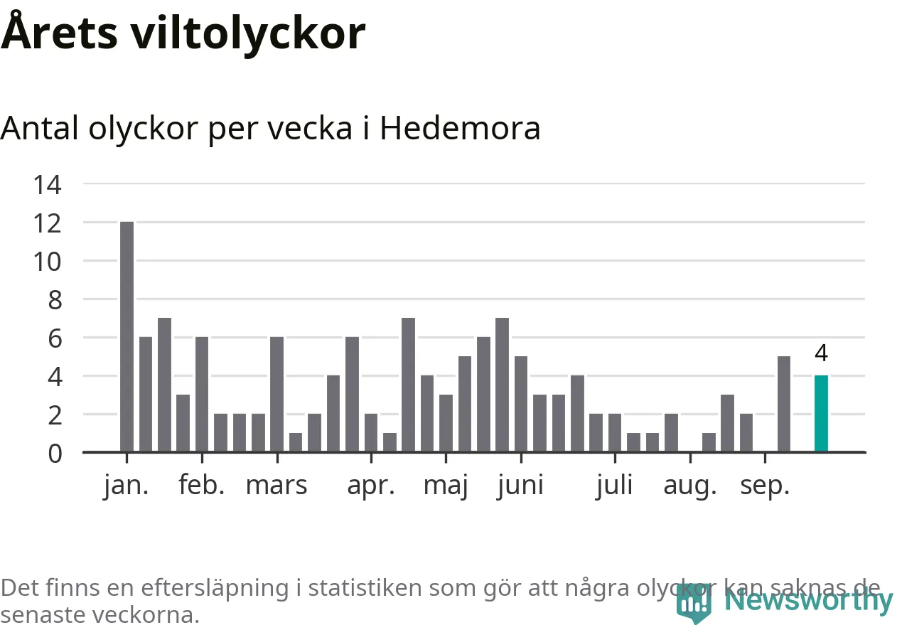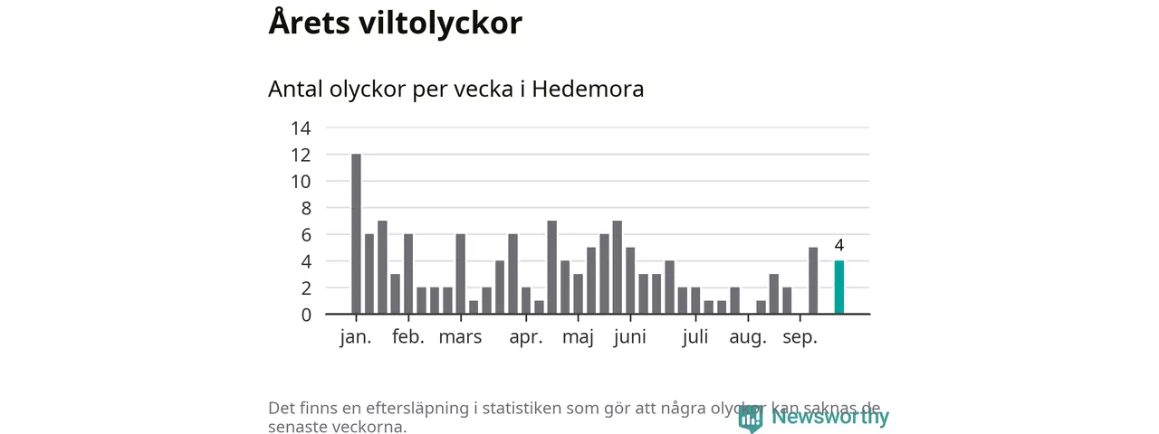 Hittills har fyra viltolyckor rapporterats in i Hedemora kommun från vecka 39. Se listan här.