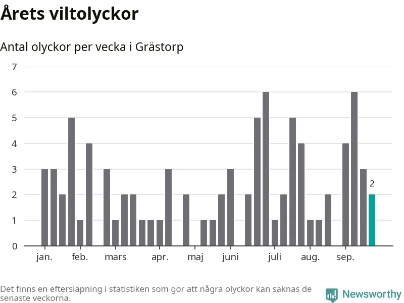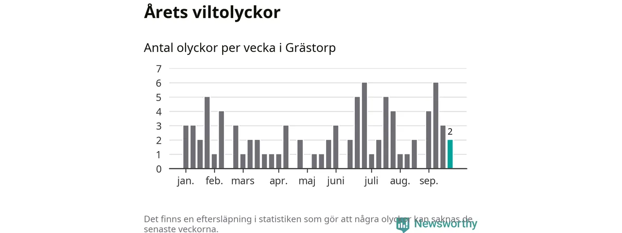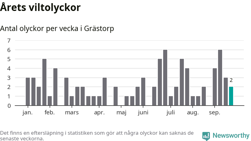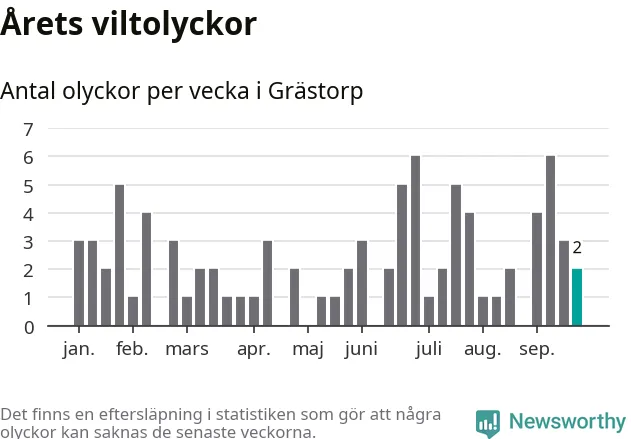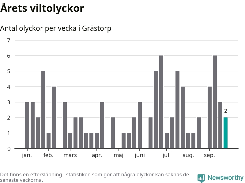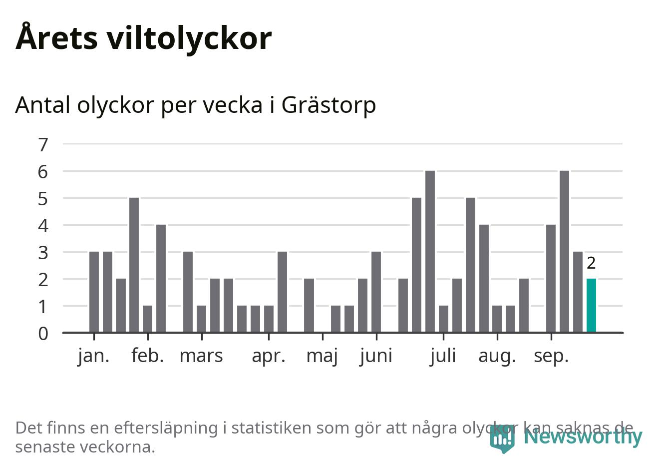 Hittills har två viltolyckor rapporterats in i Grästorps kommun från vecka 39. Se listan här.