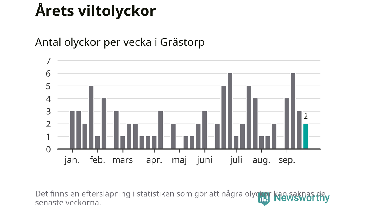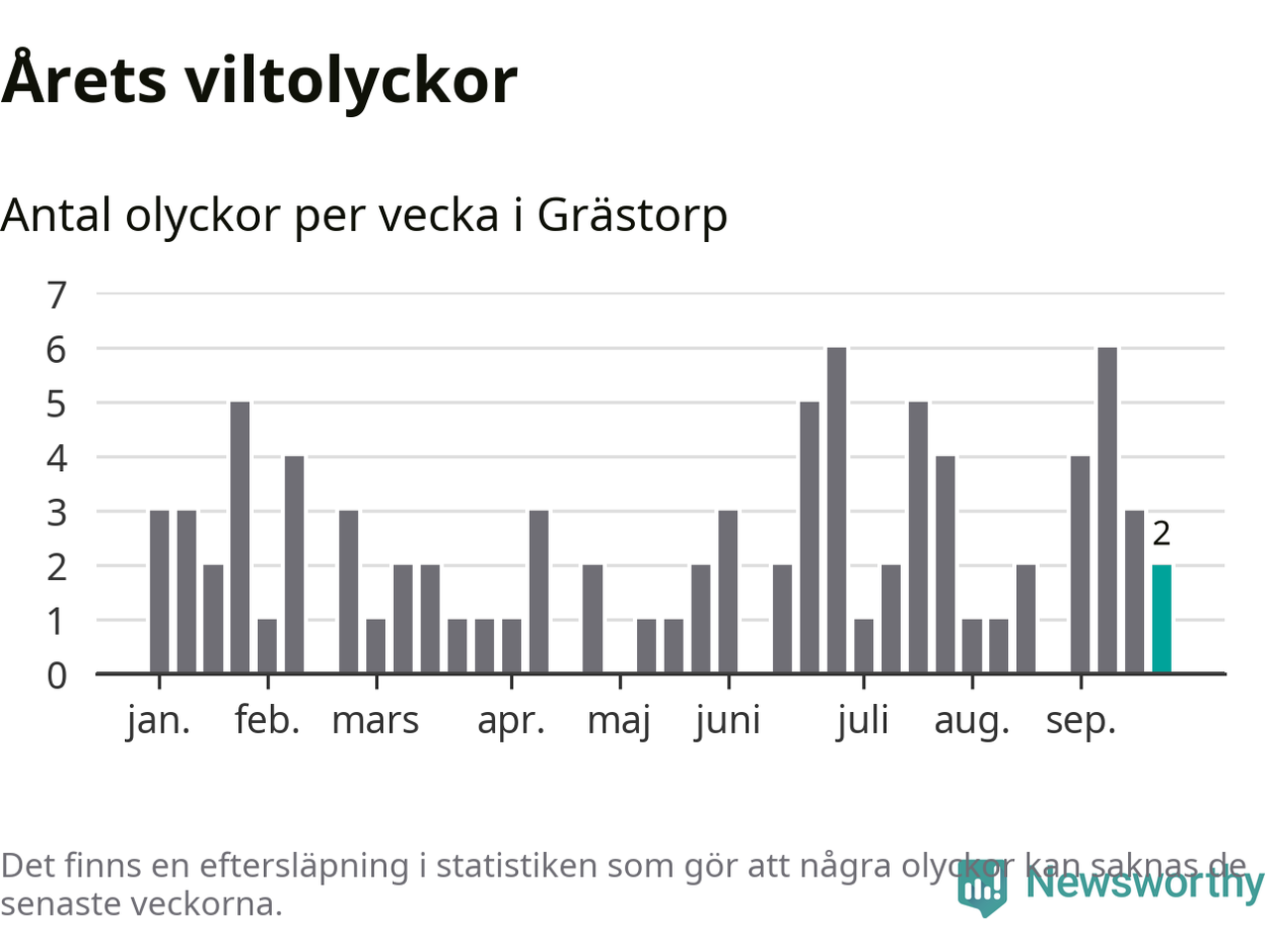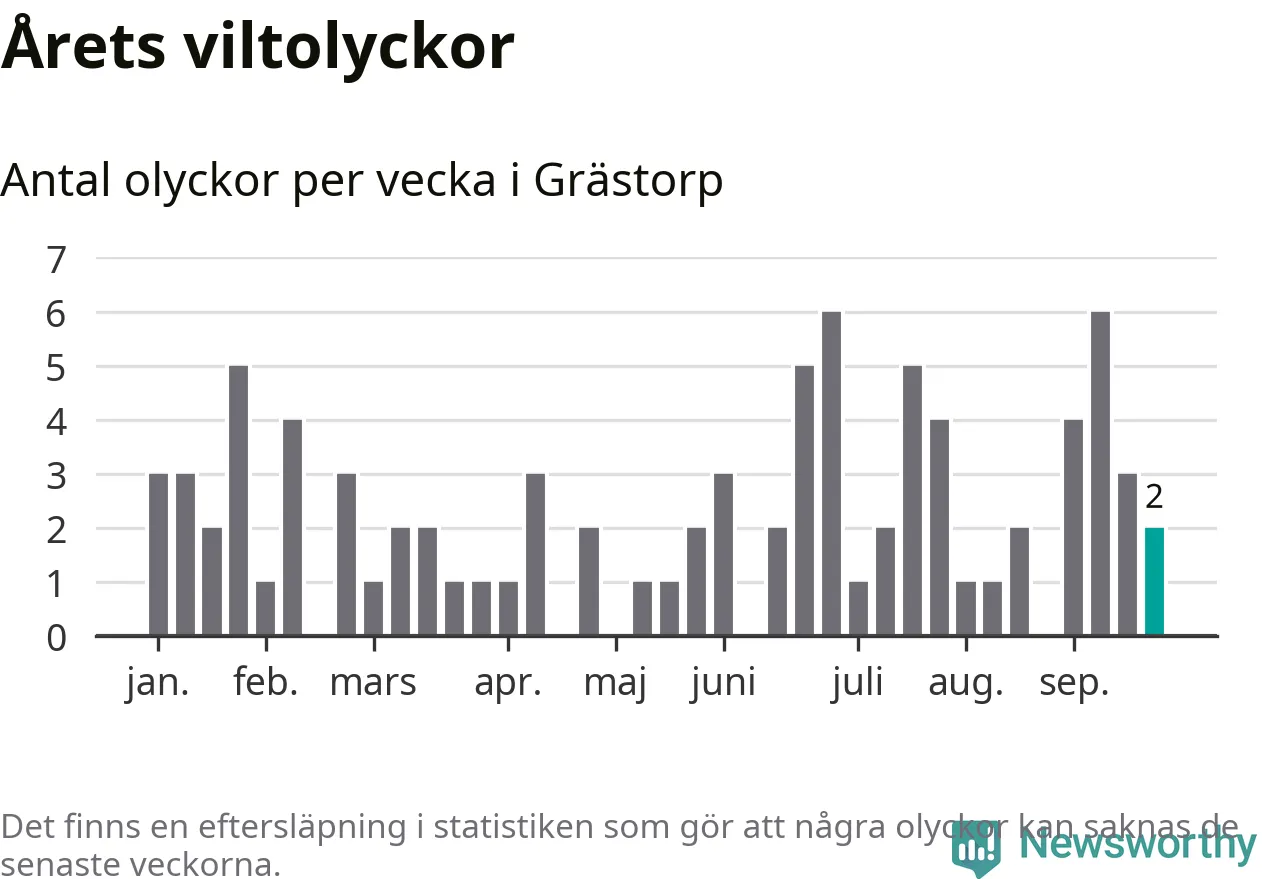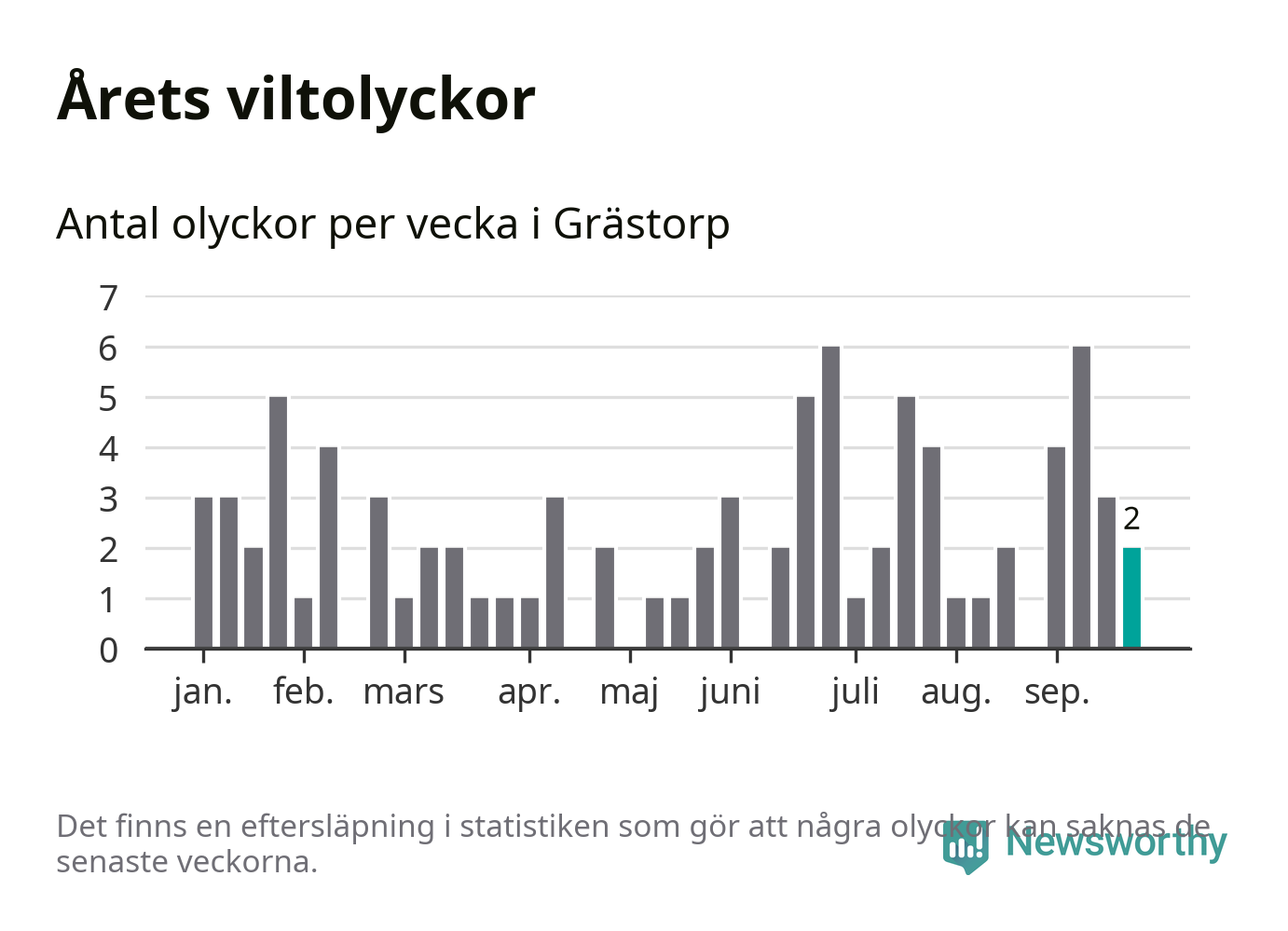 Hittills har två viltolyckor rapporterats in i Grästorps kommun från vecka 39. Se listan här.