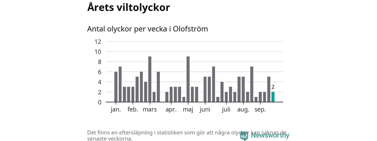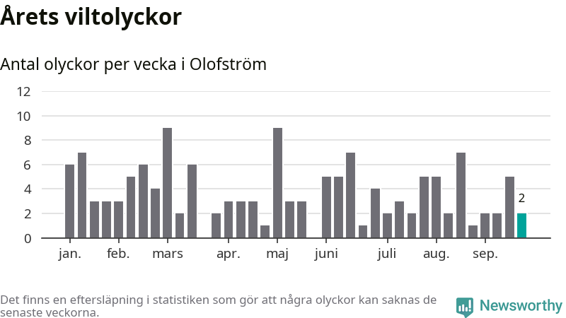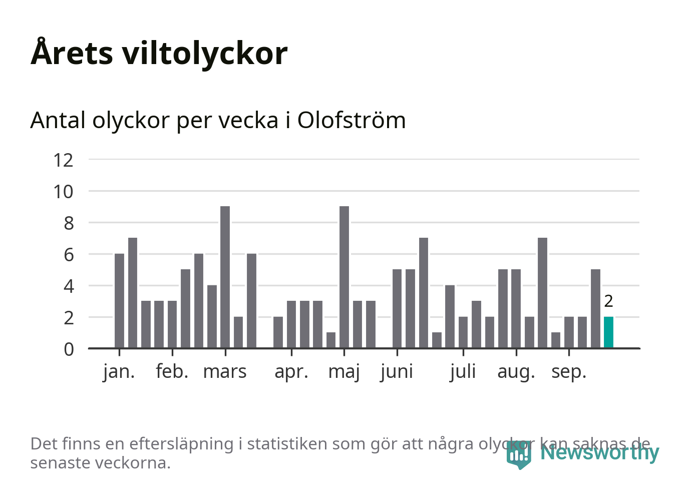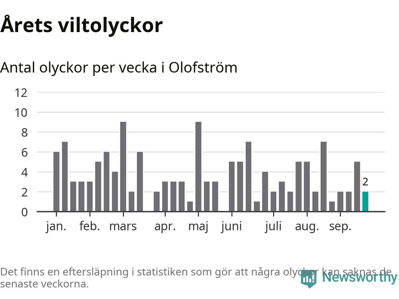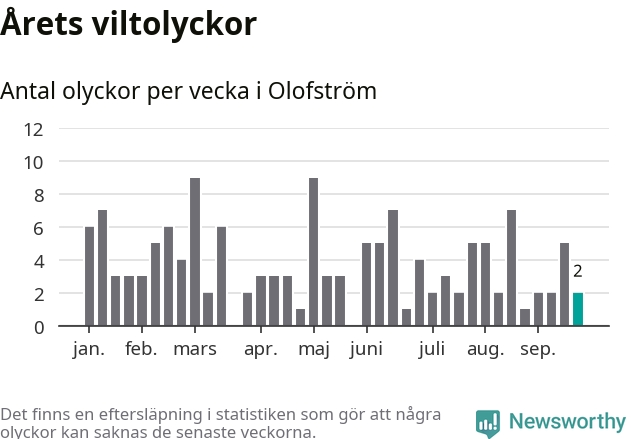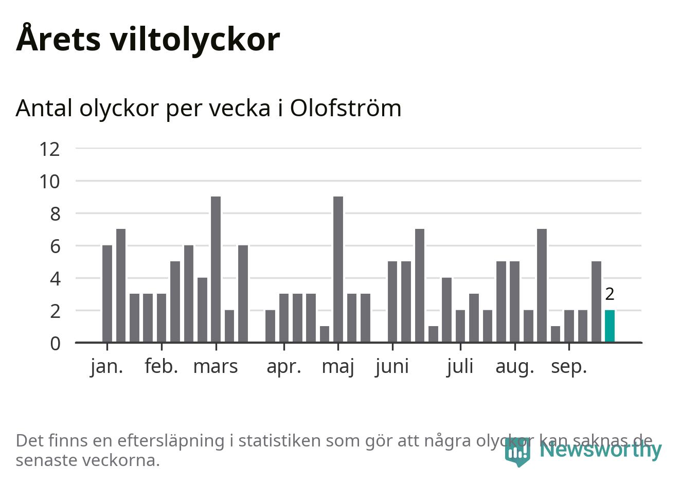 Hittills har två viltolyckor rapporterats in i Olofströms kommun från vecka 39. Se listan här.