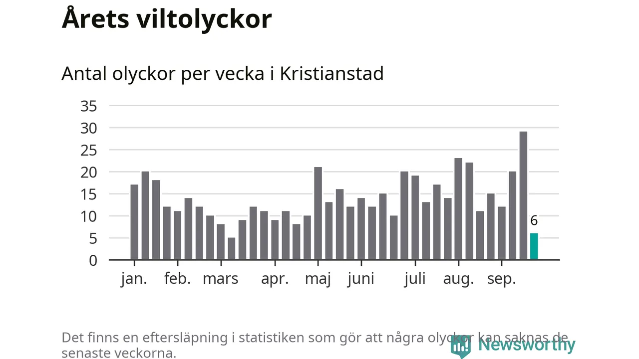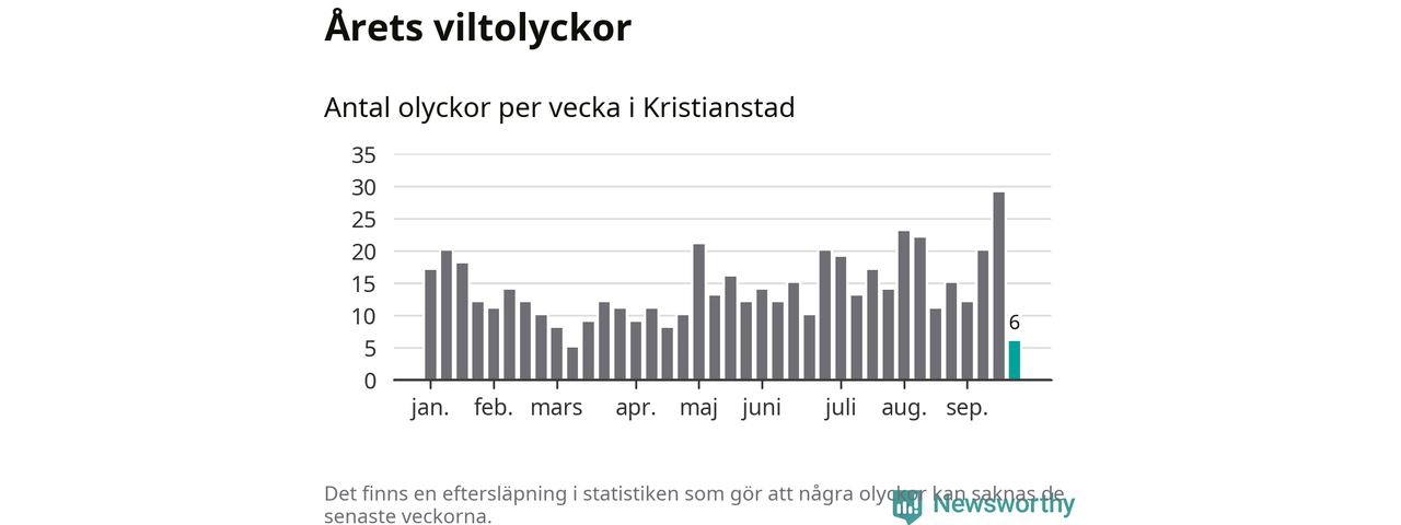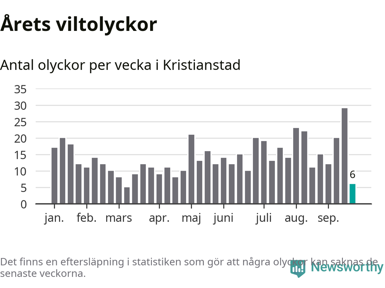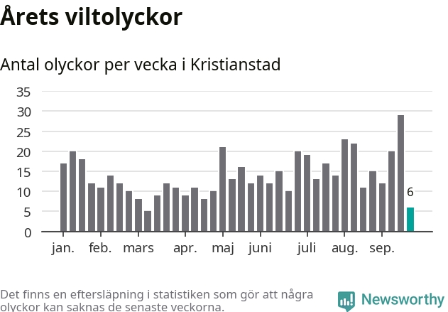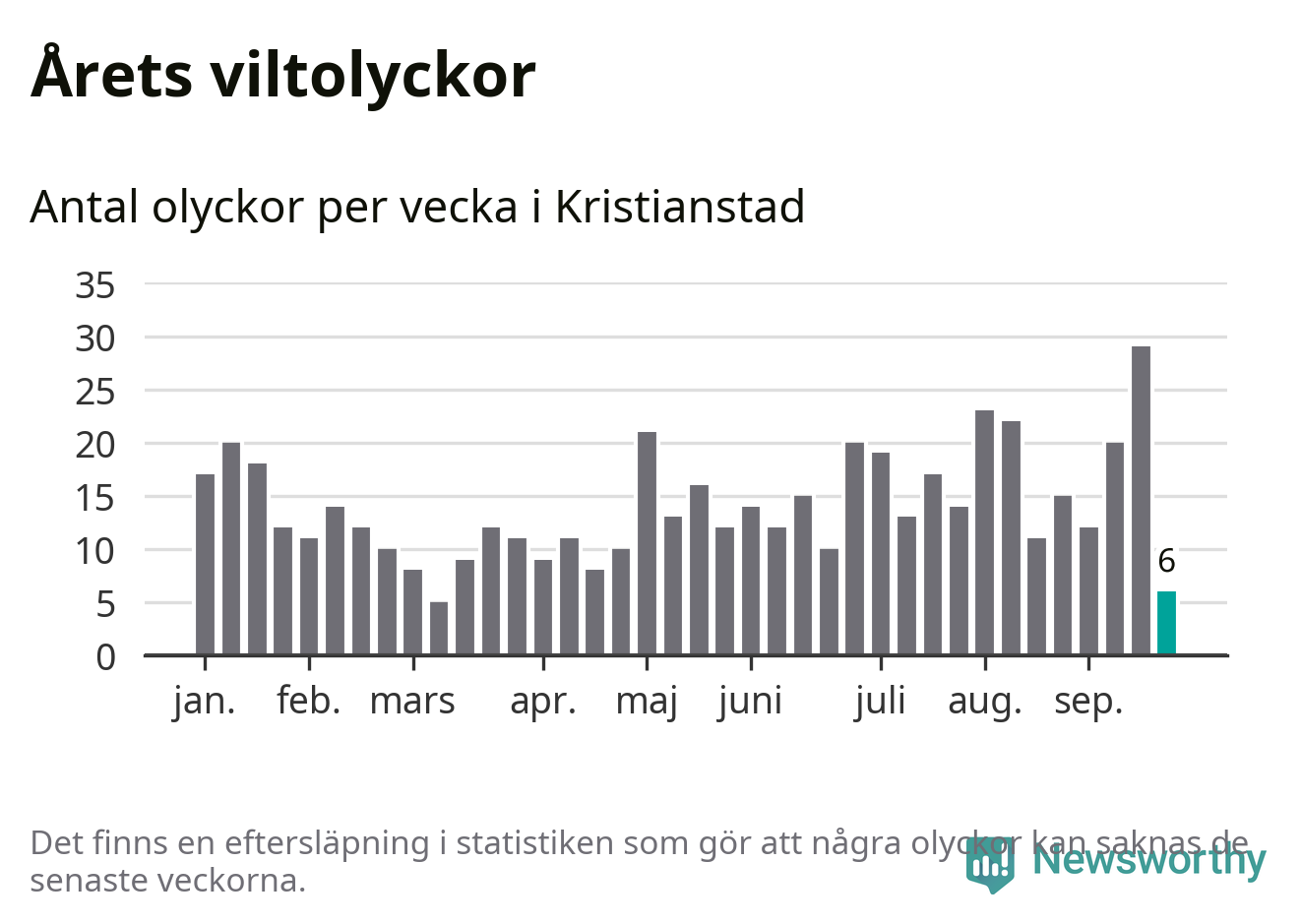 Hittills har sex viltolyckor rapporterats in i Kristianstads kommun från vecka 39. Se listan här.