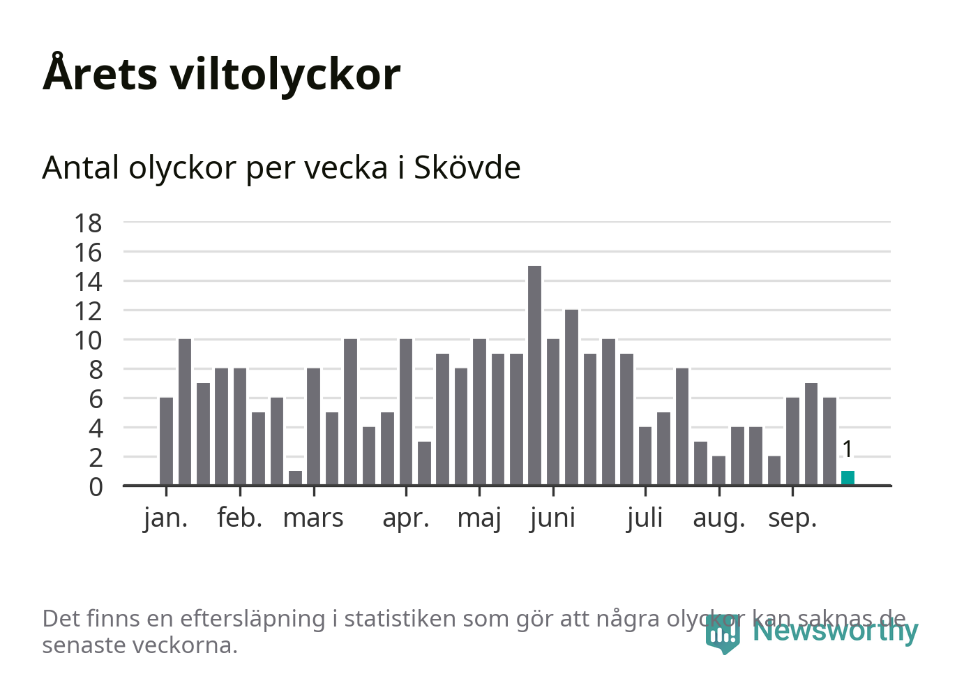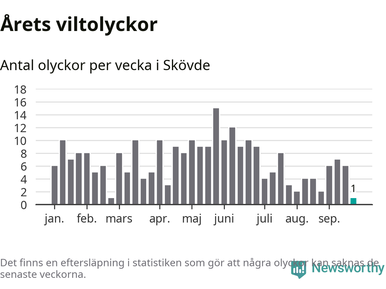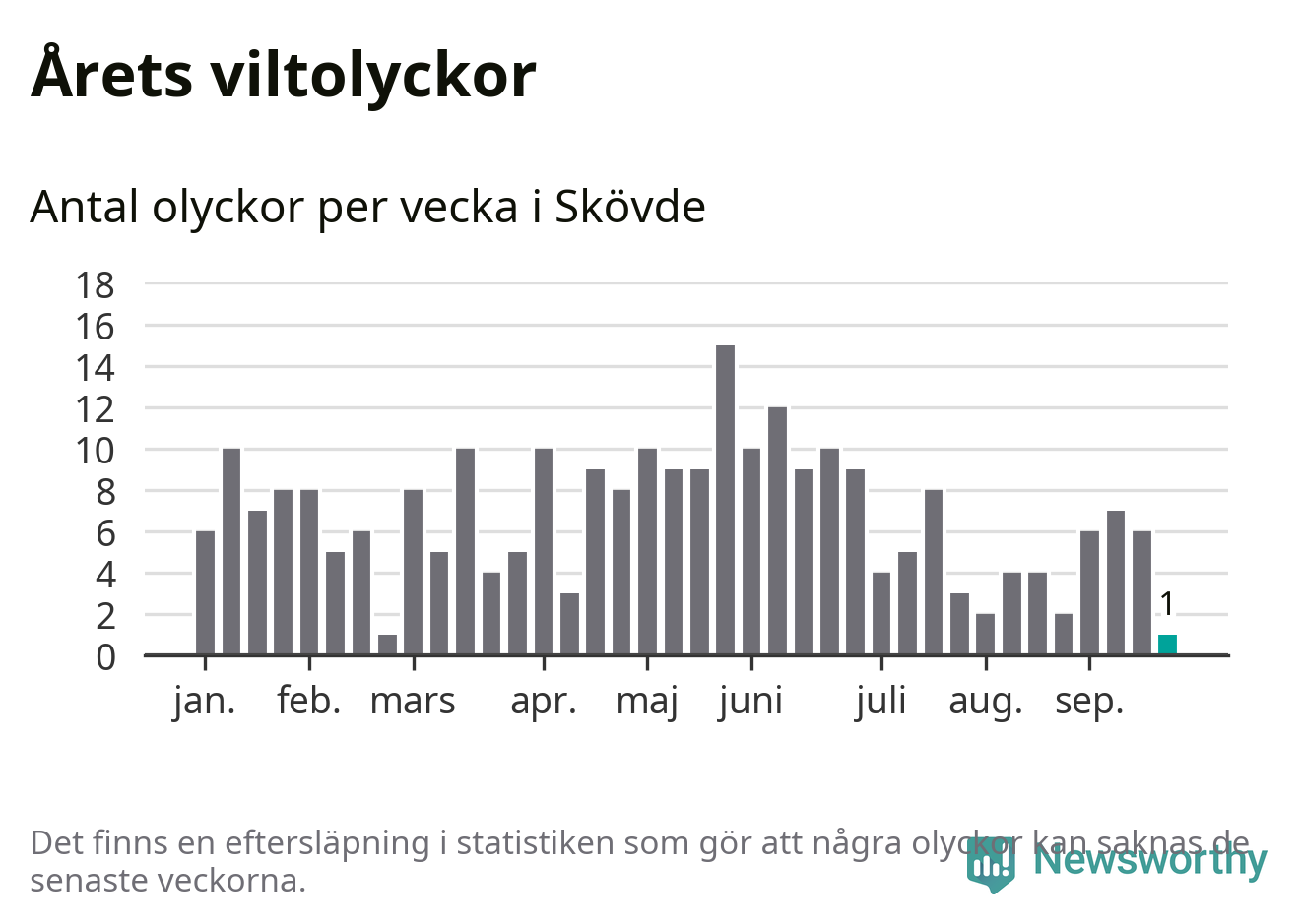 Från förra veckan (vecka 39) har hittills en viltolycka rapporterats in i Skövde kommun.