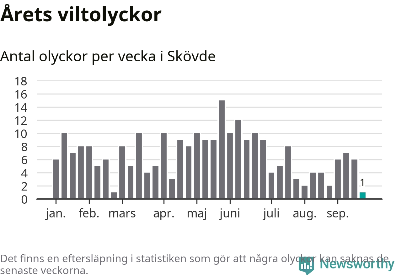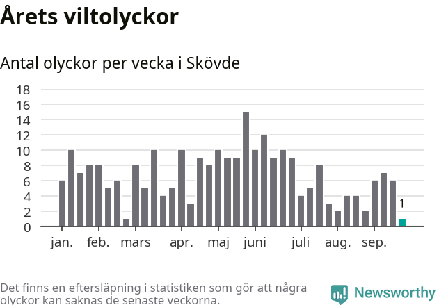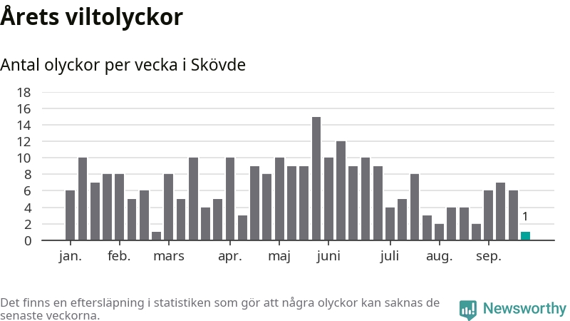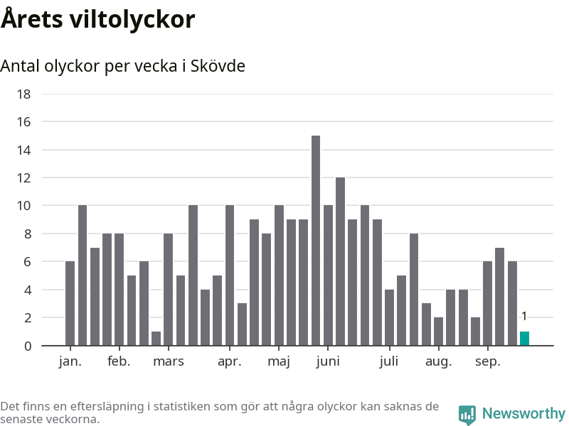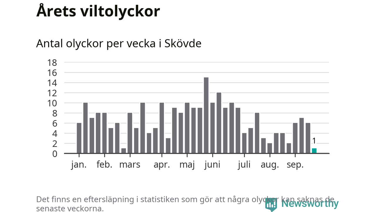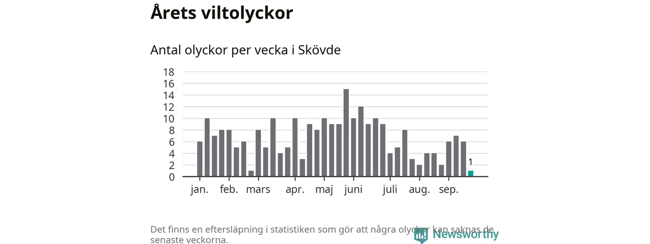 Från förra veckan (vecka 39) har hittills en viltolycka rapporterats in i Skövde kommun.