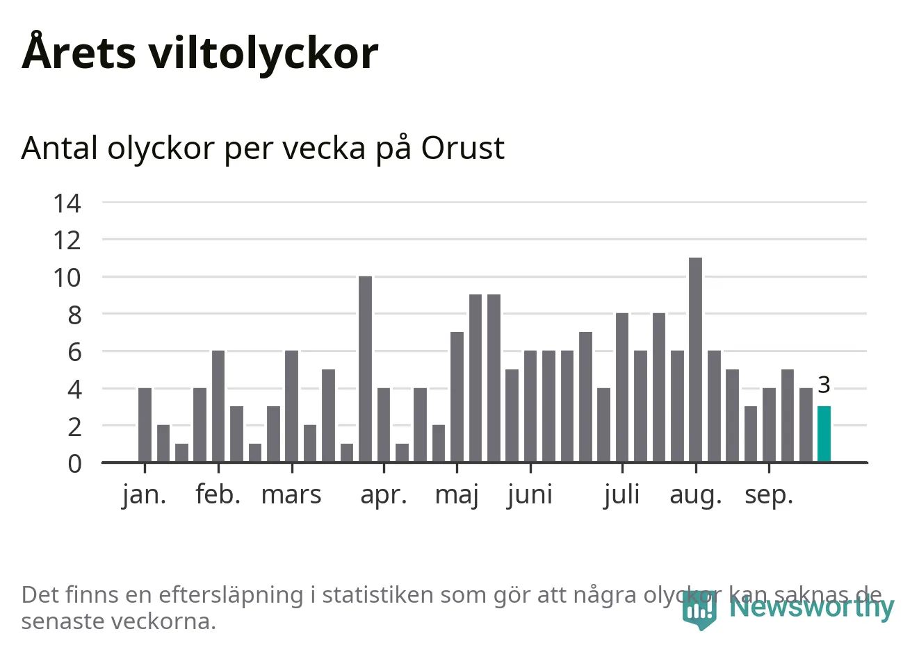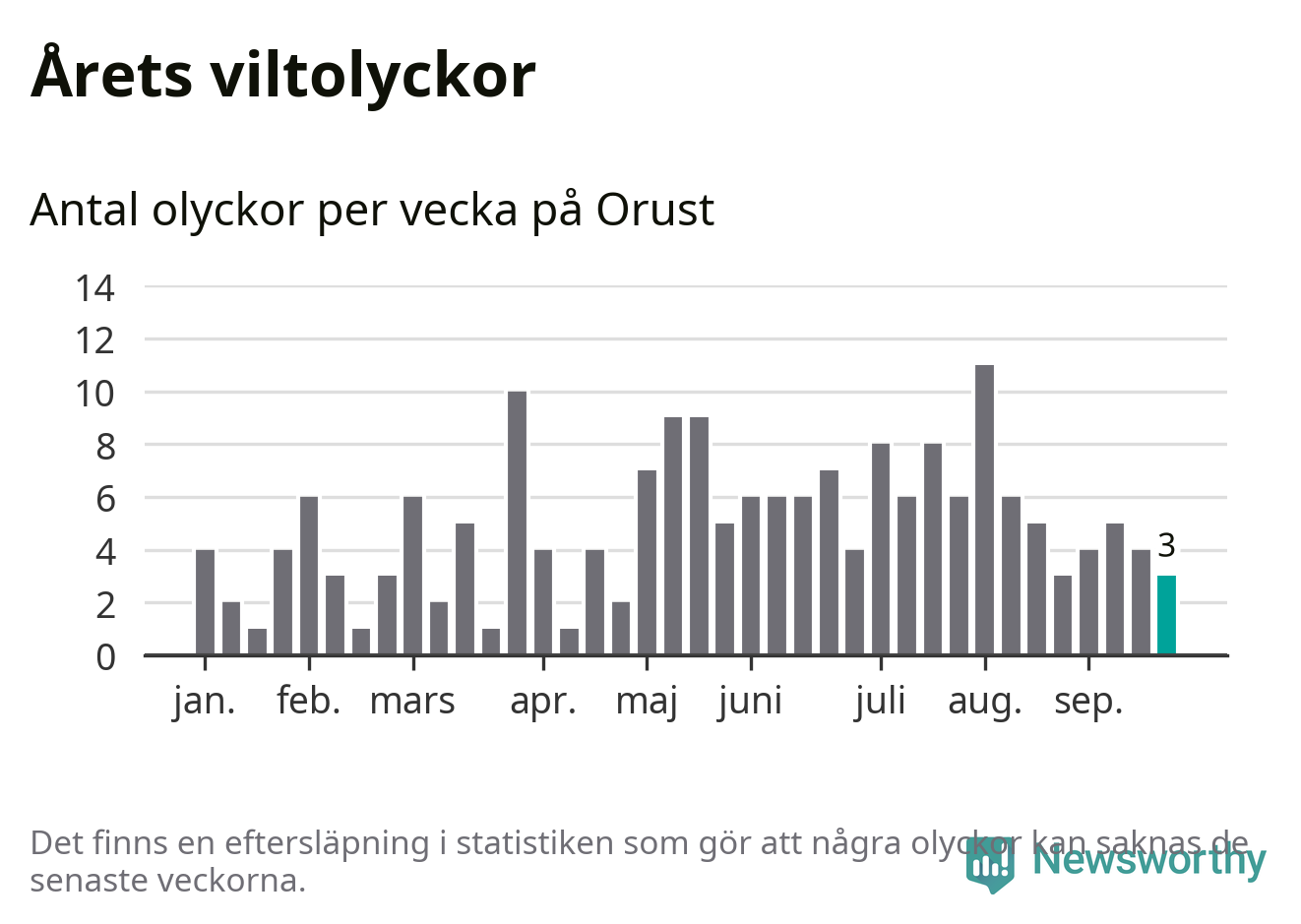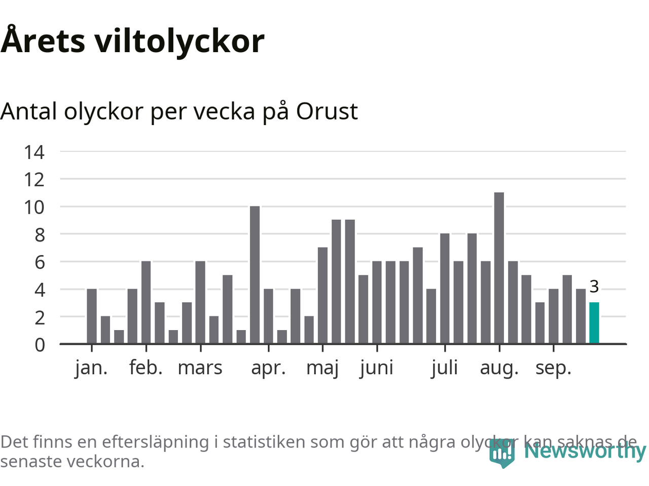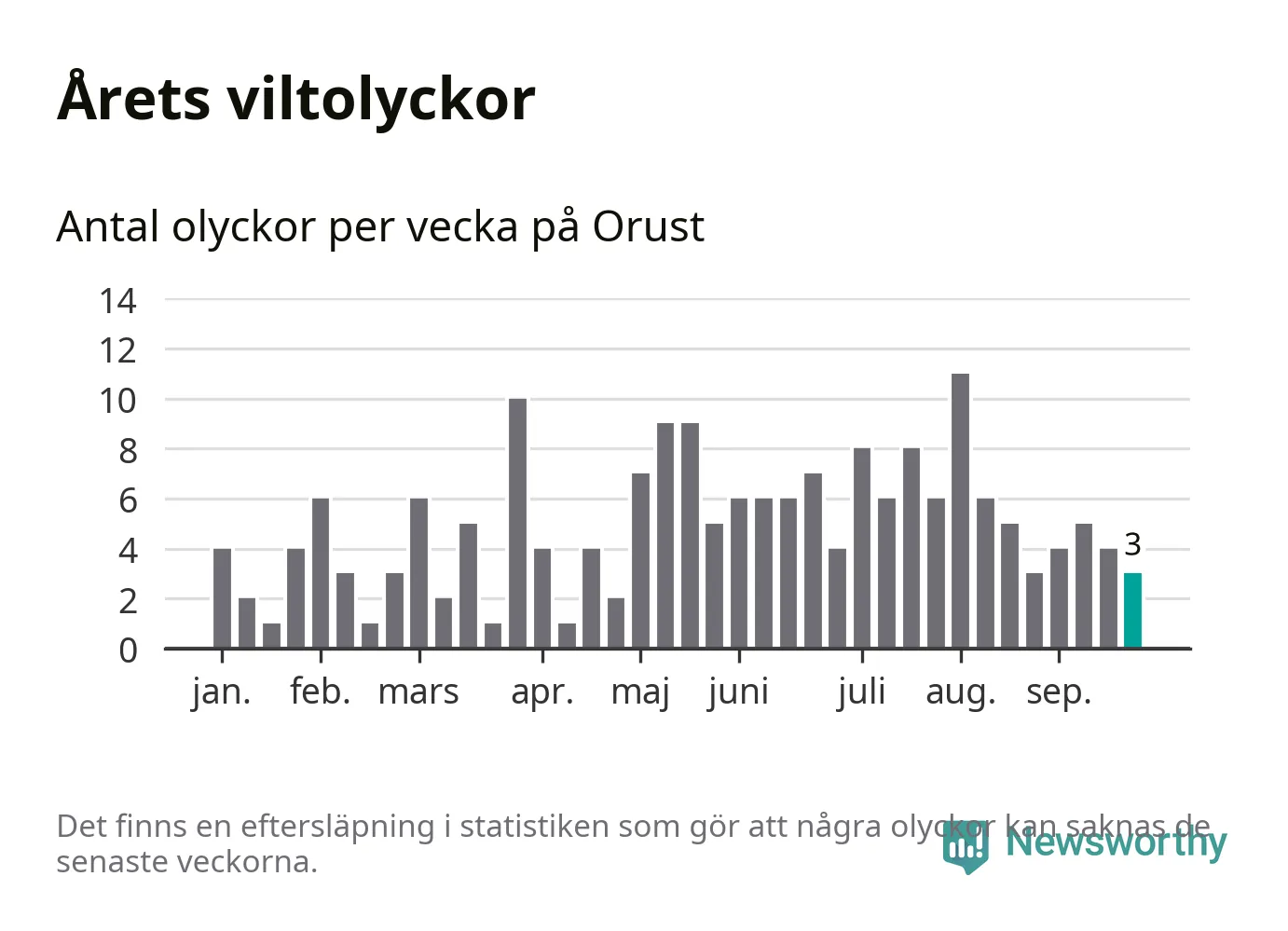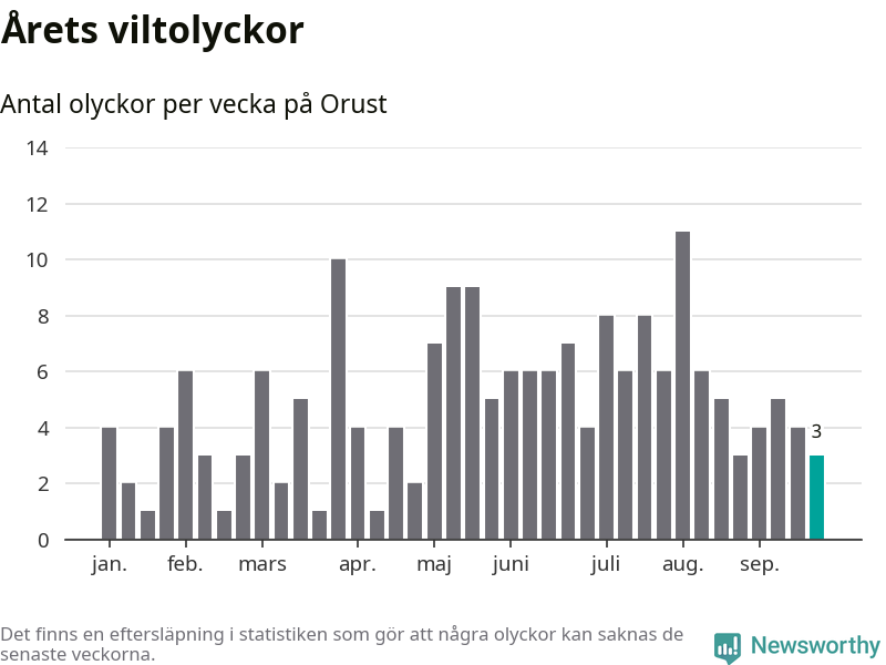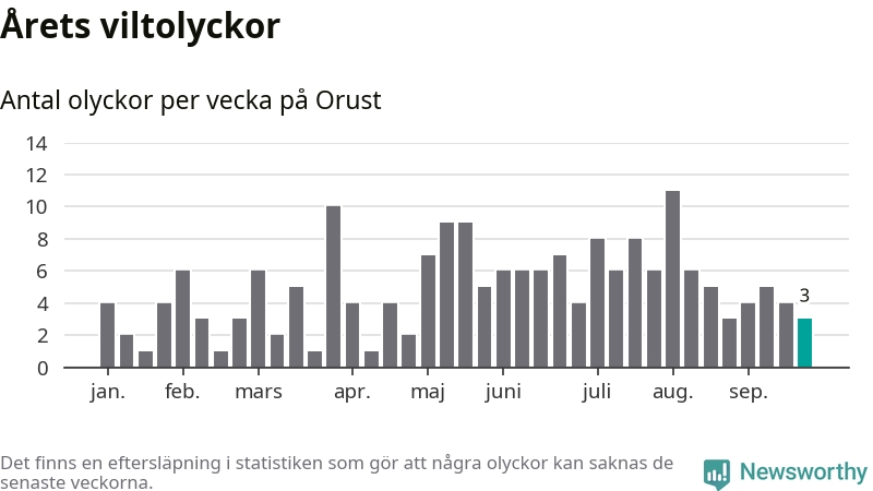 Totalt det här året har det inträffat 189 viltolyckor i kommunen. Det är mindre än genomsnittet för motsvarande period (omkring 222) de senaste tio åren.