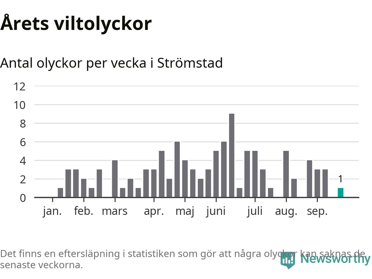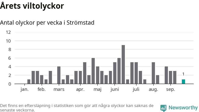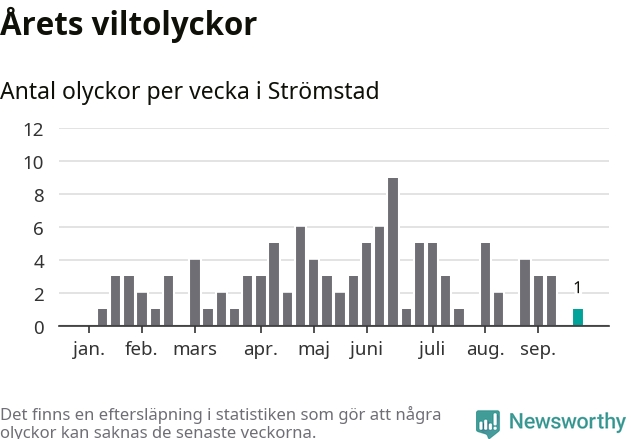 Totalt det här året har det inträffat 107 viltolyckor i kommunen. Det är mer än genomsnittet för motsvarande period (omkring 93) de senaste tio åren.