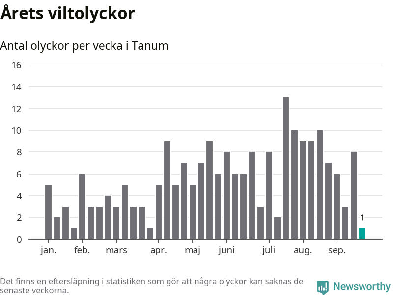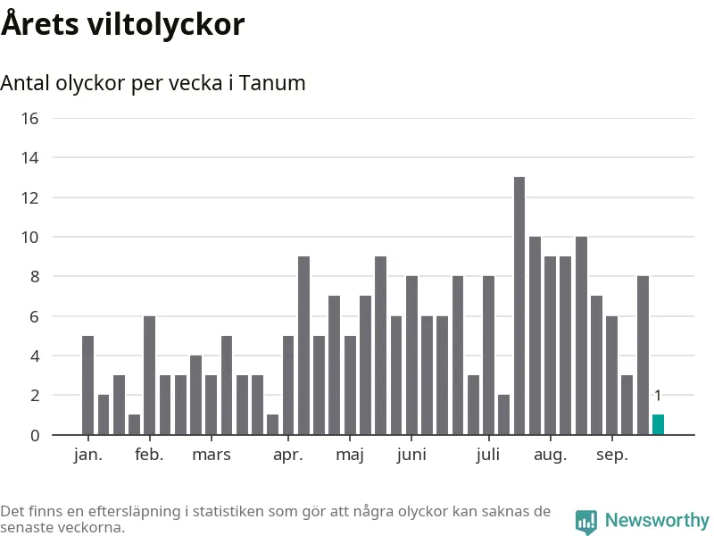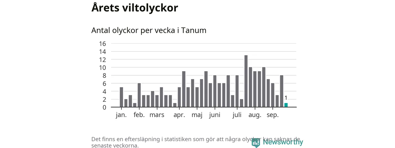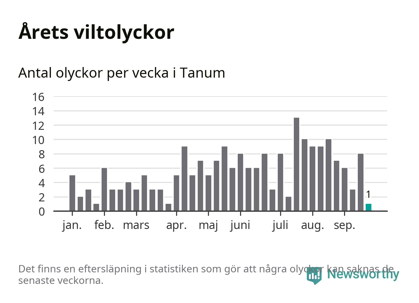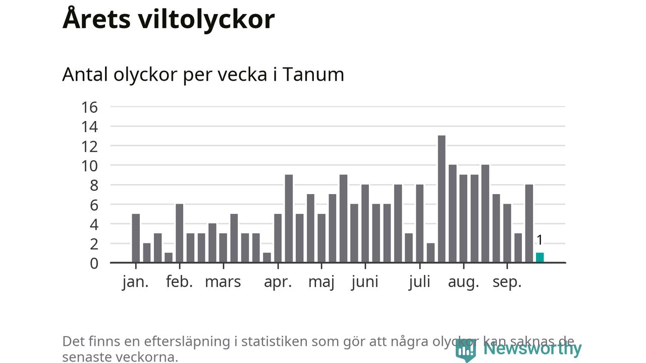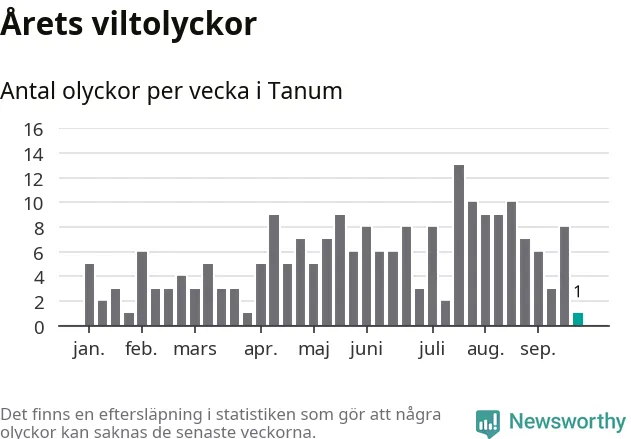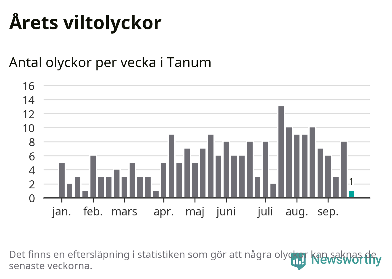 Från förra veckan (vecka 39) har hittills en viltolycka rapporterats in i Tanums kommun.