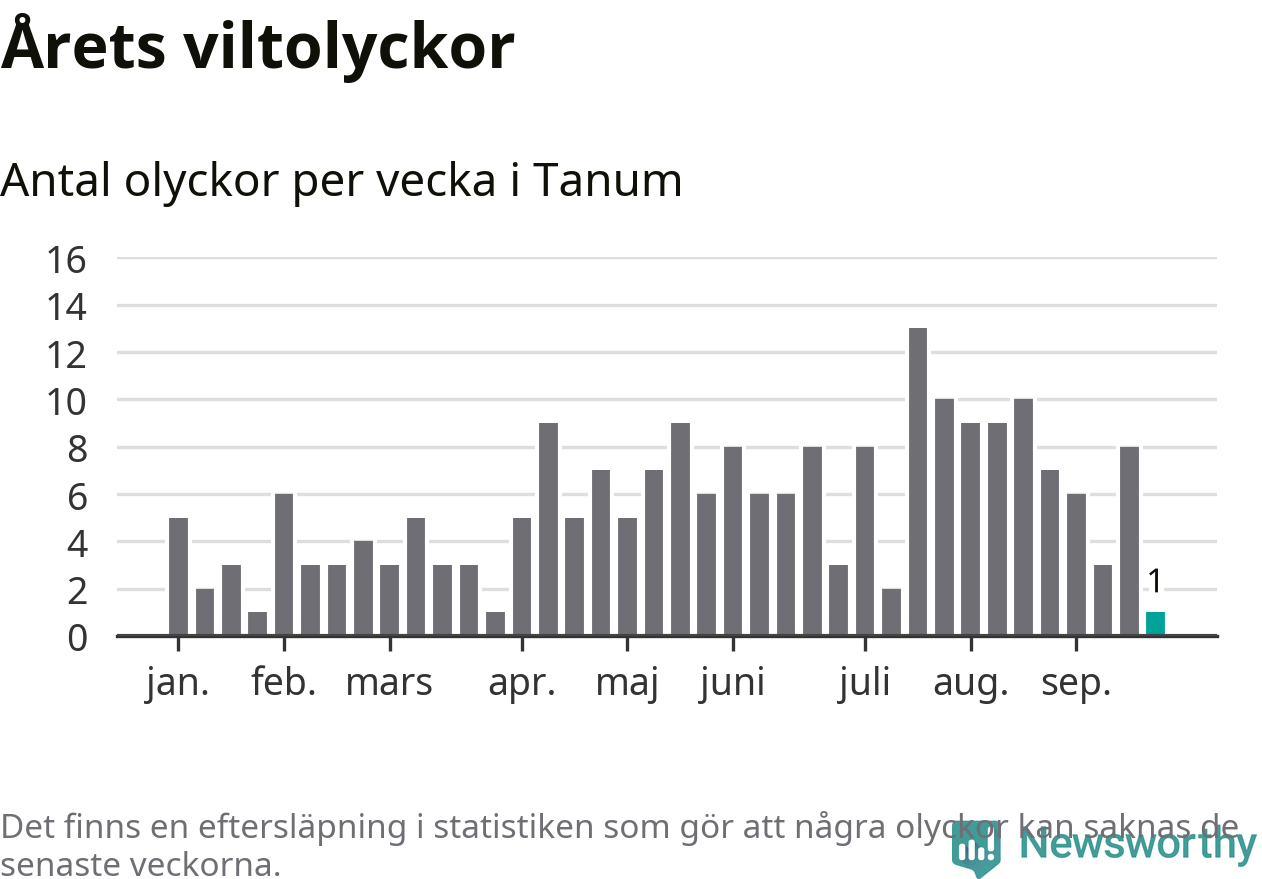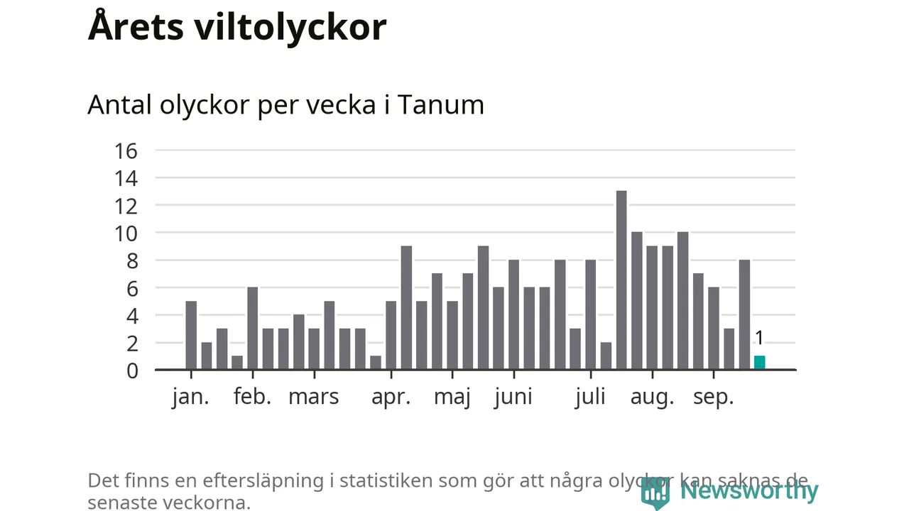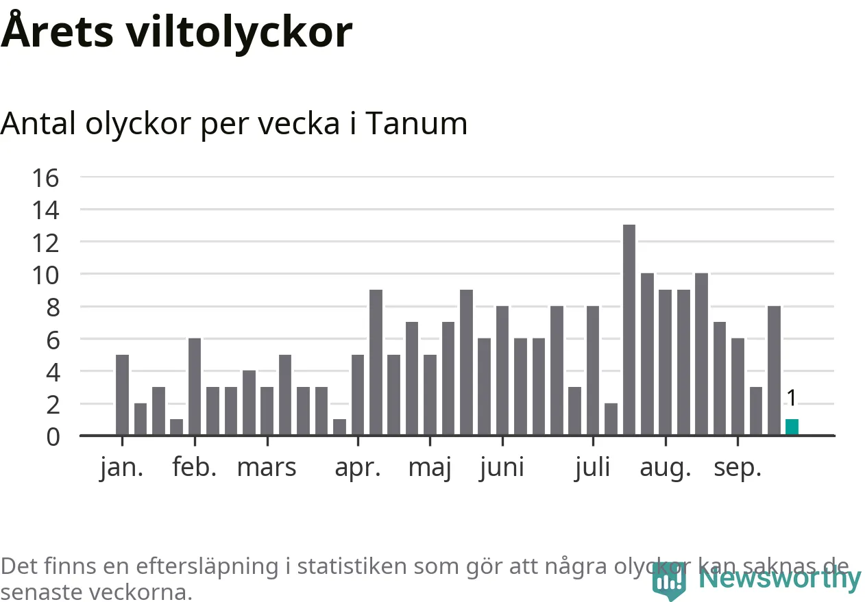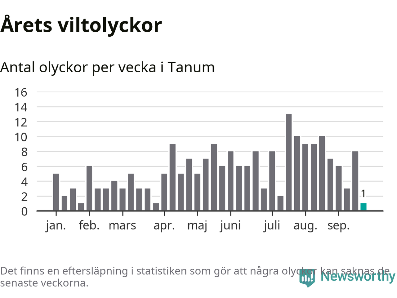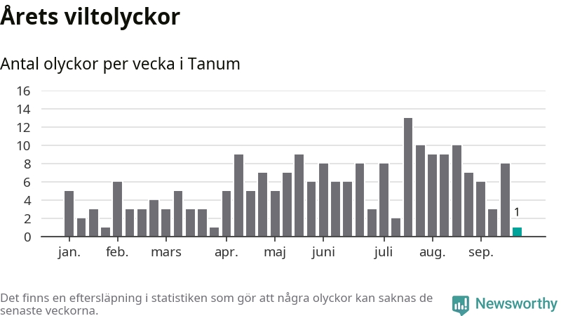 Från förra veckan (vecka 39) har hittills en viltolycka rapporterats in i Tanums kommun.