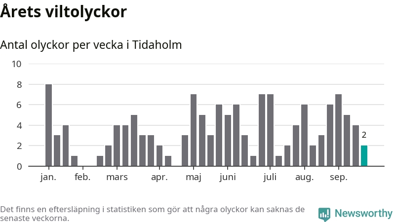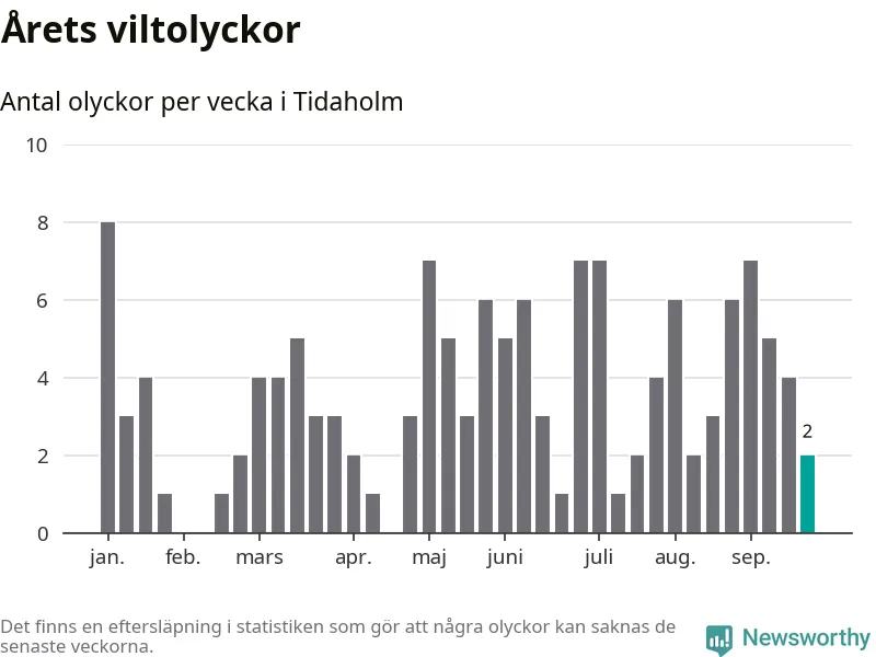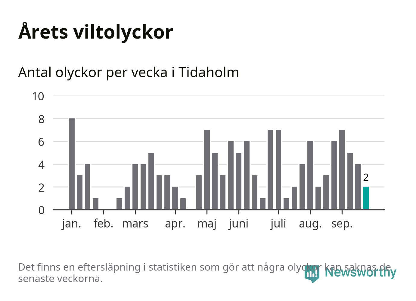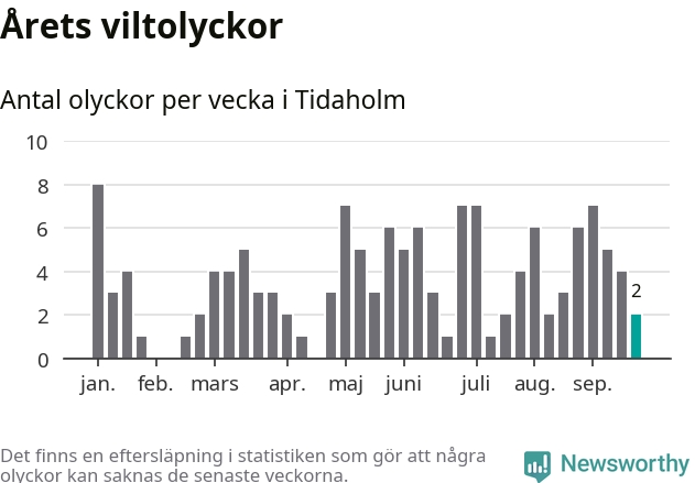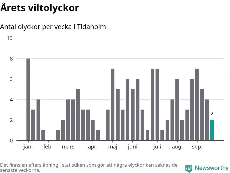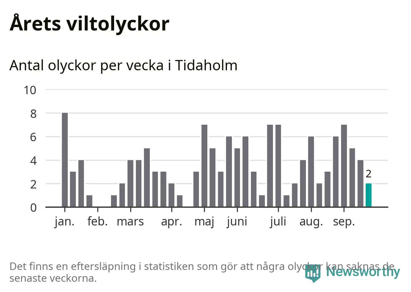 Hittills har två viltolyckor rapporterats in i Tidaholms kommun från vecka 39. Se listan här.