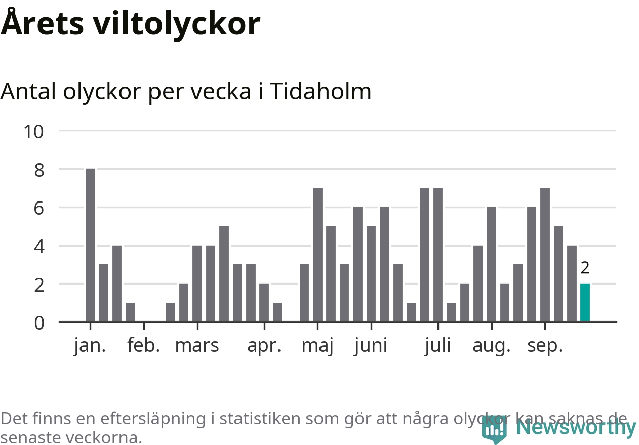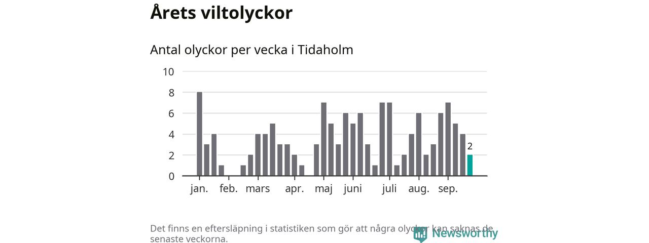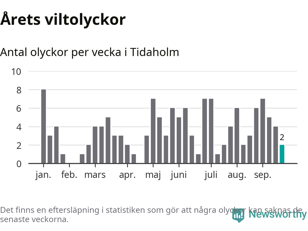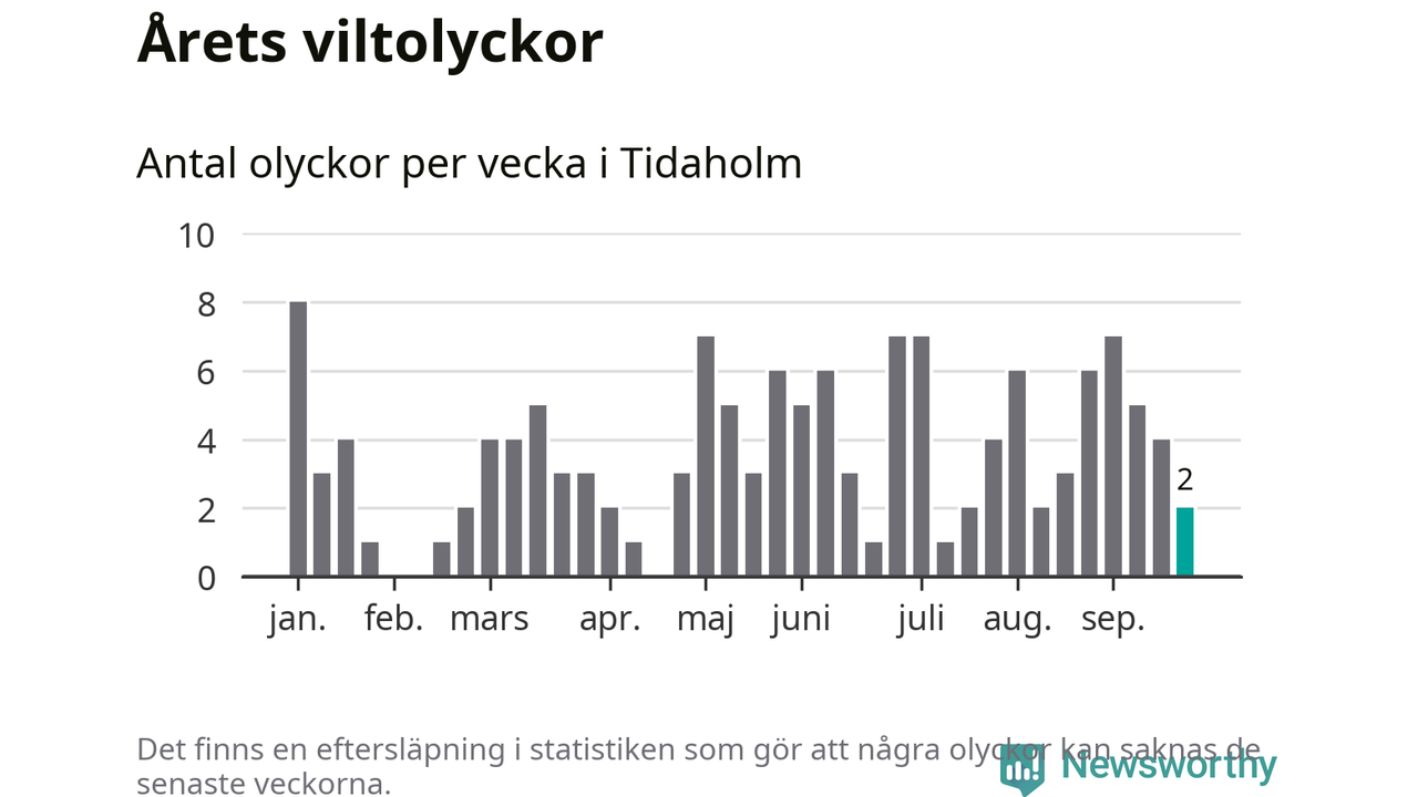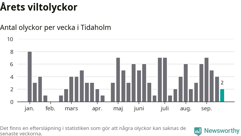 Hittills har två viltolyckor rapporterats in i Tidaholms kommun från vecka 39. Se listan här.