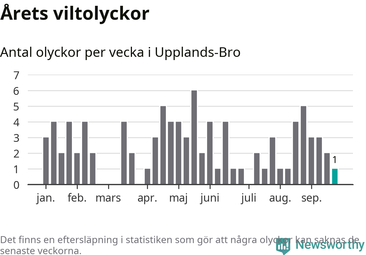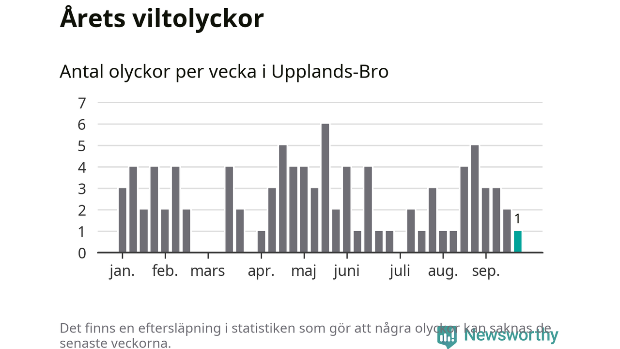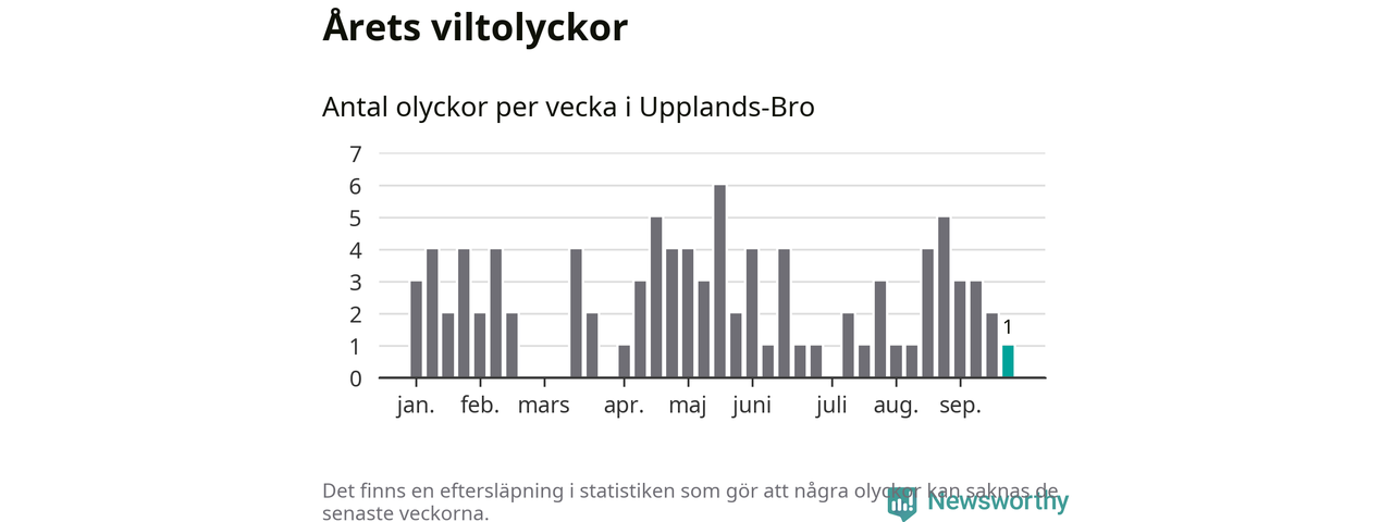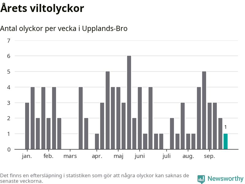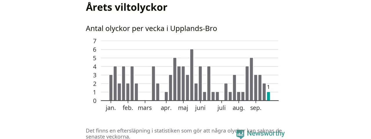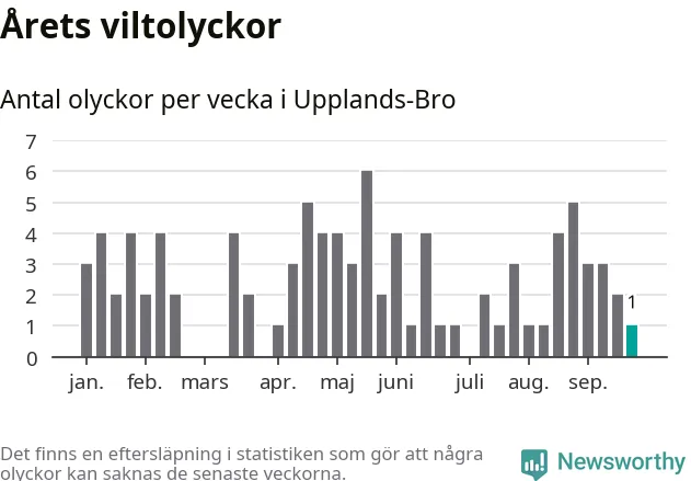 Från förra veckan (vecka 39) har hittills en viltolycka rapporterats in i Upplands-Bro kommun.