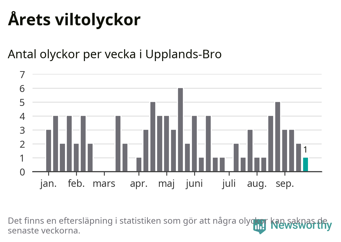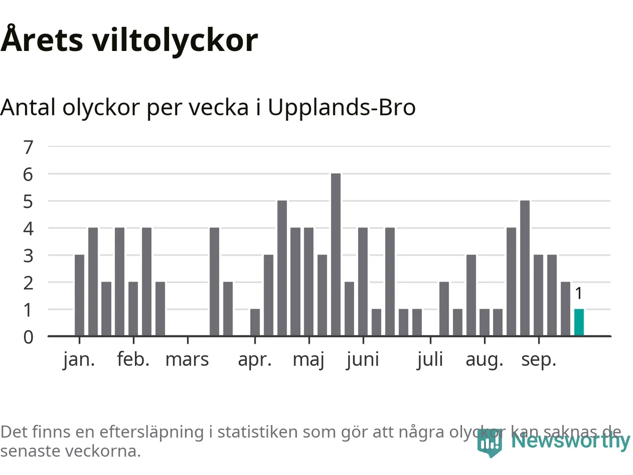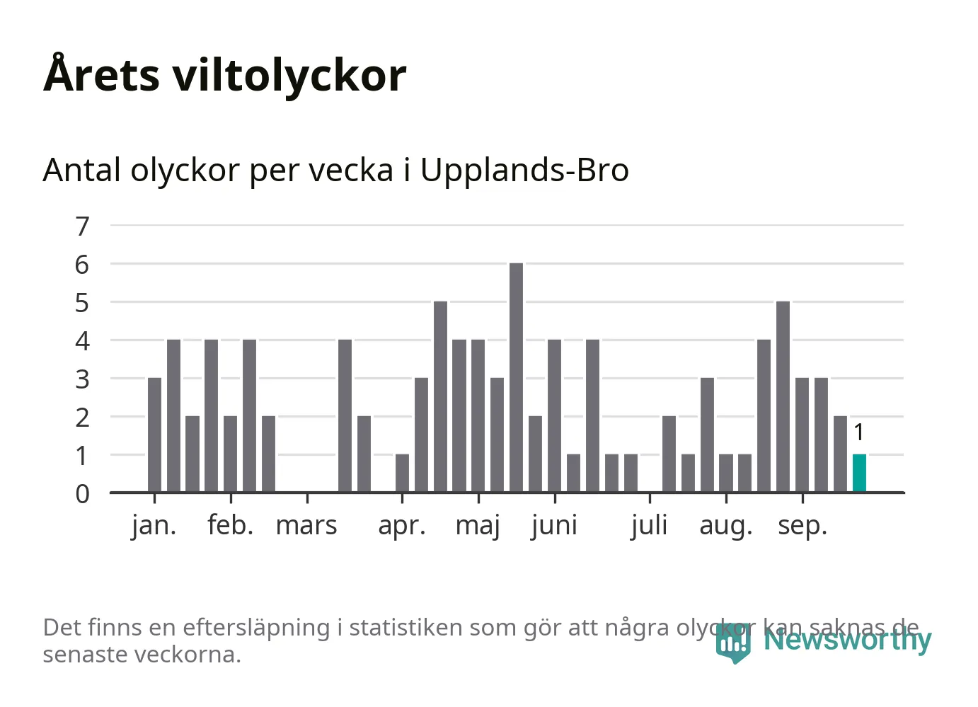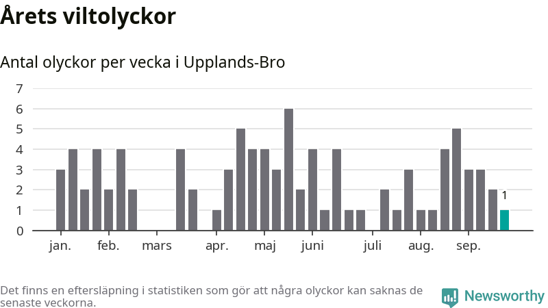 Från förra veckan (vecka 39) har hittills en viltolycka rapporterats in i Upplands-Bro kommun.