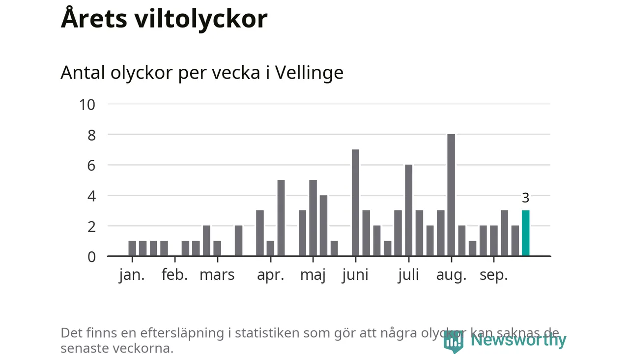 Totalt det här året har det inträffat 86 viltolyckor i kommunen. Det är mer än genomsnittet för motsvarande period (omkring 74) de senaste tio åren.