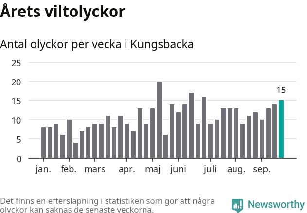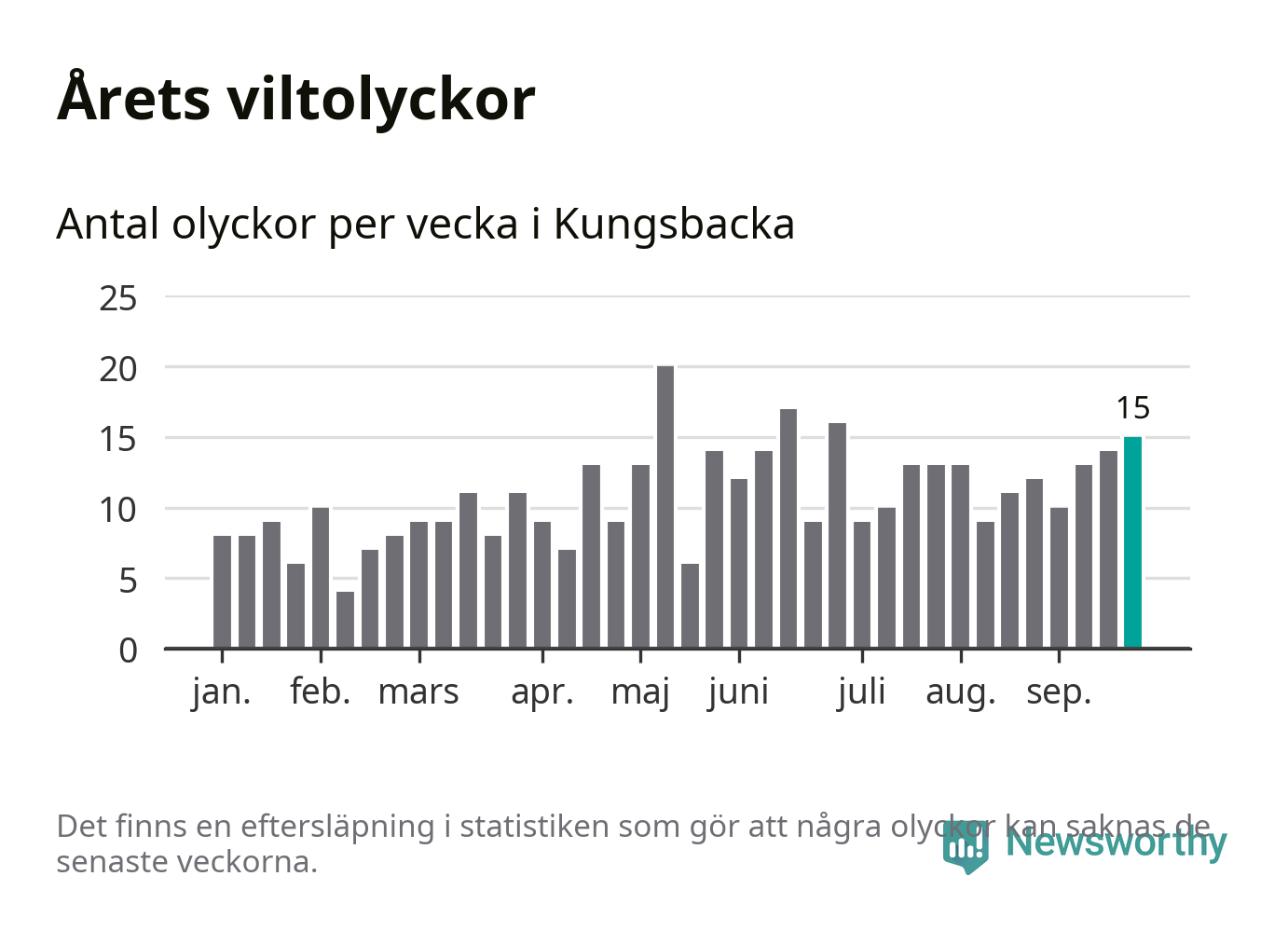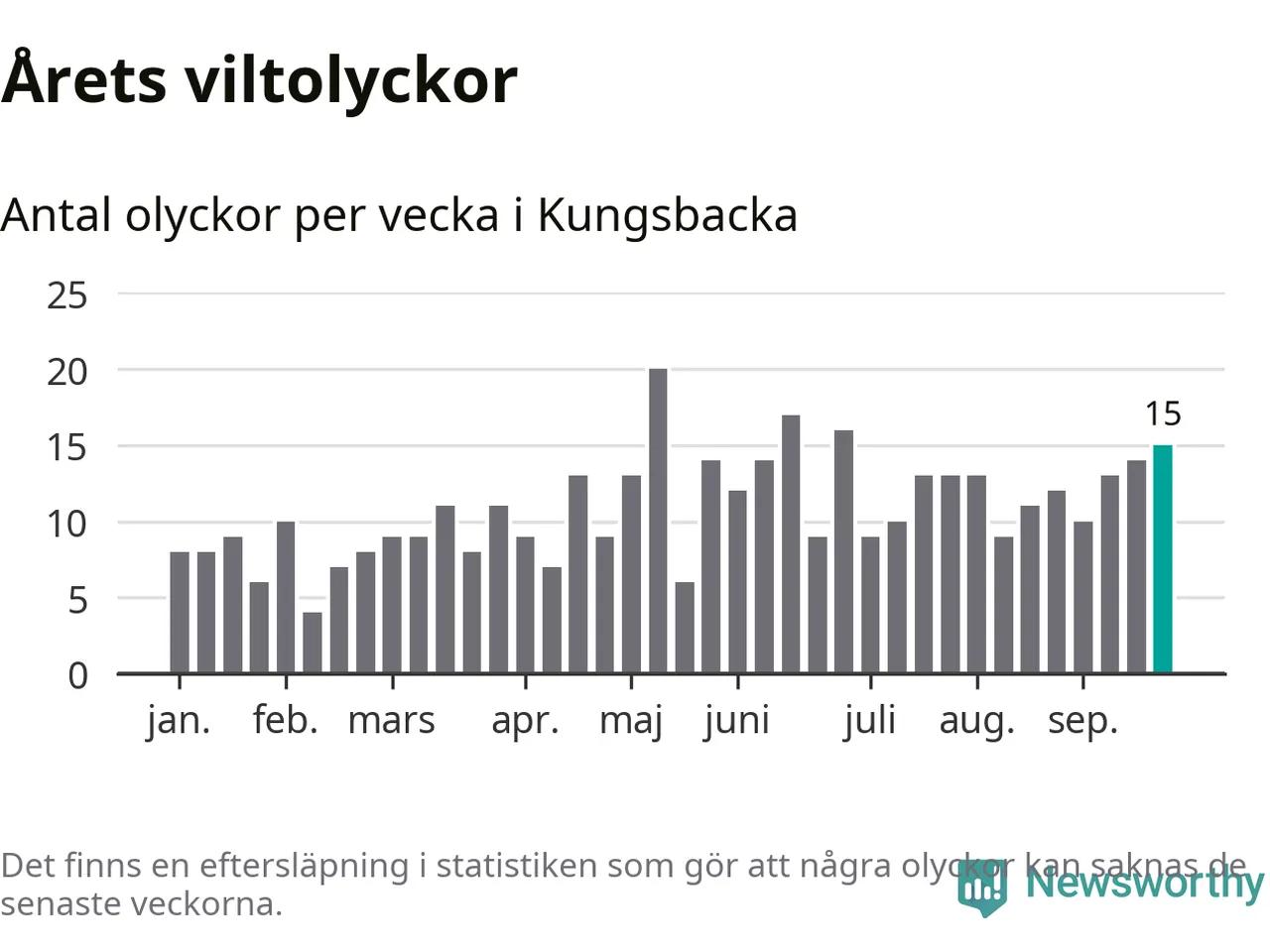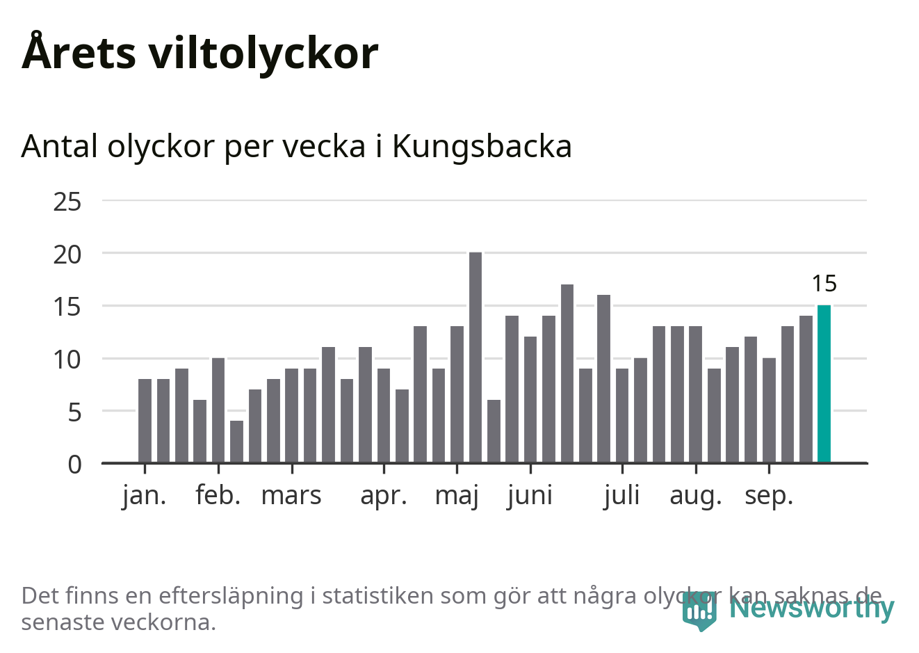 Hittills har 15 viltolyckor rapporterats in i Kungsbacka kommun från vecka 39. Se listan här.