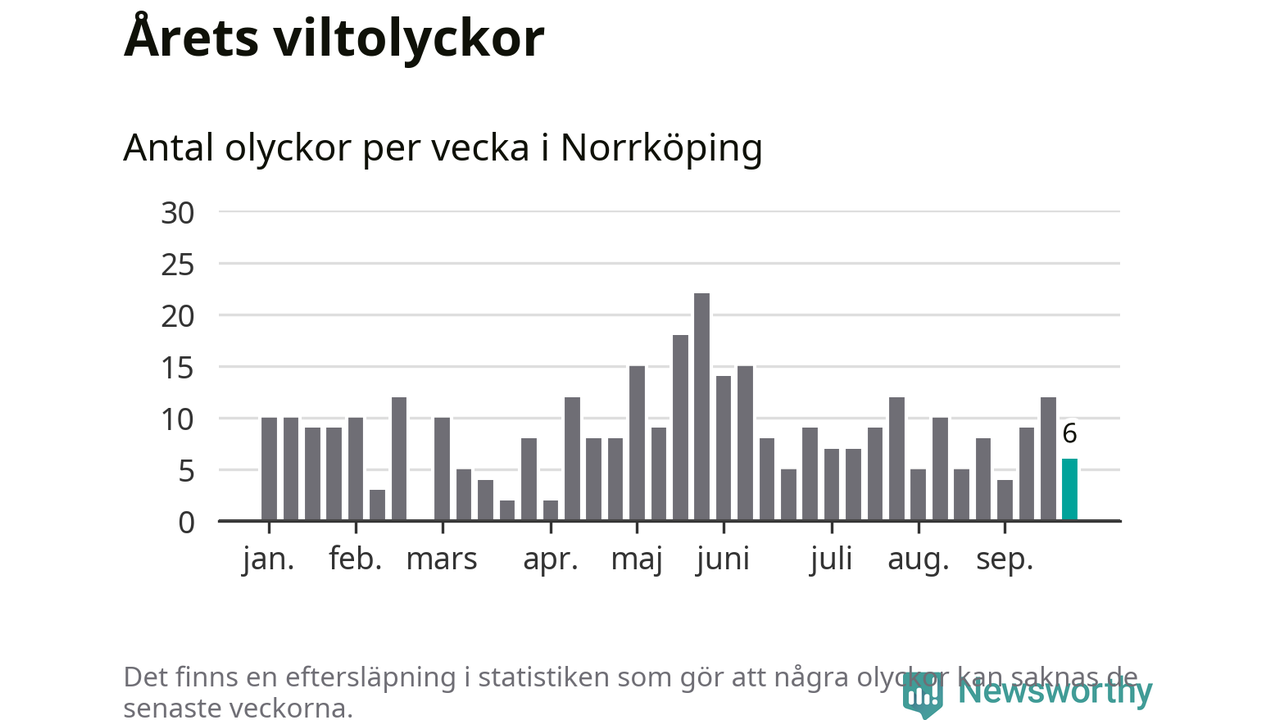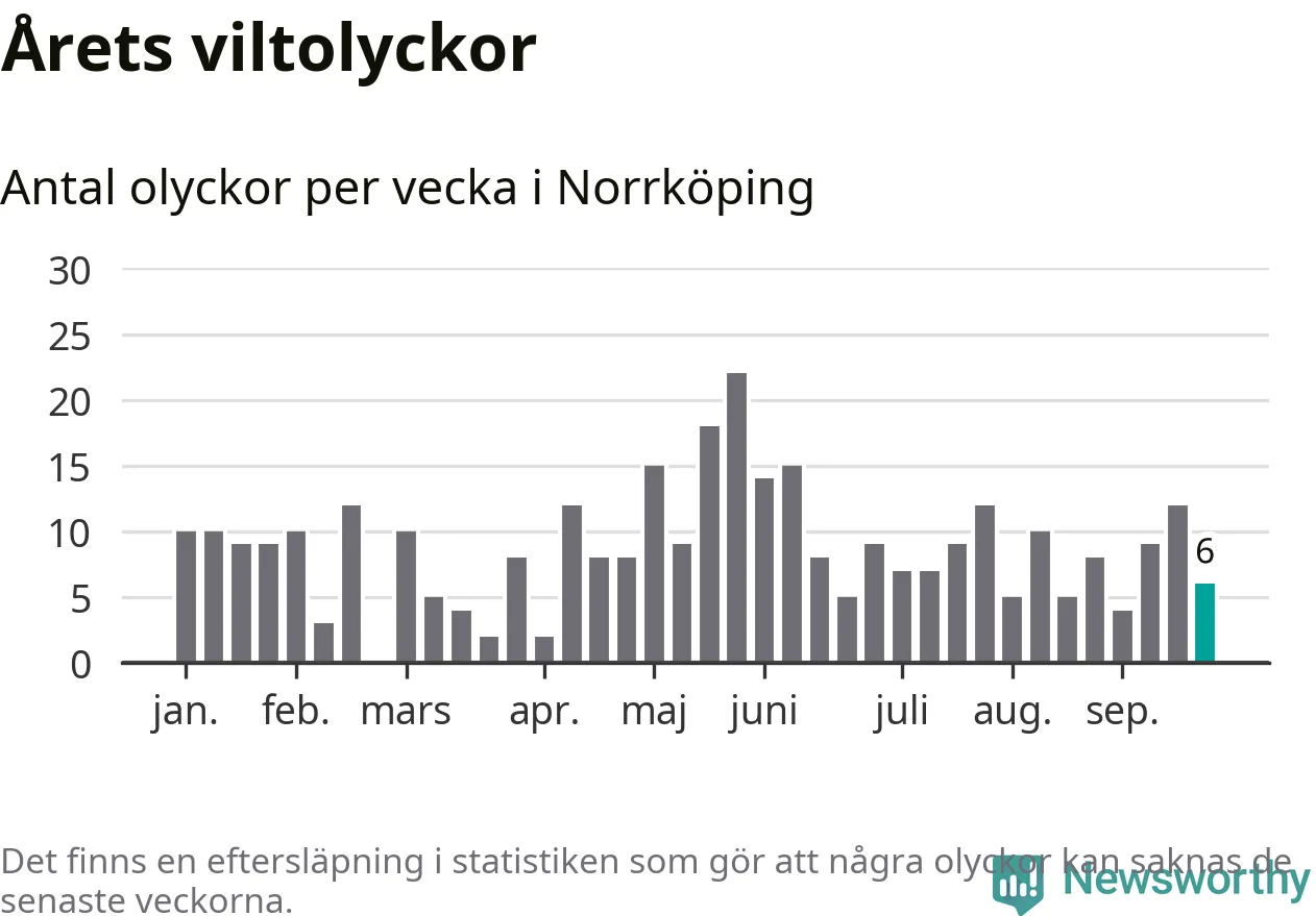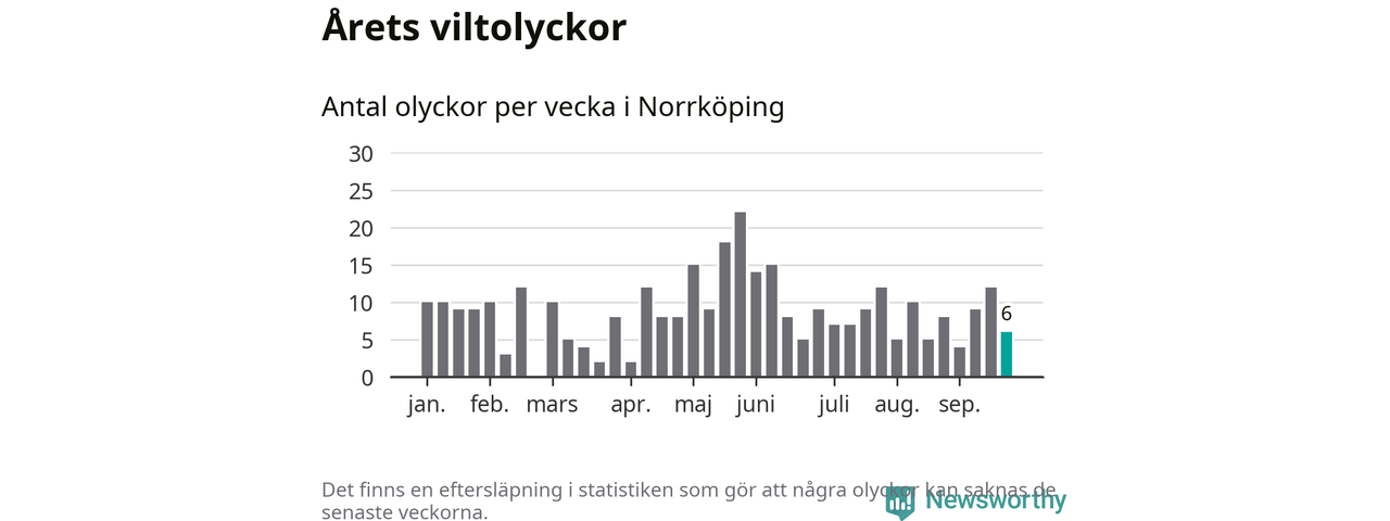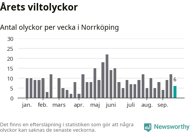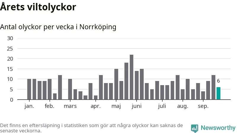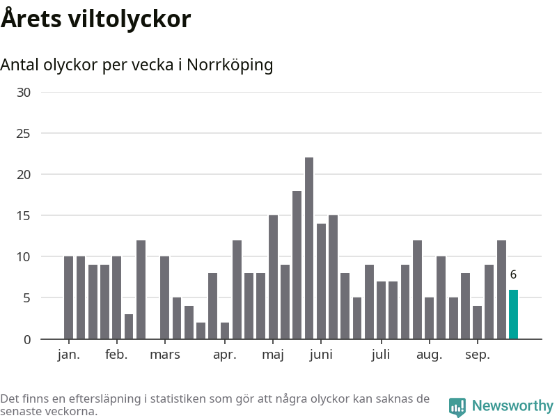Hittills har sex viltolyckor rapporterats in i Norrköpings kommun från vecka 39. Se listan här.