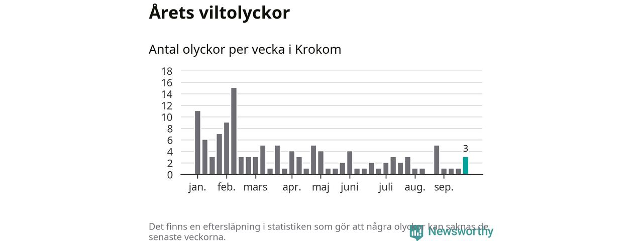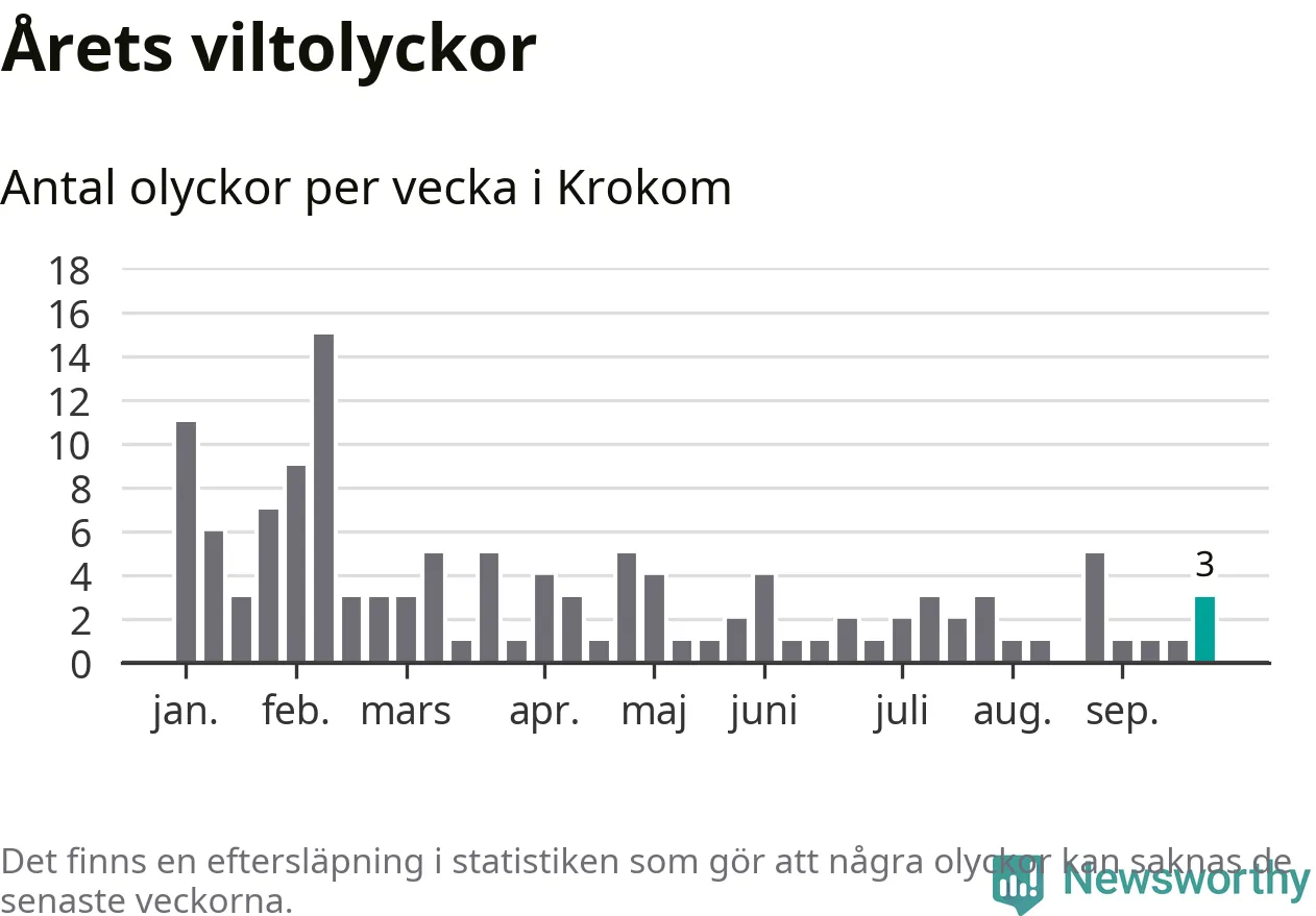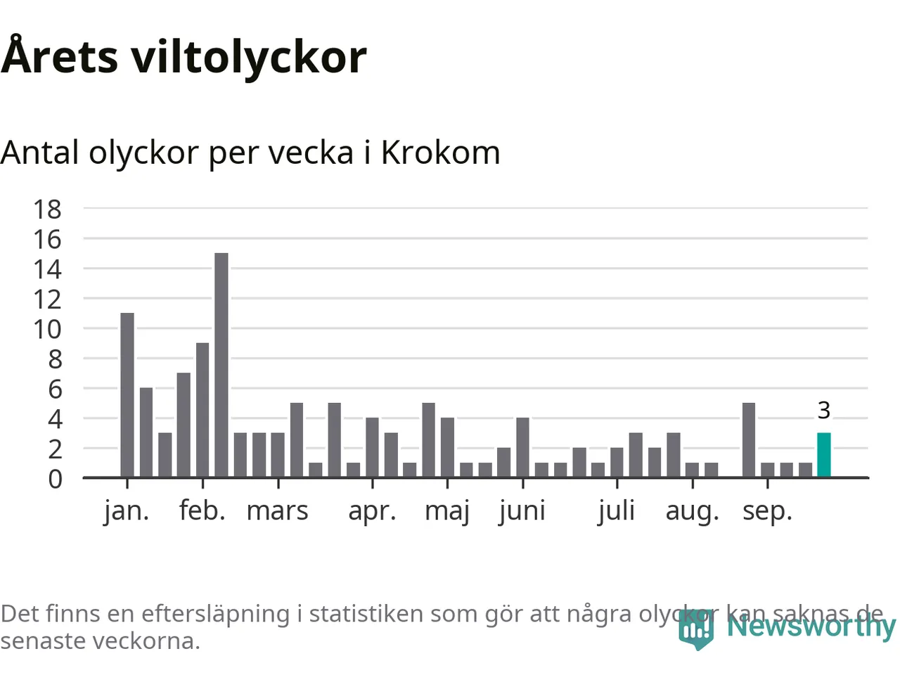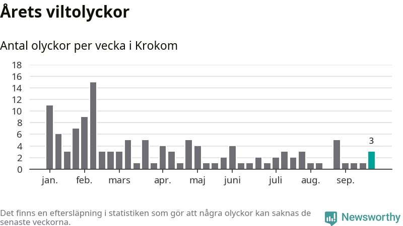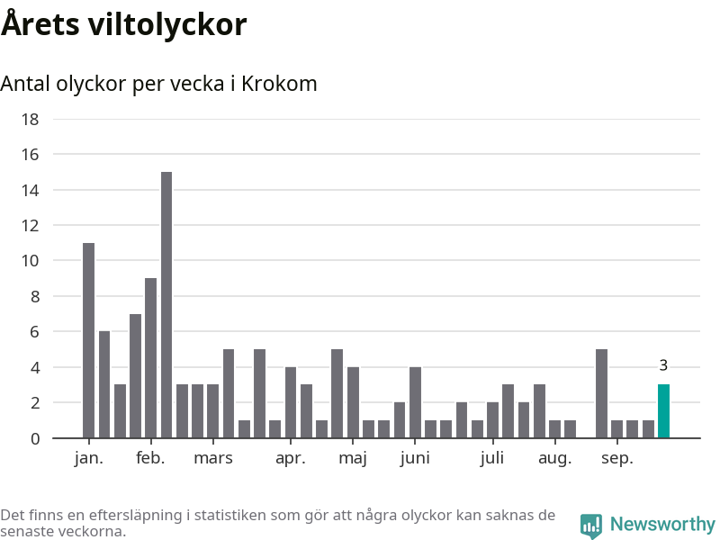 Till påkört vilt räknas även djur som inte kunnat återfinnas. Här visas de olyckor som rapporterats in hitills. Det förekommer felrapporteringar, och det dröjer också ibland innan en olycka rapporteras.