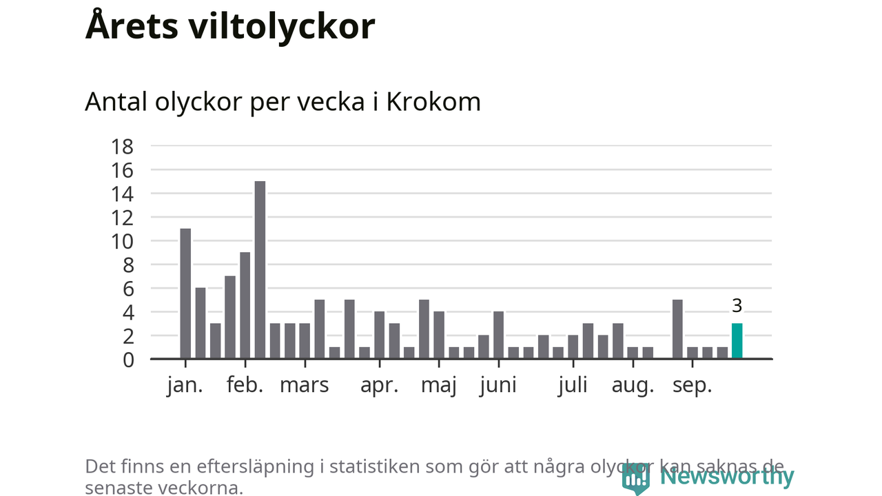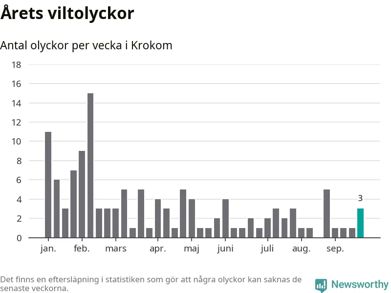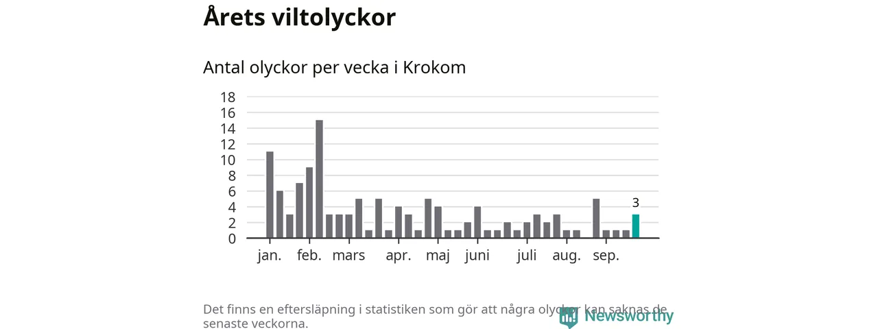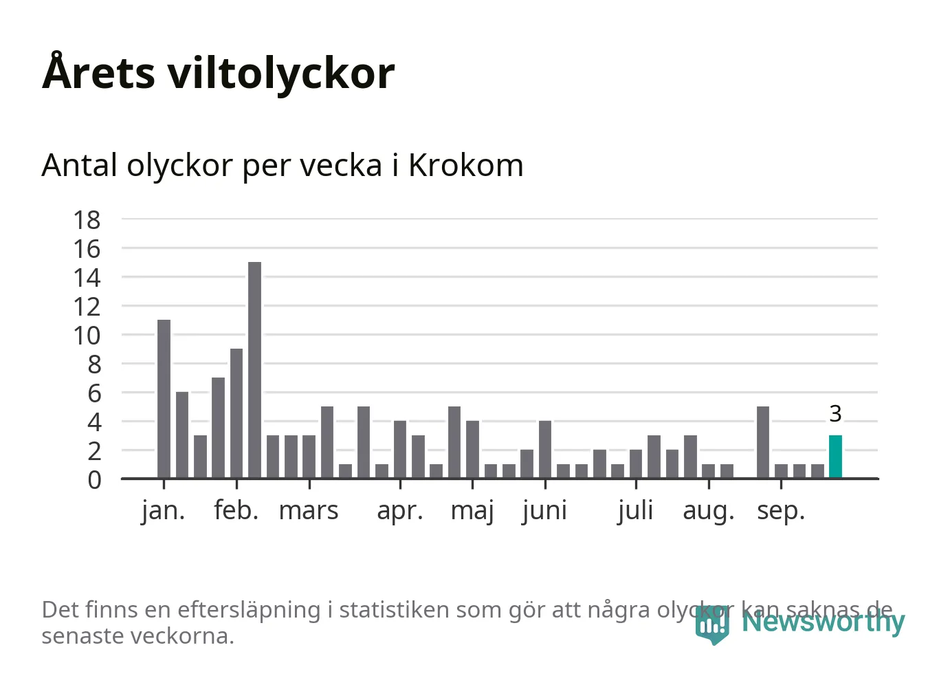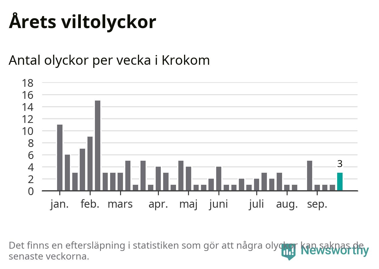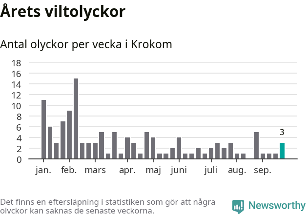 133 viltolyckor i kommunen. Det är en normal nivå i förhållande till hur det har sett ut under de senaste tio åren – genomsnittet för motsvarande period är 138.