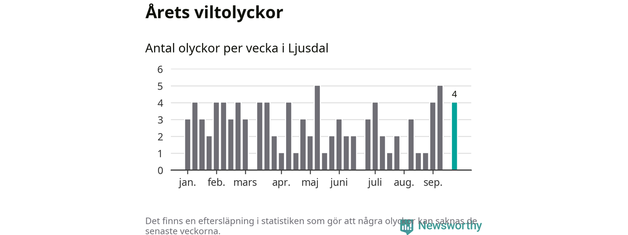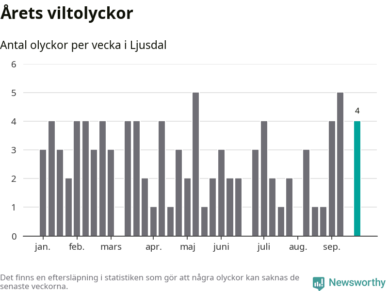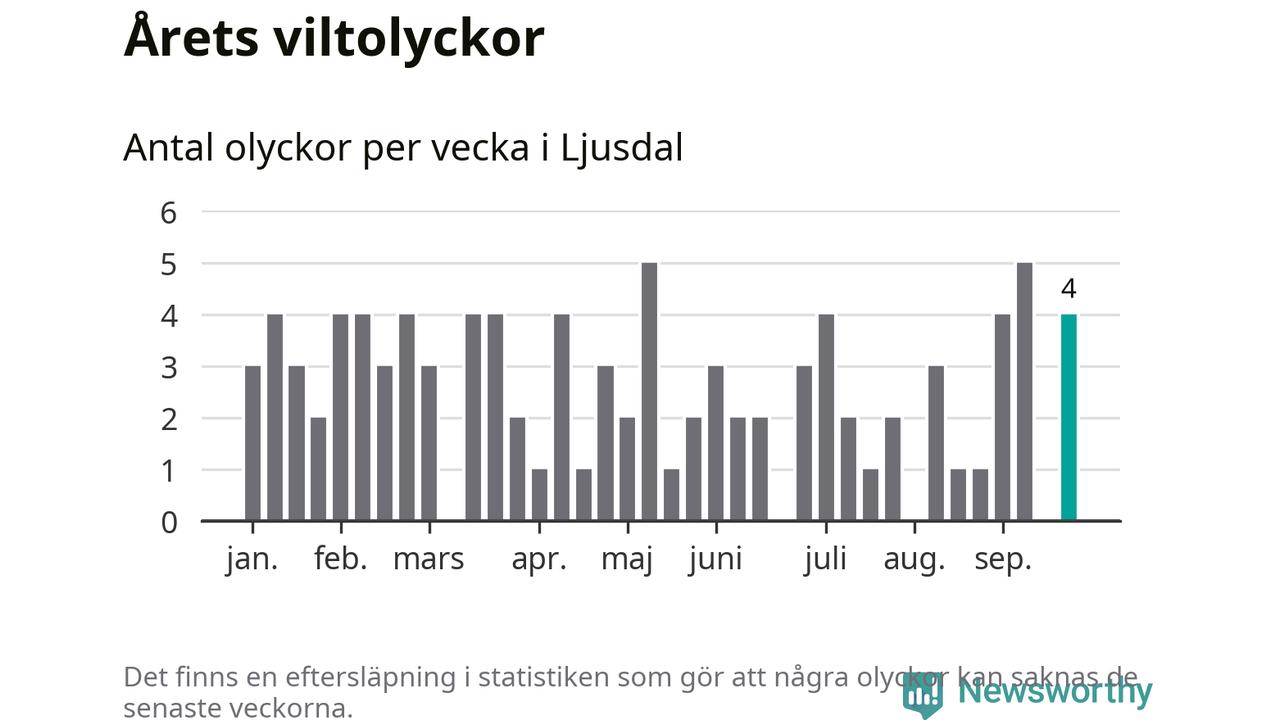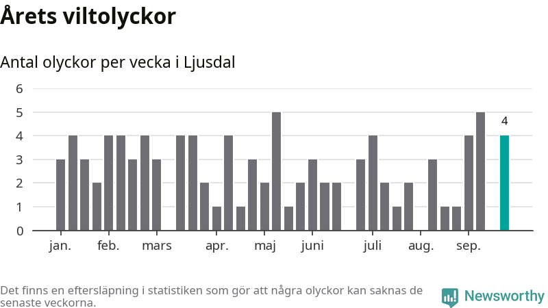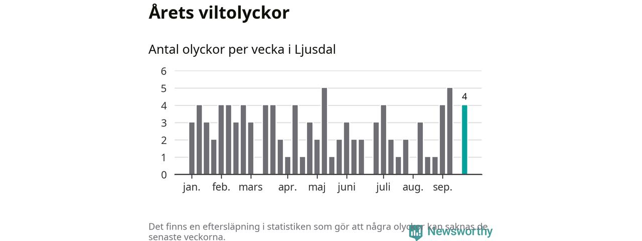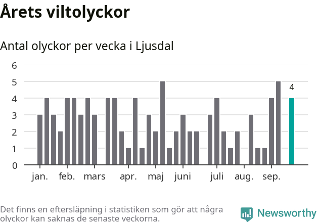 Hittills har fyra viltolyckor rapporterats in i Ljusdals kommun från vecka 39. Se listan här.