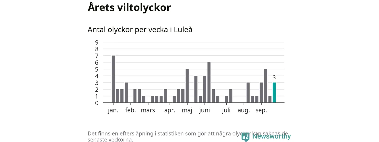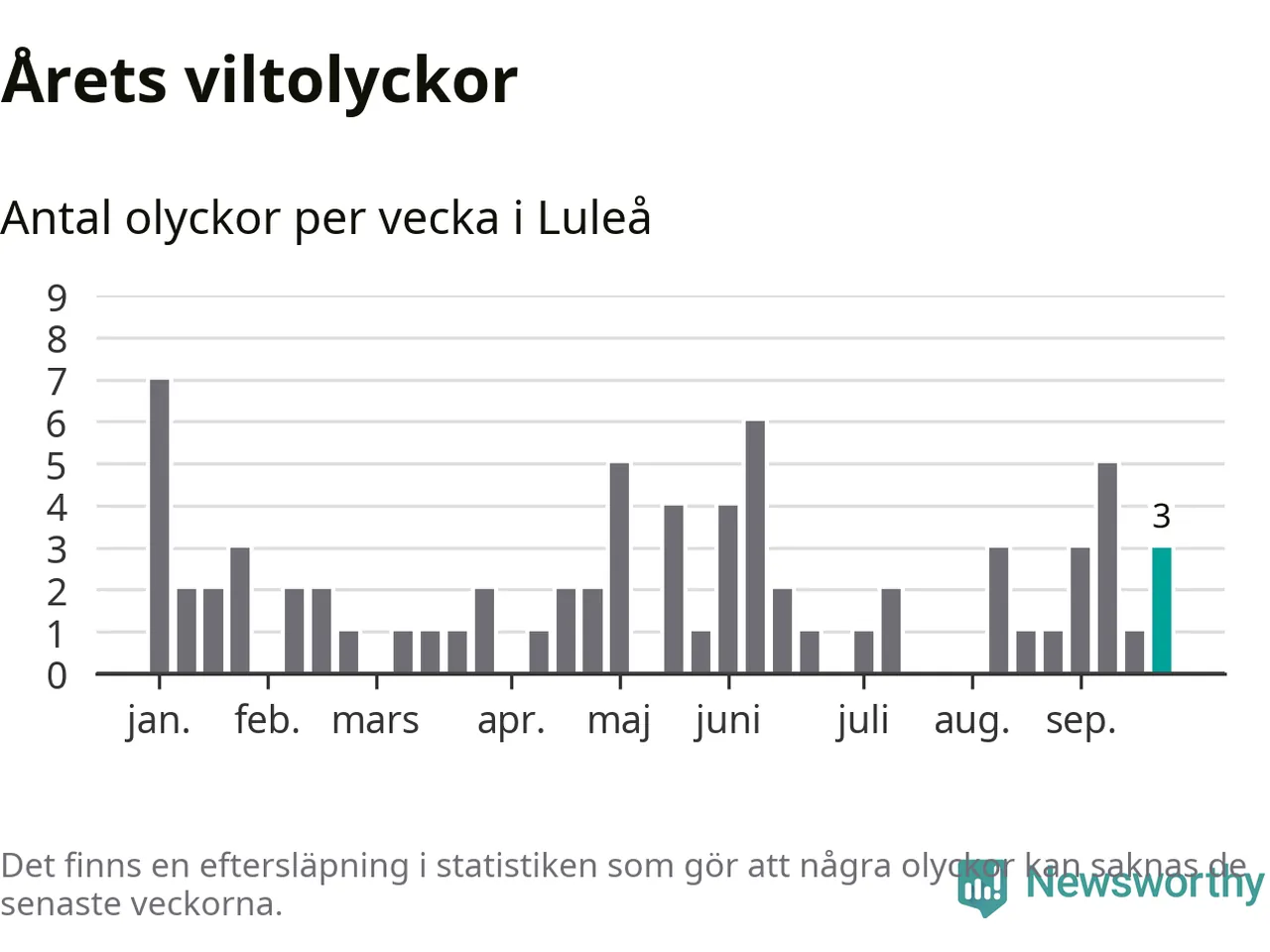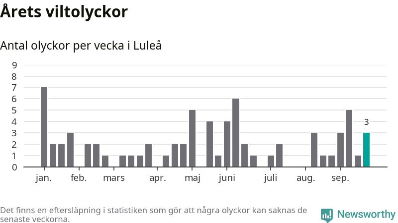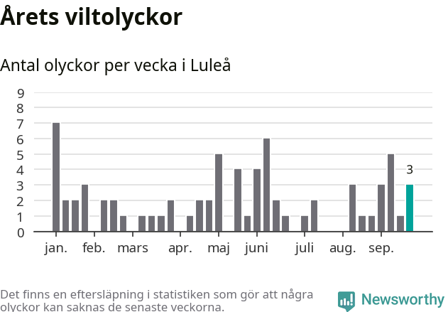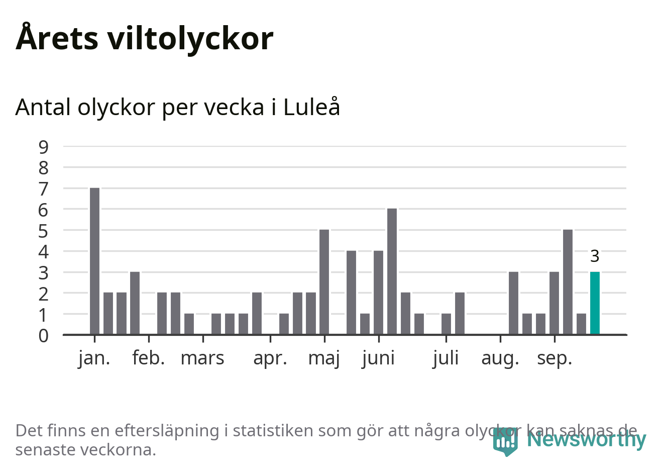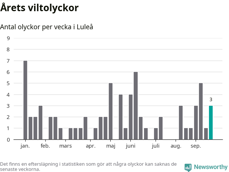Hittills har tre viltolyckor rapporterats in i Luleå kommun från vecka 39. Se listan här.