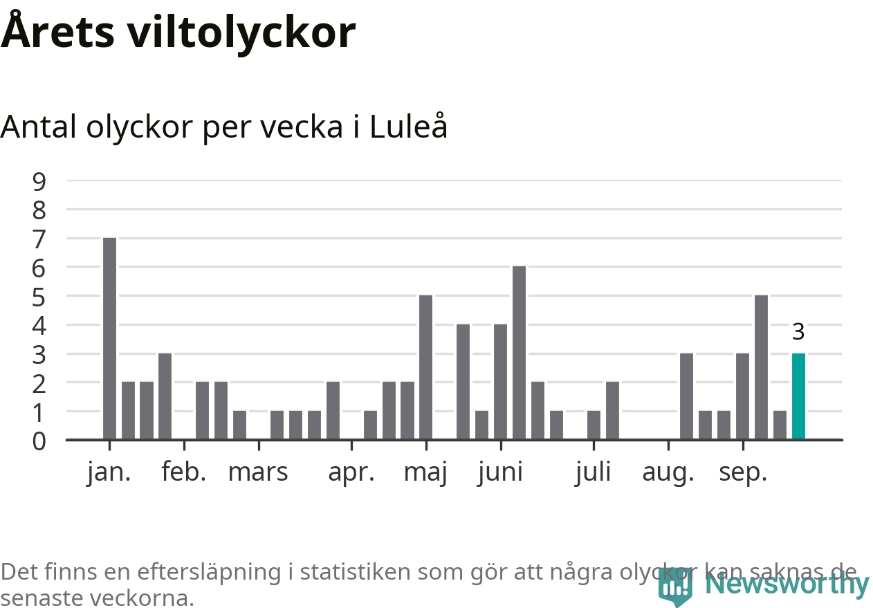 Viltolyckorna är som flest under vår och höst, men vilken typ av vilt varierar med årstiden. Så här års är det vanligast med älgolyckor i Luleå, sett till de senaste tio årens statistik. I statistiken ingår inte olyckor med ren, som här räknas som tamdjur.