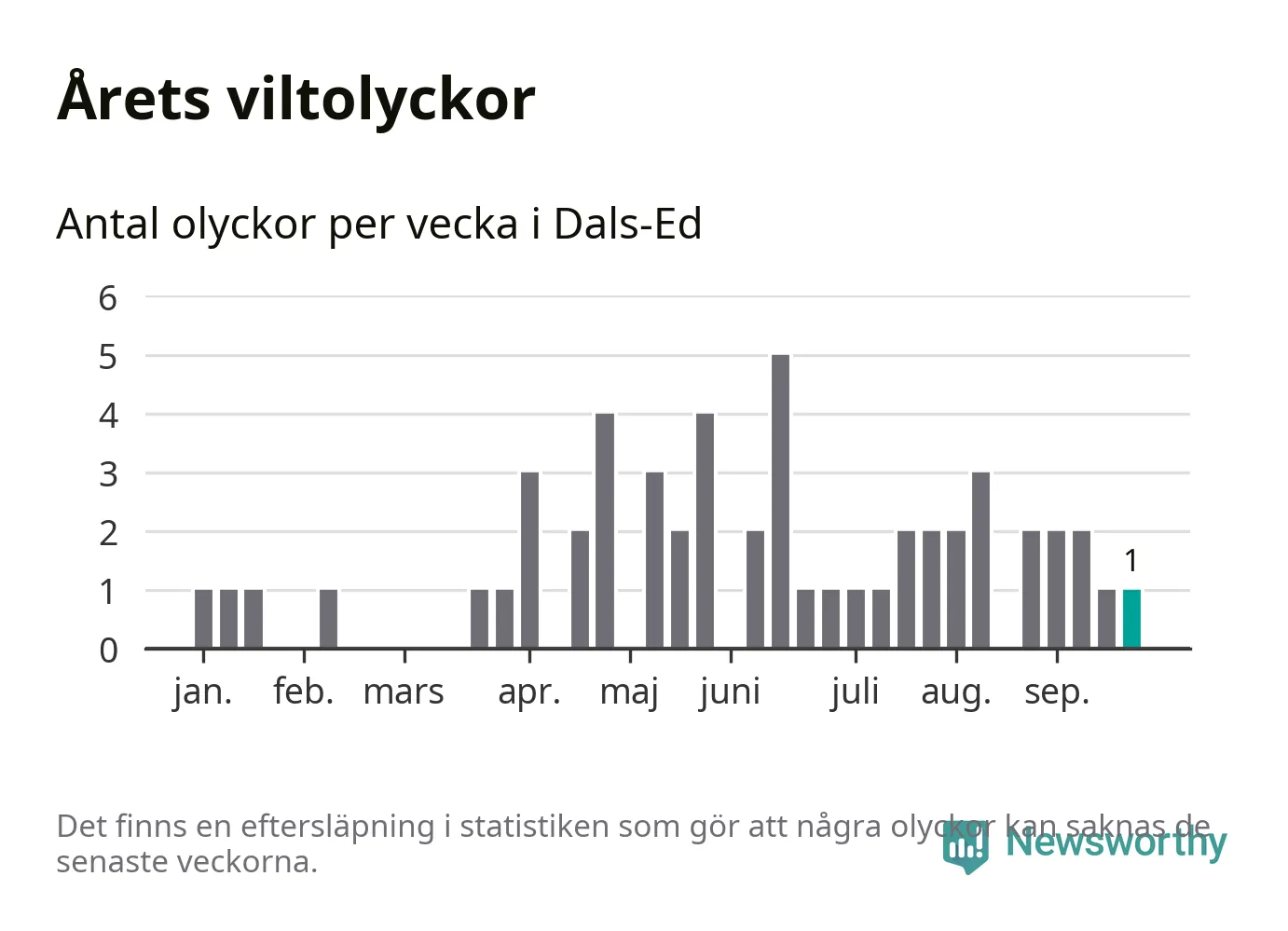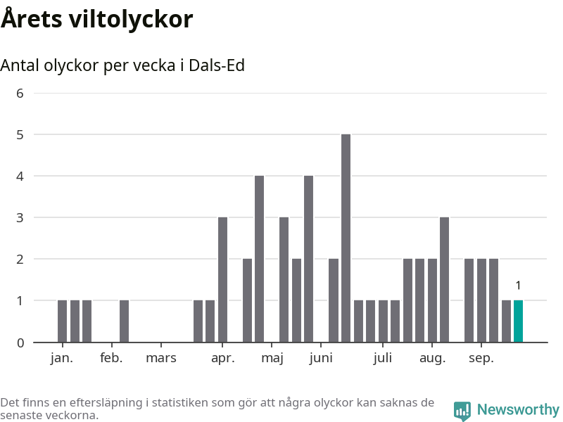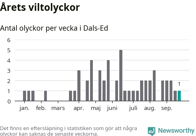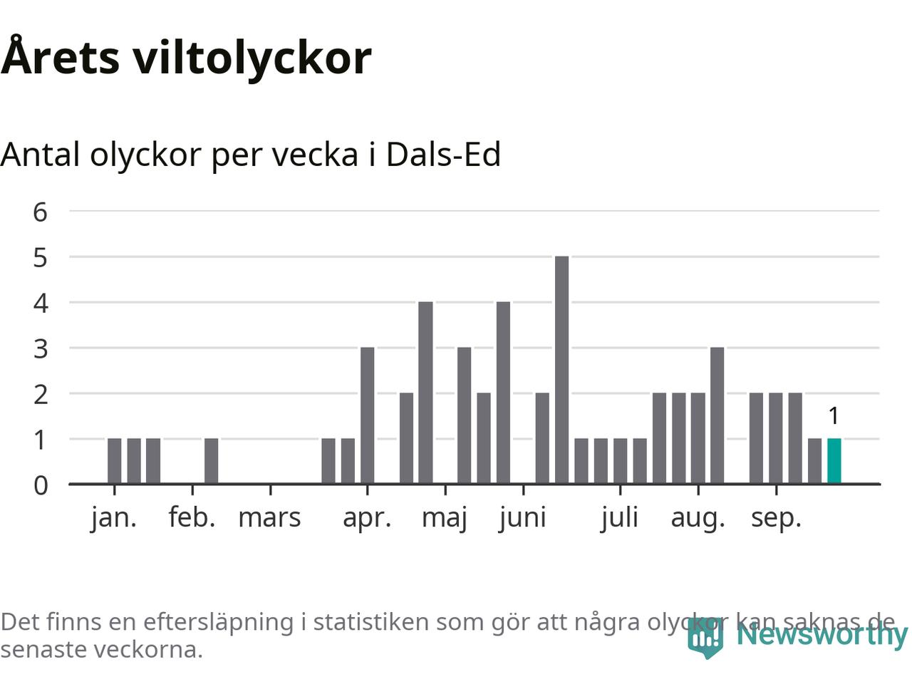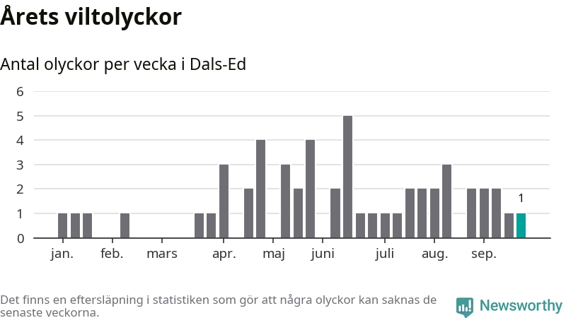 Från förra veckan (vecka 39) har hittills en viltolycka rapporterats in i Dals-Eds kommun.