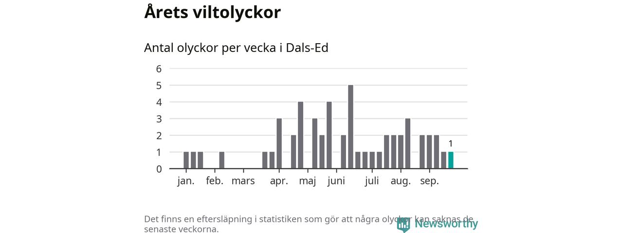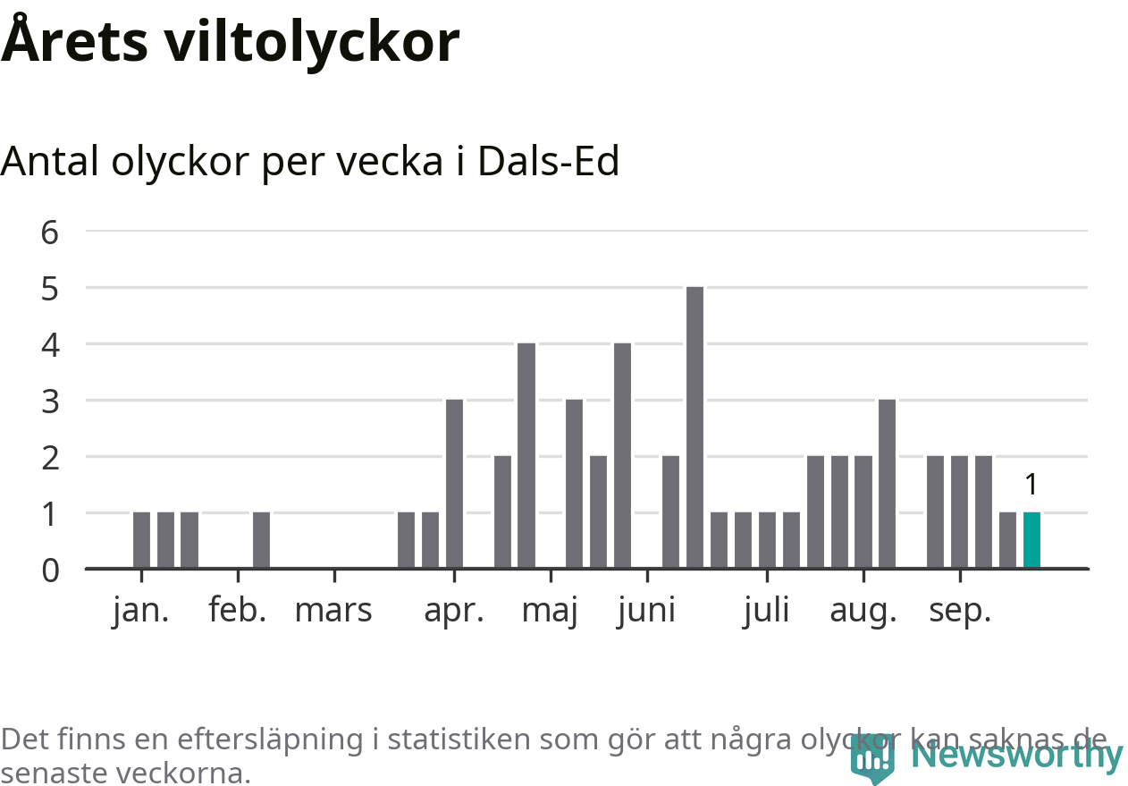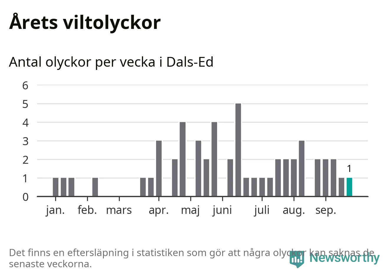 Från förra veckan (vecka 39) har hittills en viltolycka rapporterats in i Dals-Eds kommun.