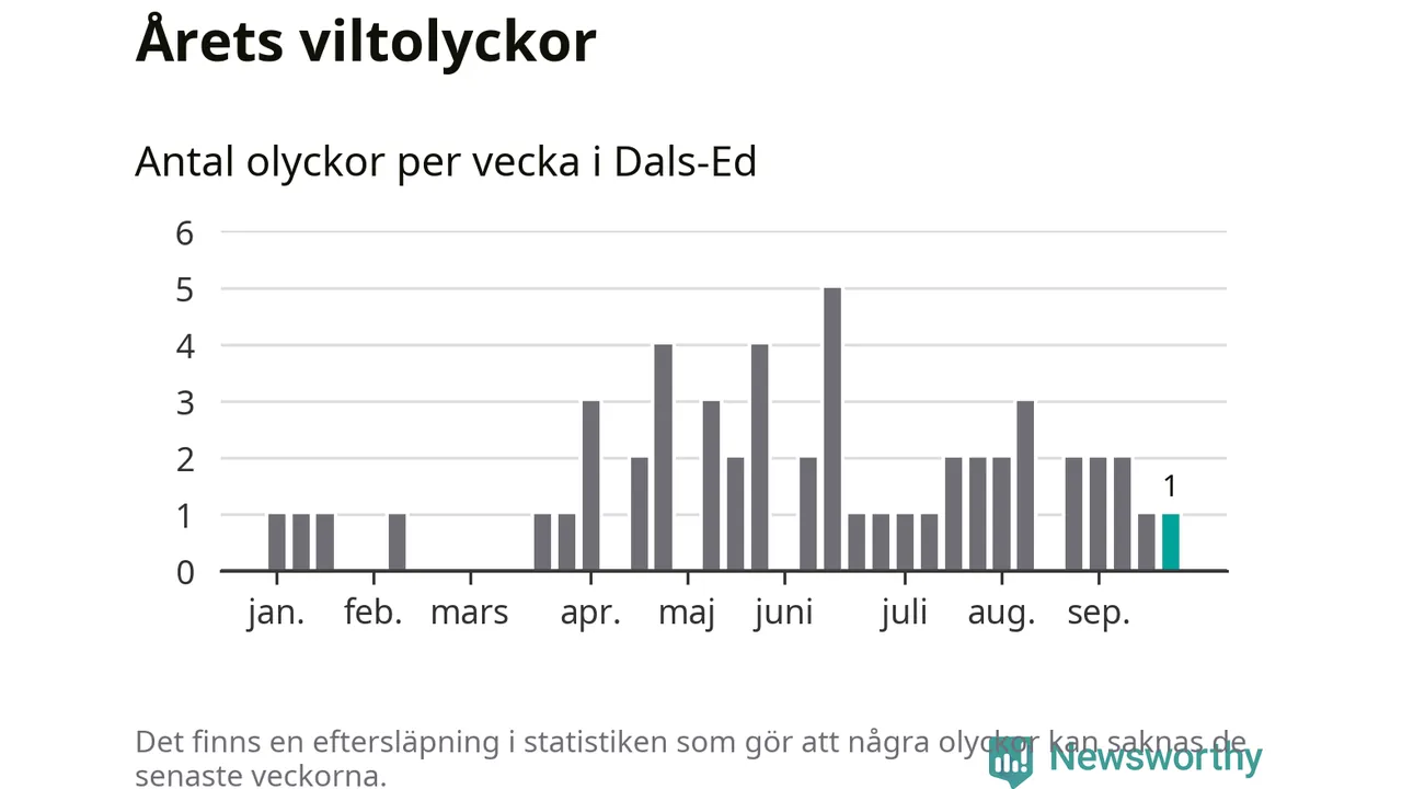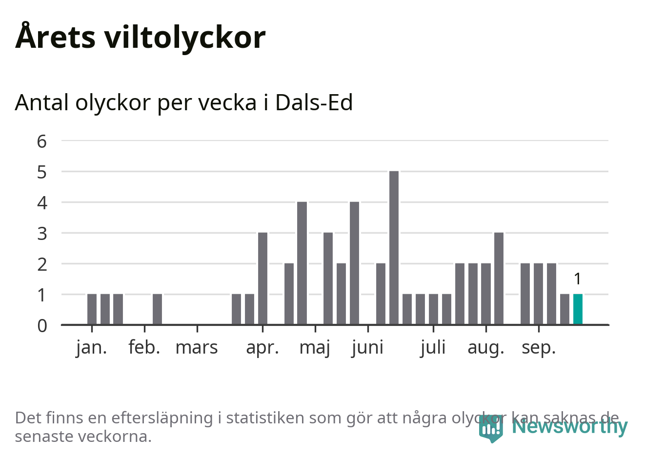 Totalt det här året har det inträffat 53 viltolyckor i kommunen. Det är mer än genomsnittet för motsvarande period (omkring 44) de senaste tio åren.