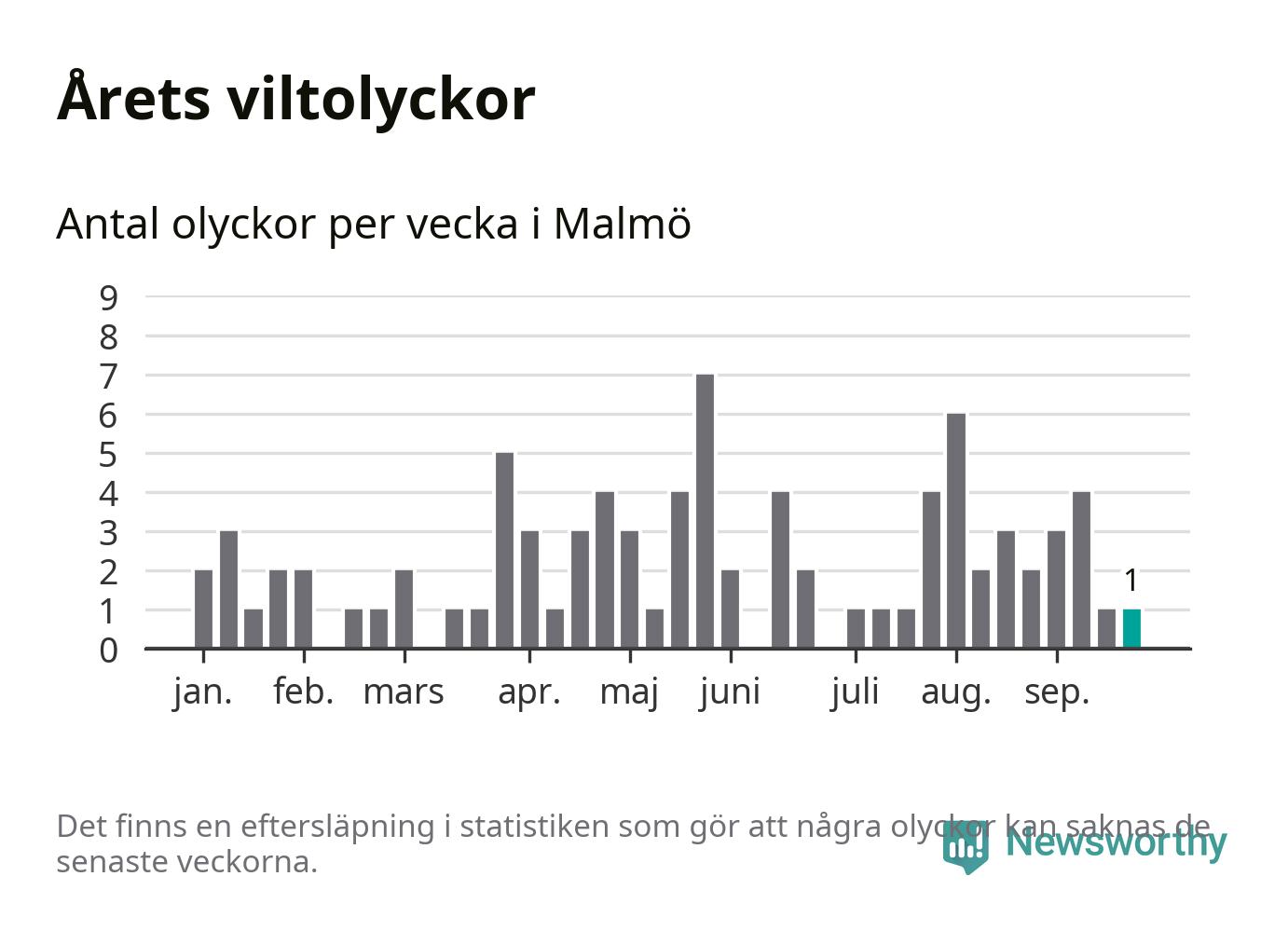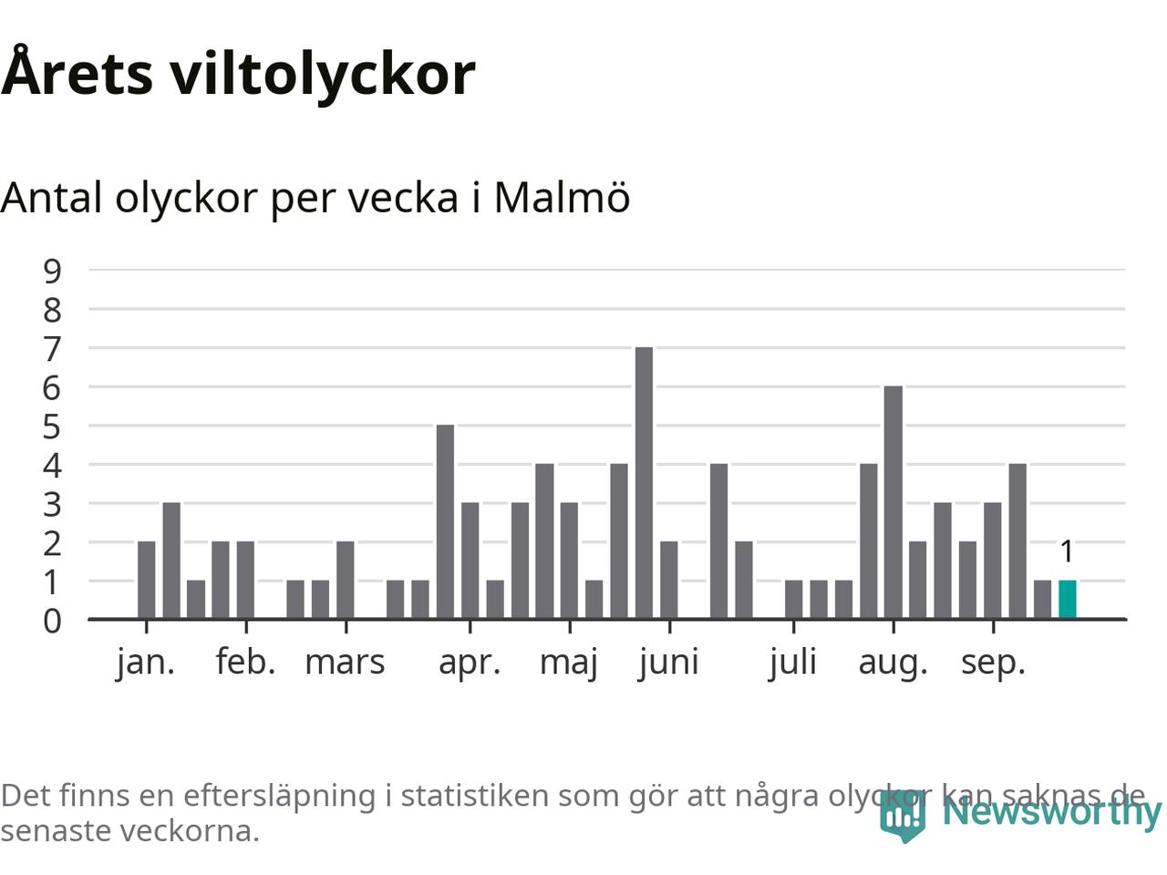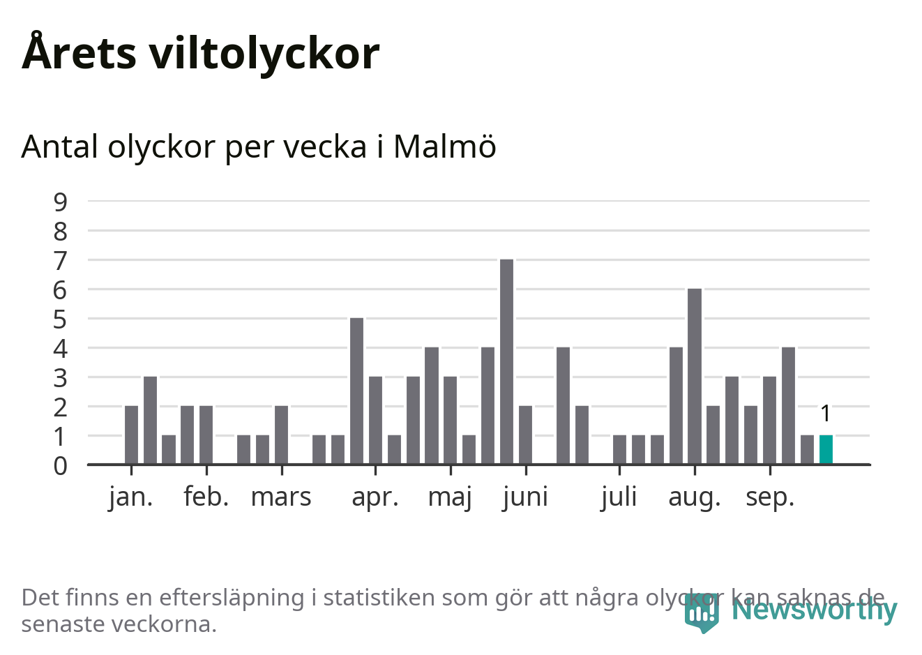 Från förra veckan (vecka 39) har hittills en viltolycka rapporterats in i Malmö kommun.