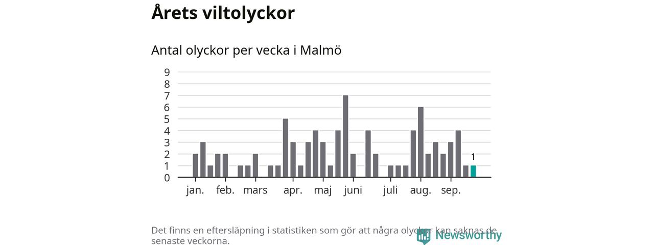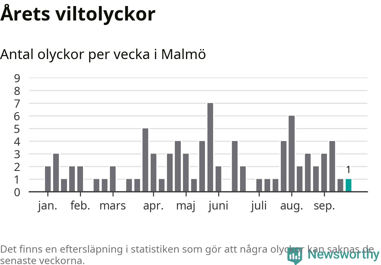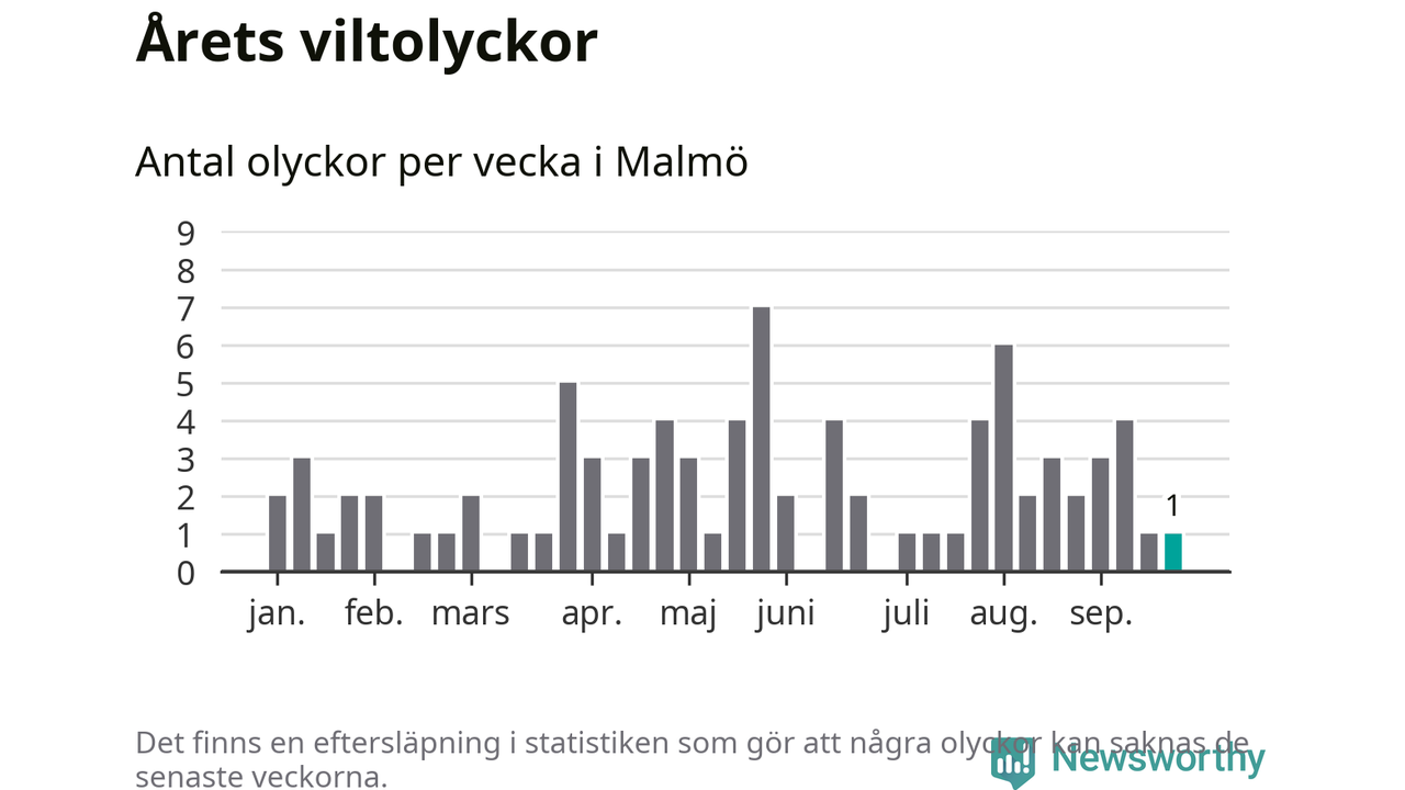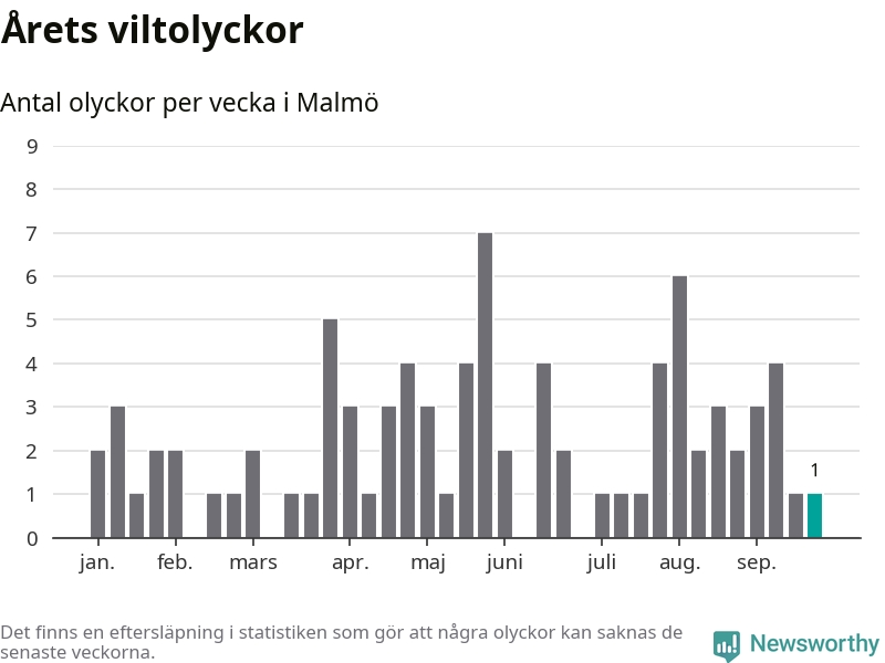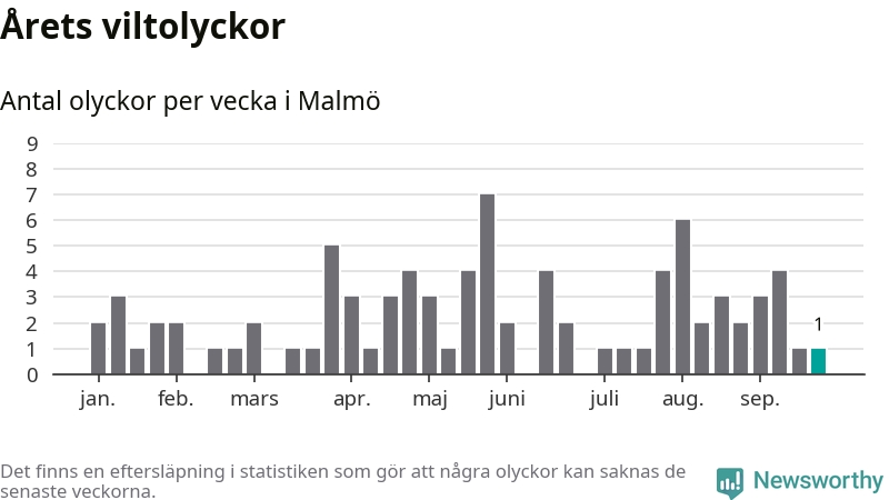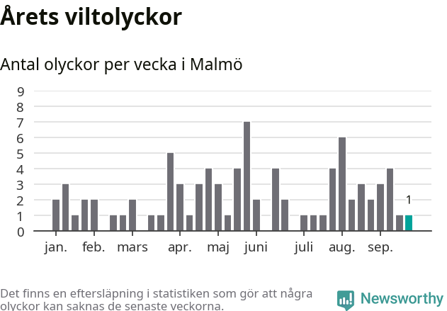 Från förra veckan (vecka 39) har hittills en viltolycka rapporterats in i Malmö kommun.