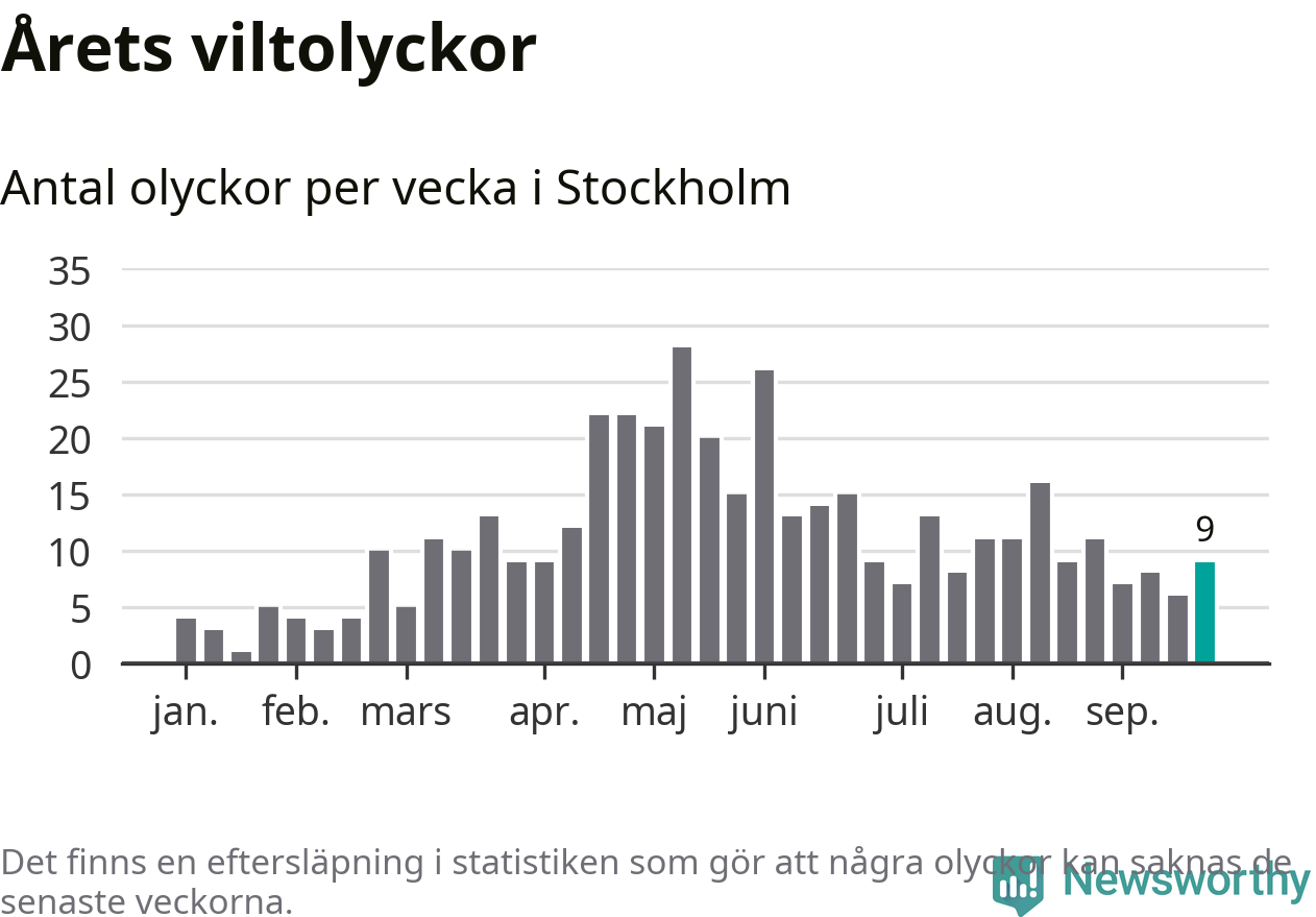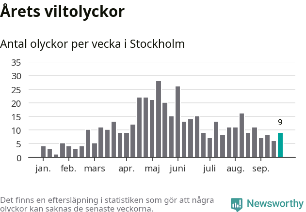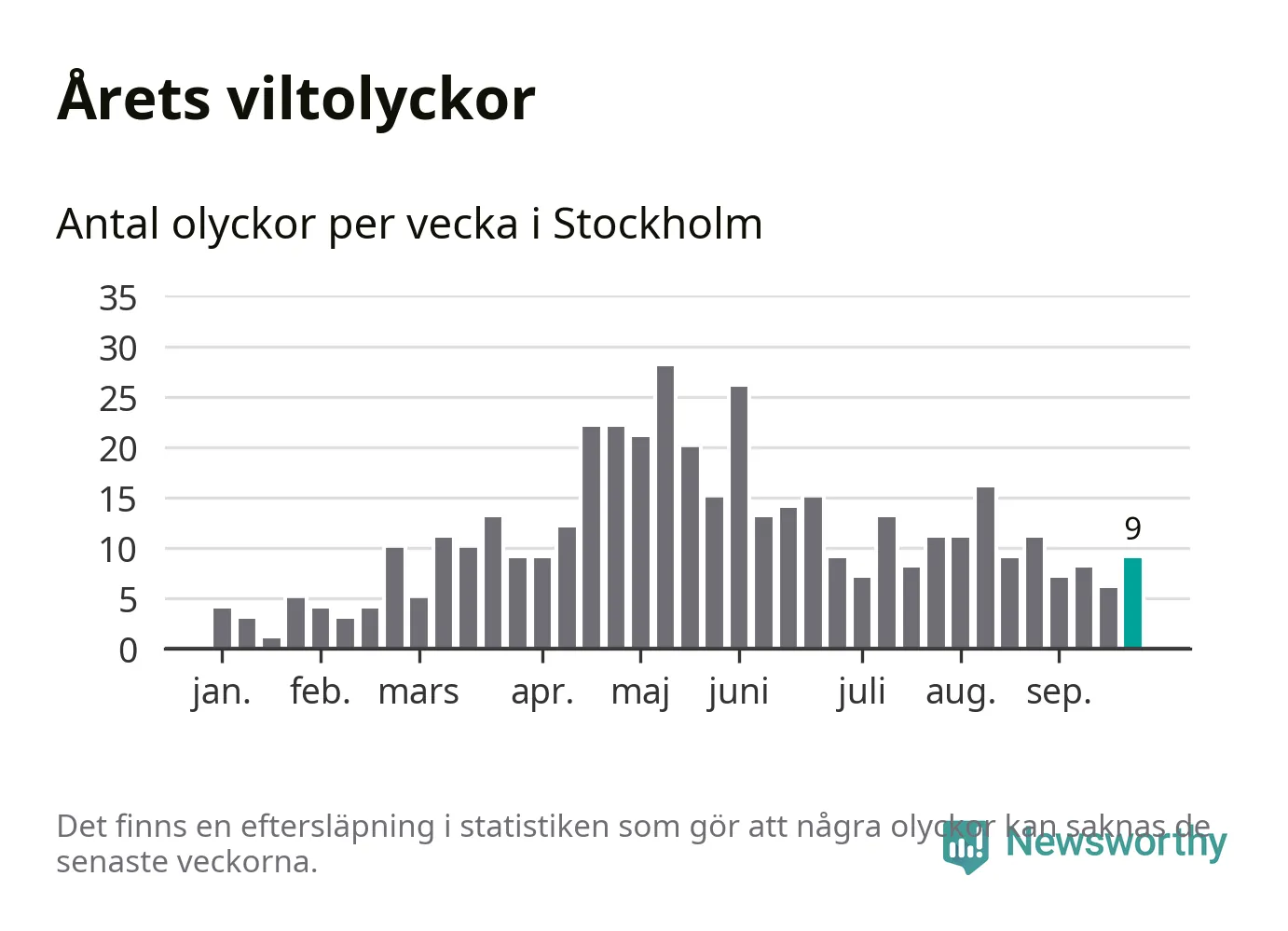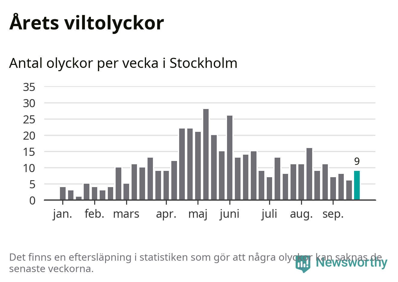 Hittills har nio viltolyckor rapporterats in i Stockholms kommun från vecka 39. Se listan här.