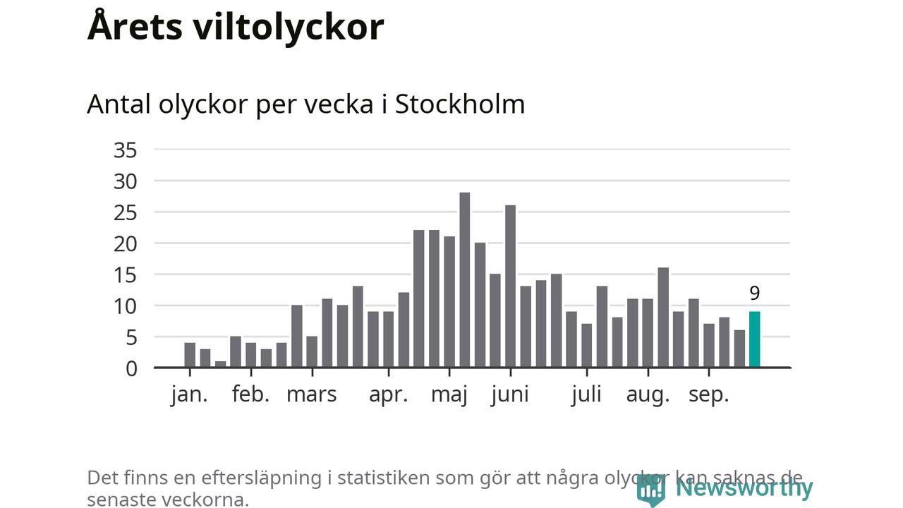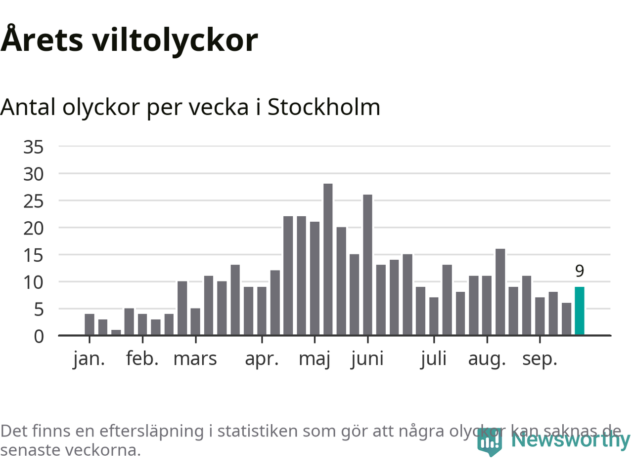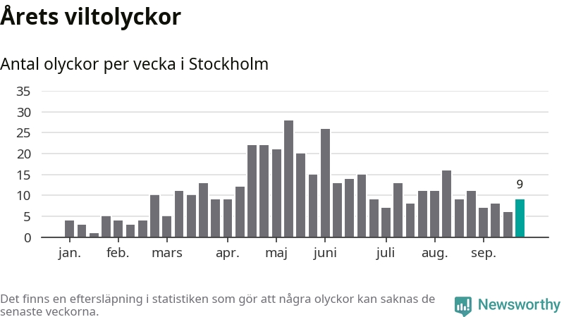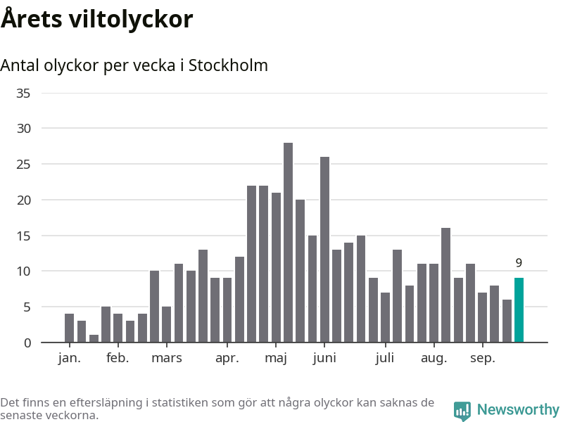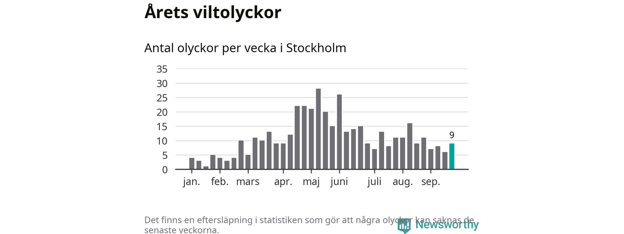 Hittills har nio viltolyckor rapporterats in i Stockholms kommun från vecka 39. Se listan här.