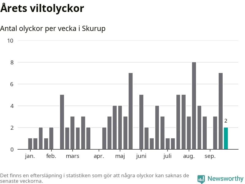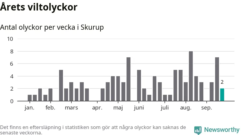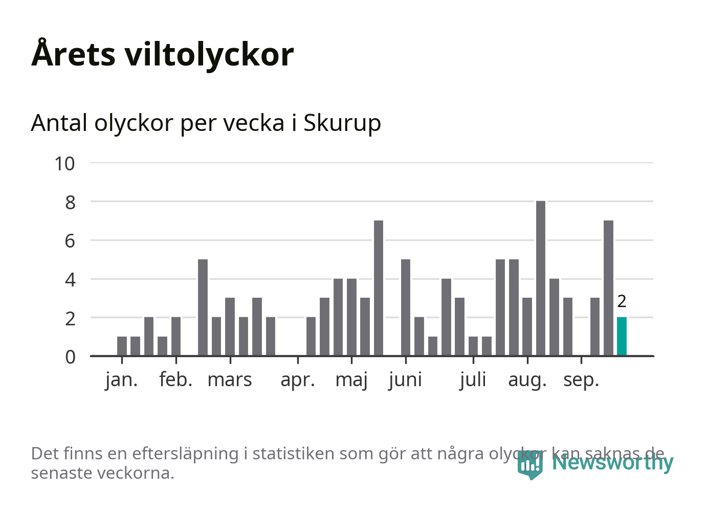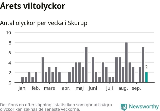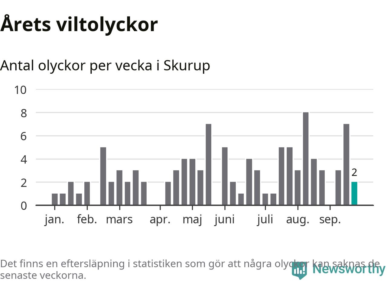 Hittills har två viltolyckor rapporterats in i Skurups kommun från vecka 39. Se listan här.