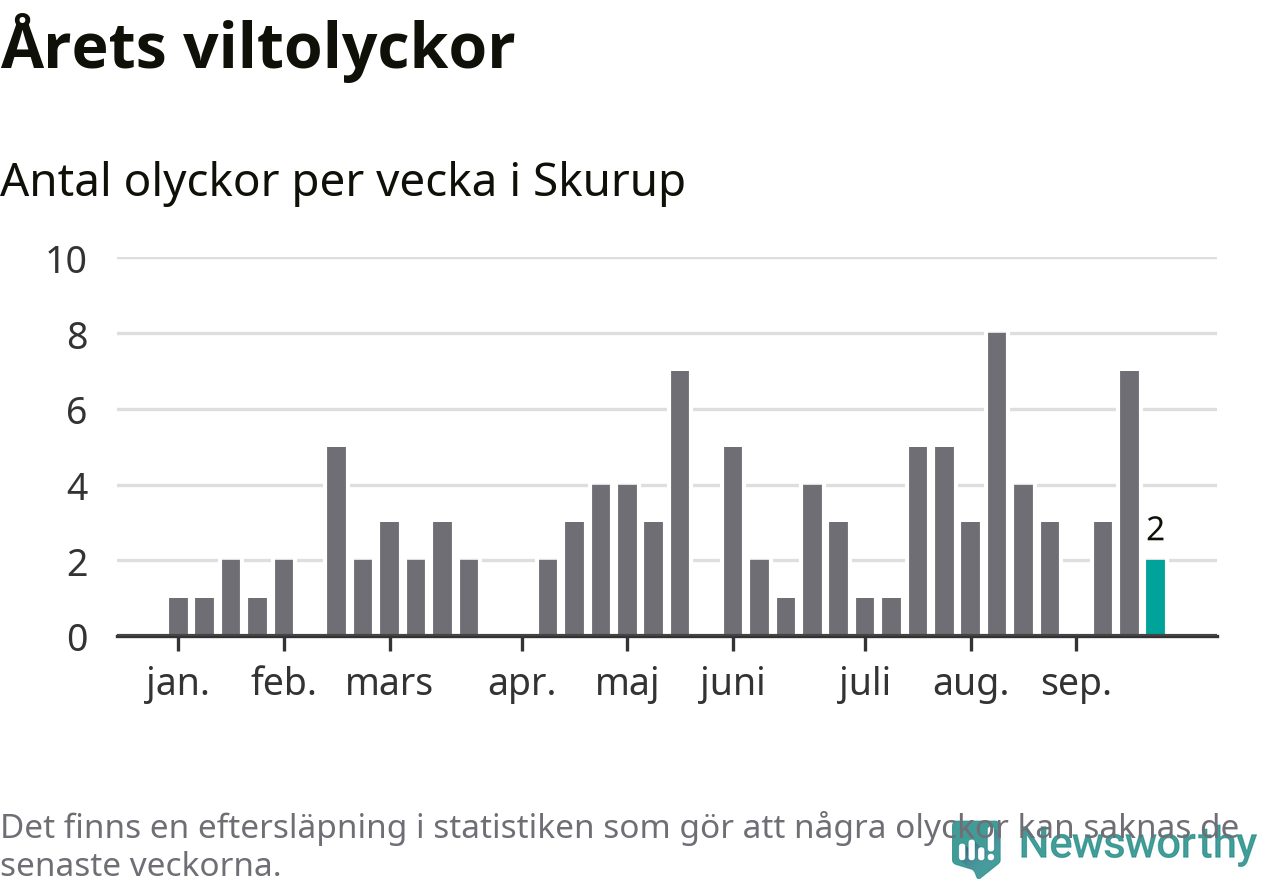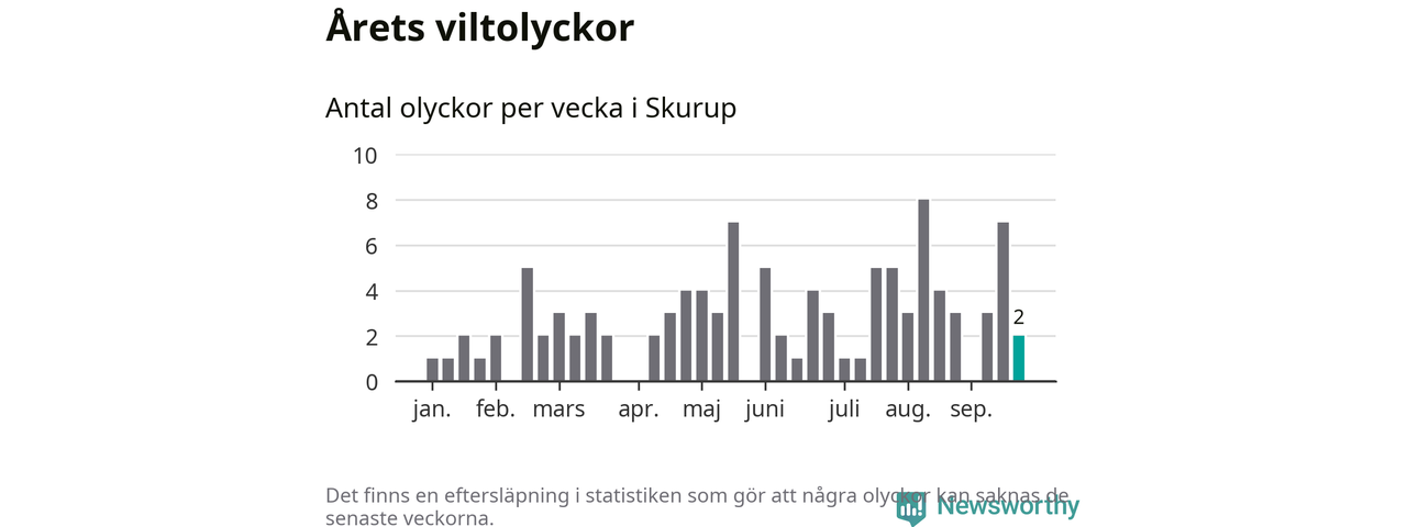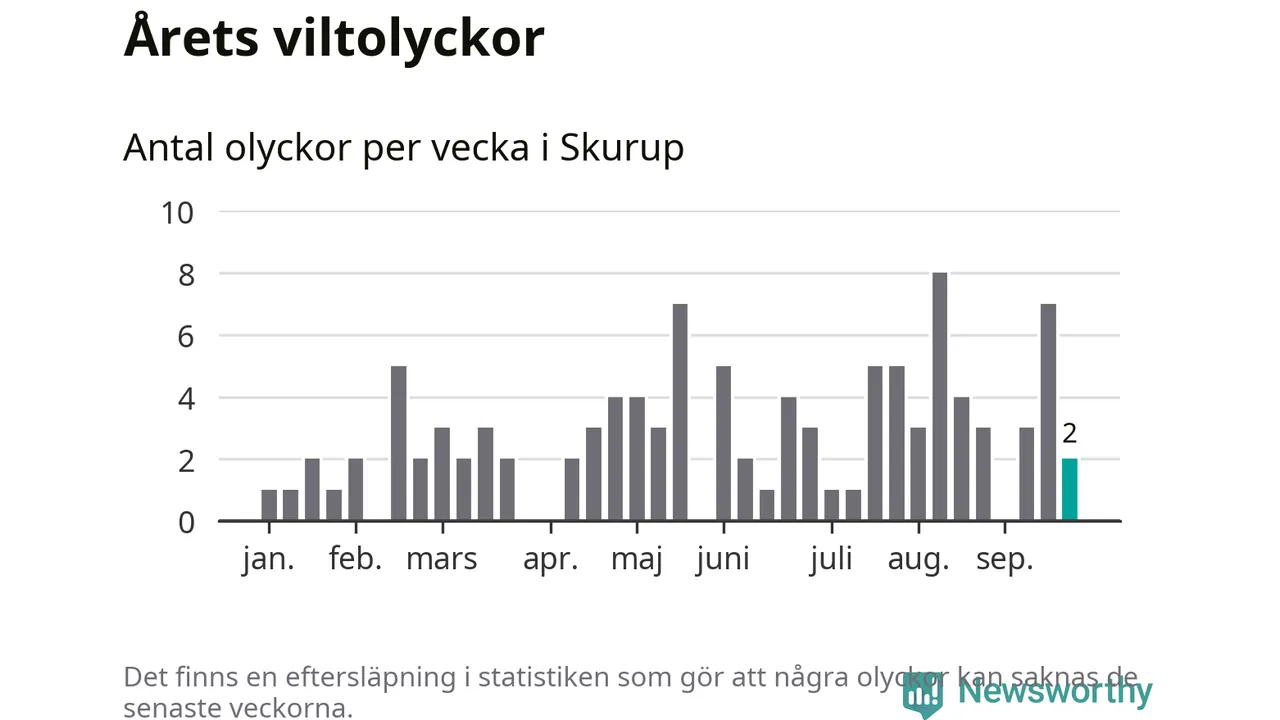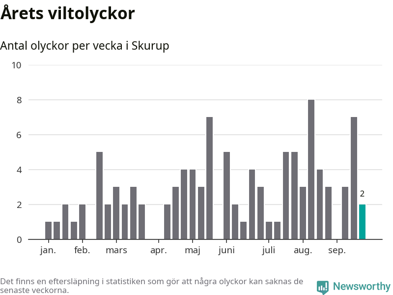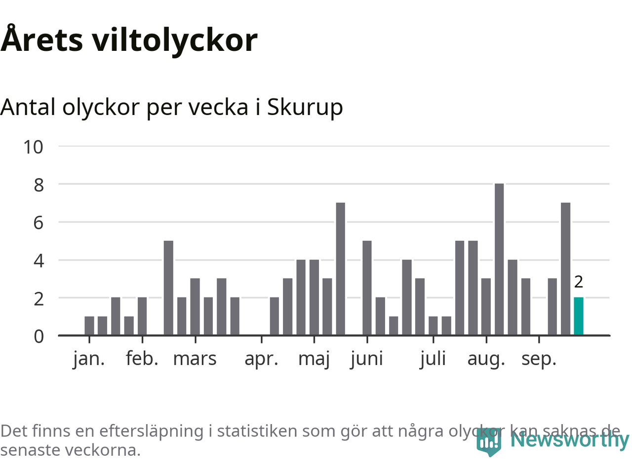 Hittills har två viltolyckor rapporterats in i Skurups kommun från vecka 39. Se listan här.