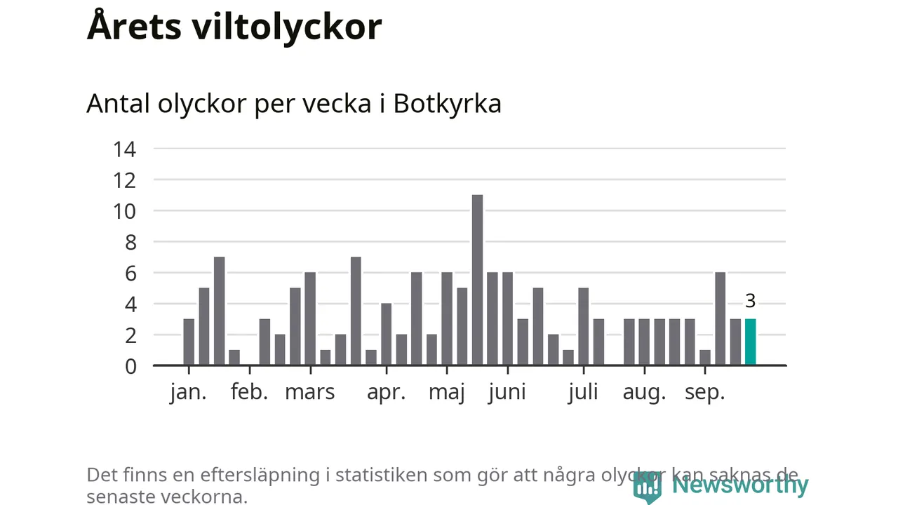 Totalt det här året har det inträffat 138 viltolyckor i kommunen. Det är mer än genomsnittet för motsvarande period (omkring 96) de senaste tio åren.
