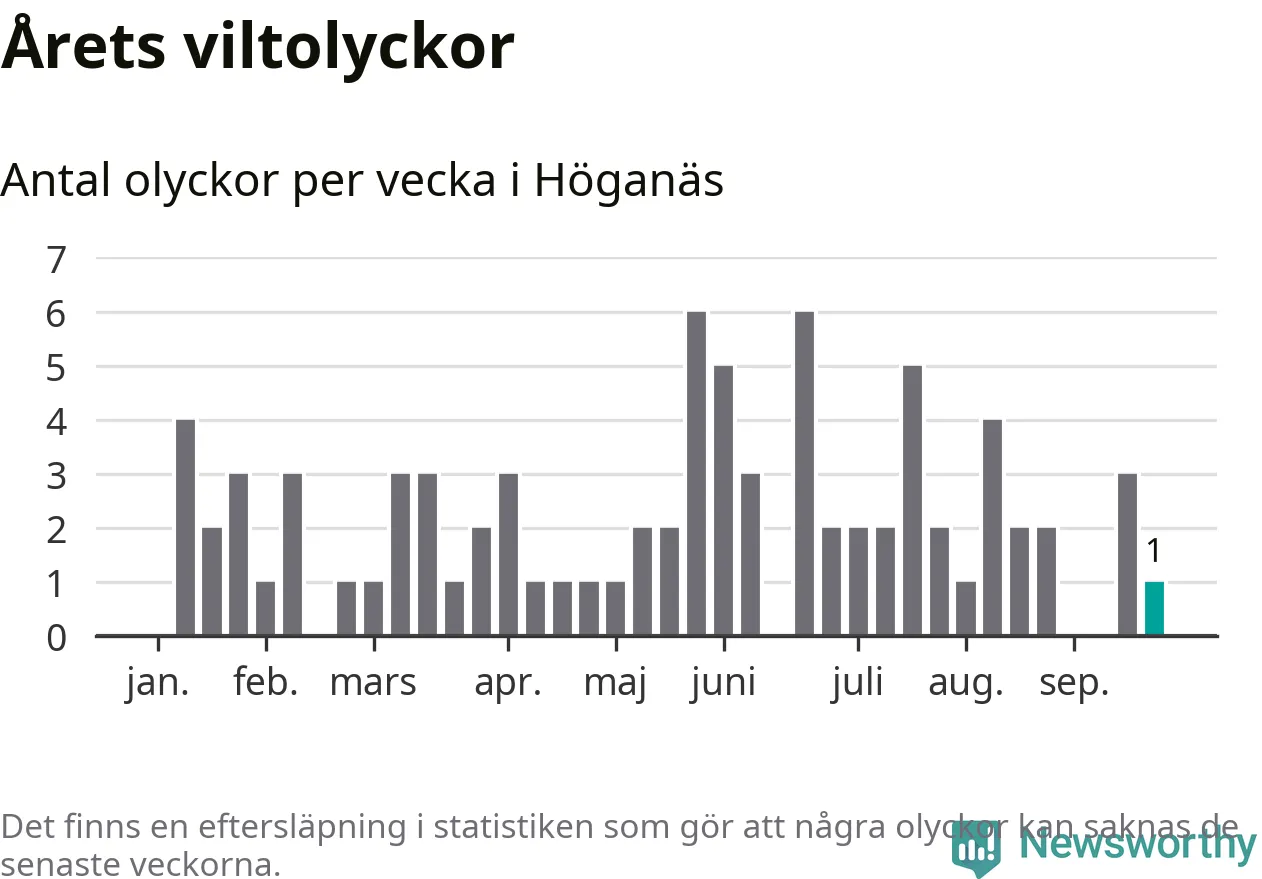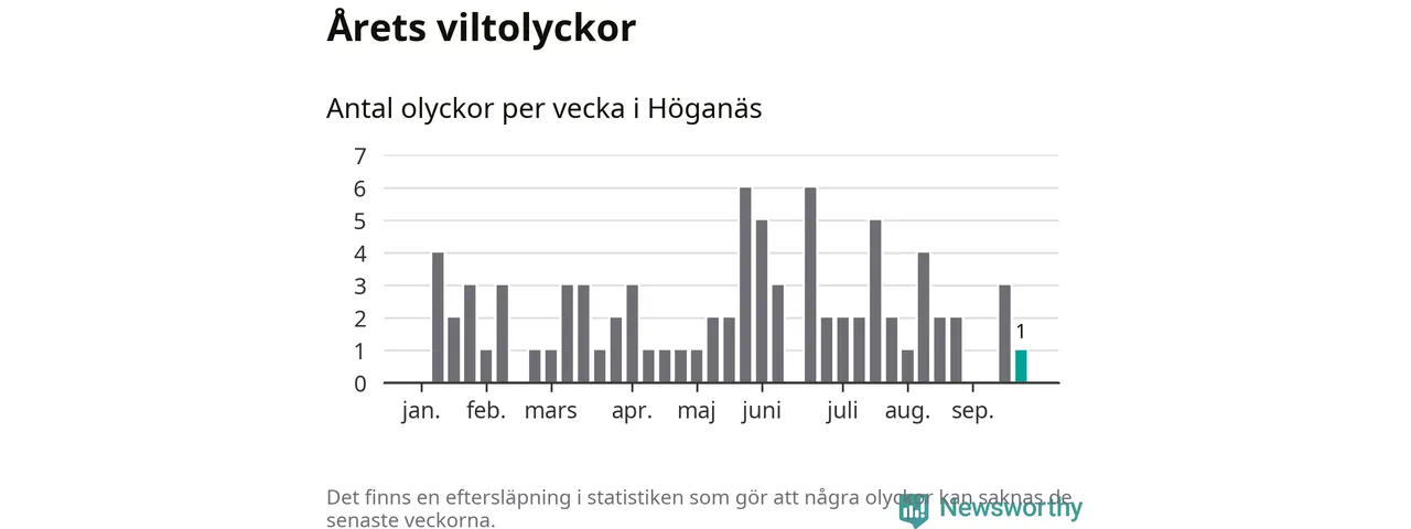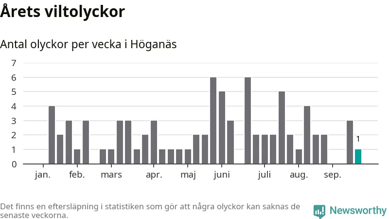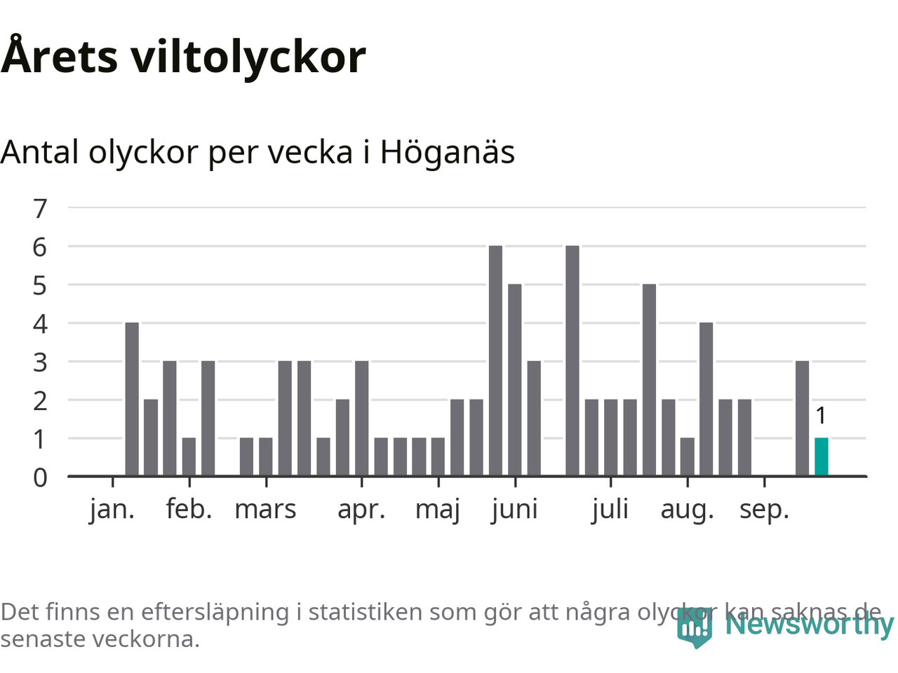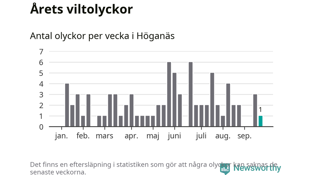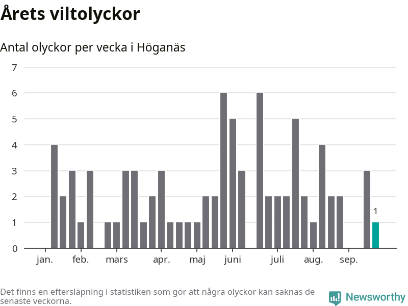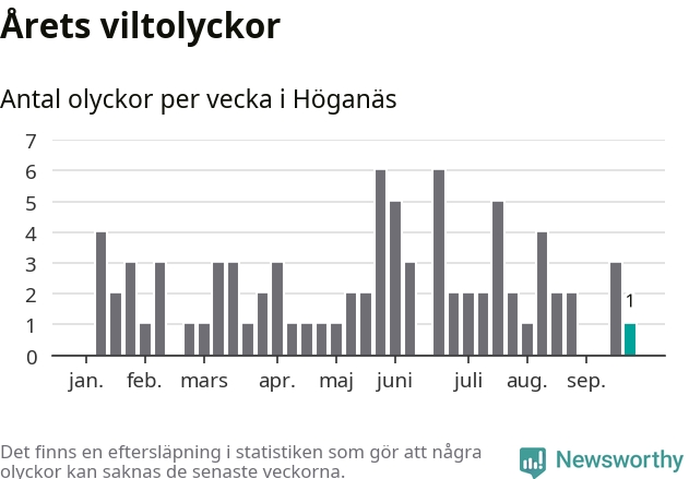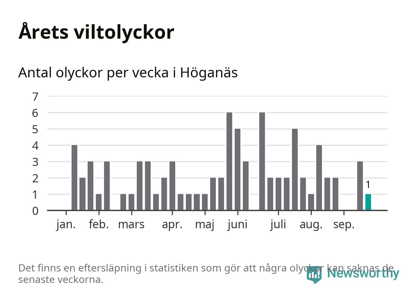 Från förra veckan (vecka 39) har hittills en viltolycka rapporterats in i Höganäs kommun.