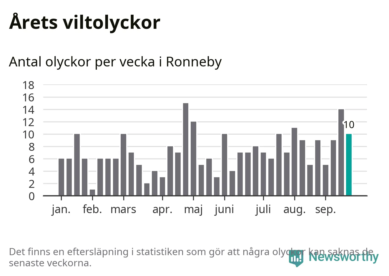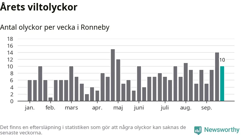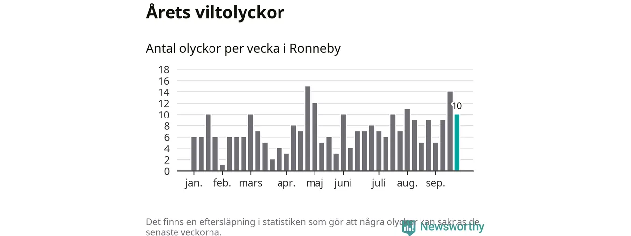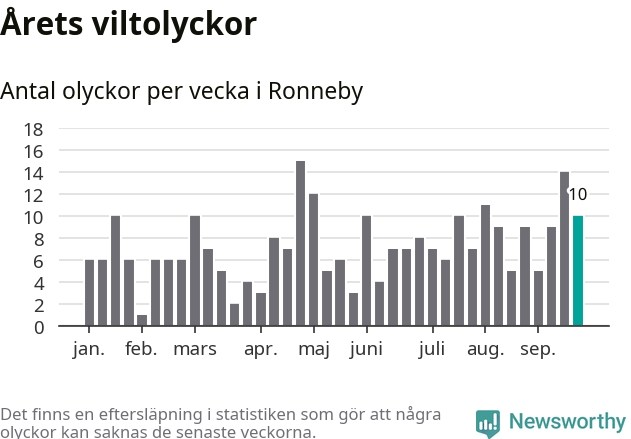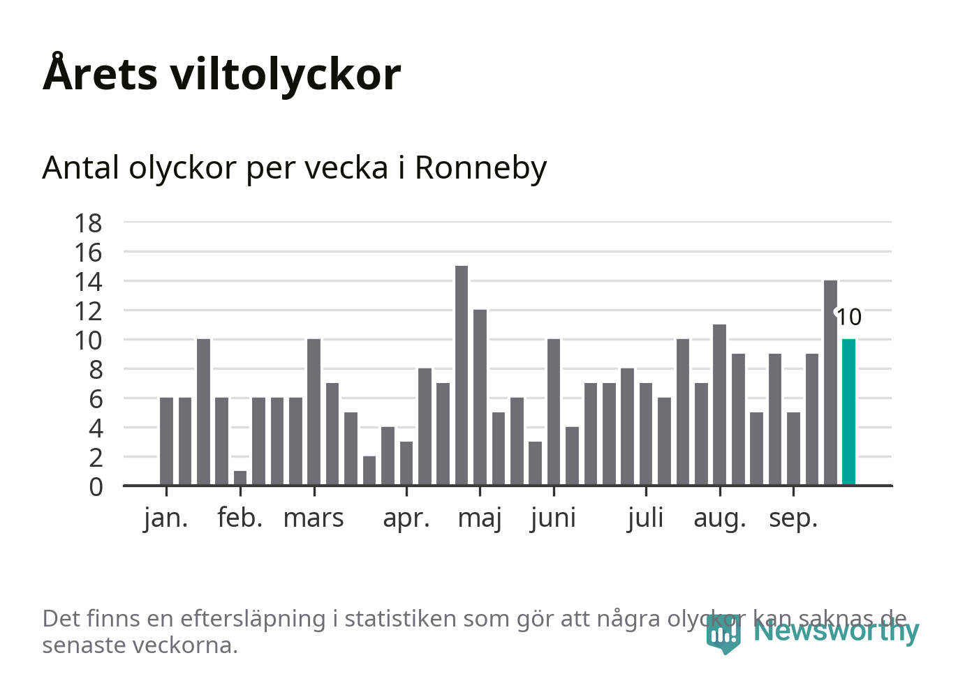 Hittills har tio viltolyckor rapporterats in i Ronneby kommun från vecka 39. Se listan här.