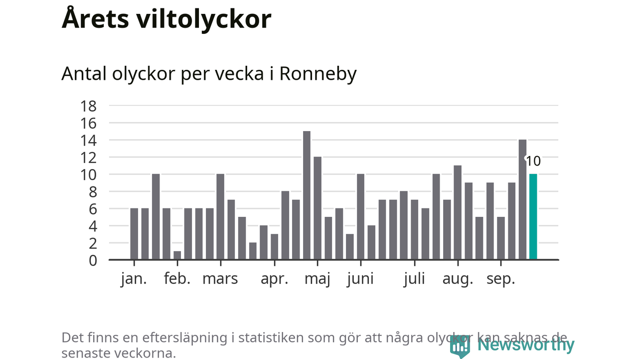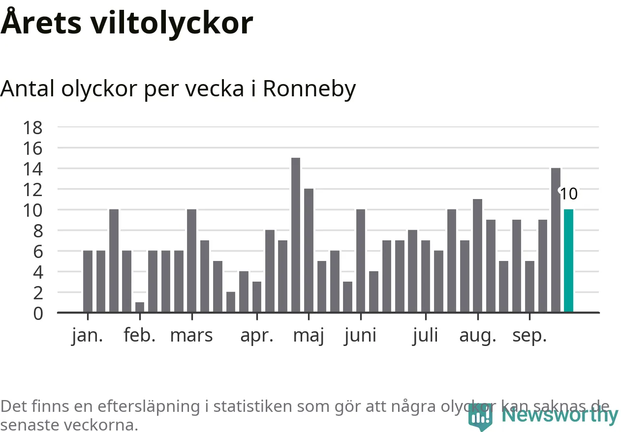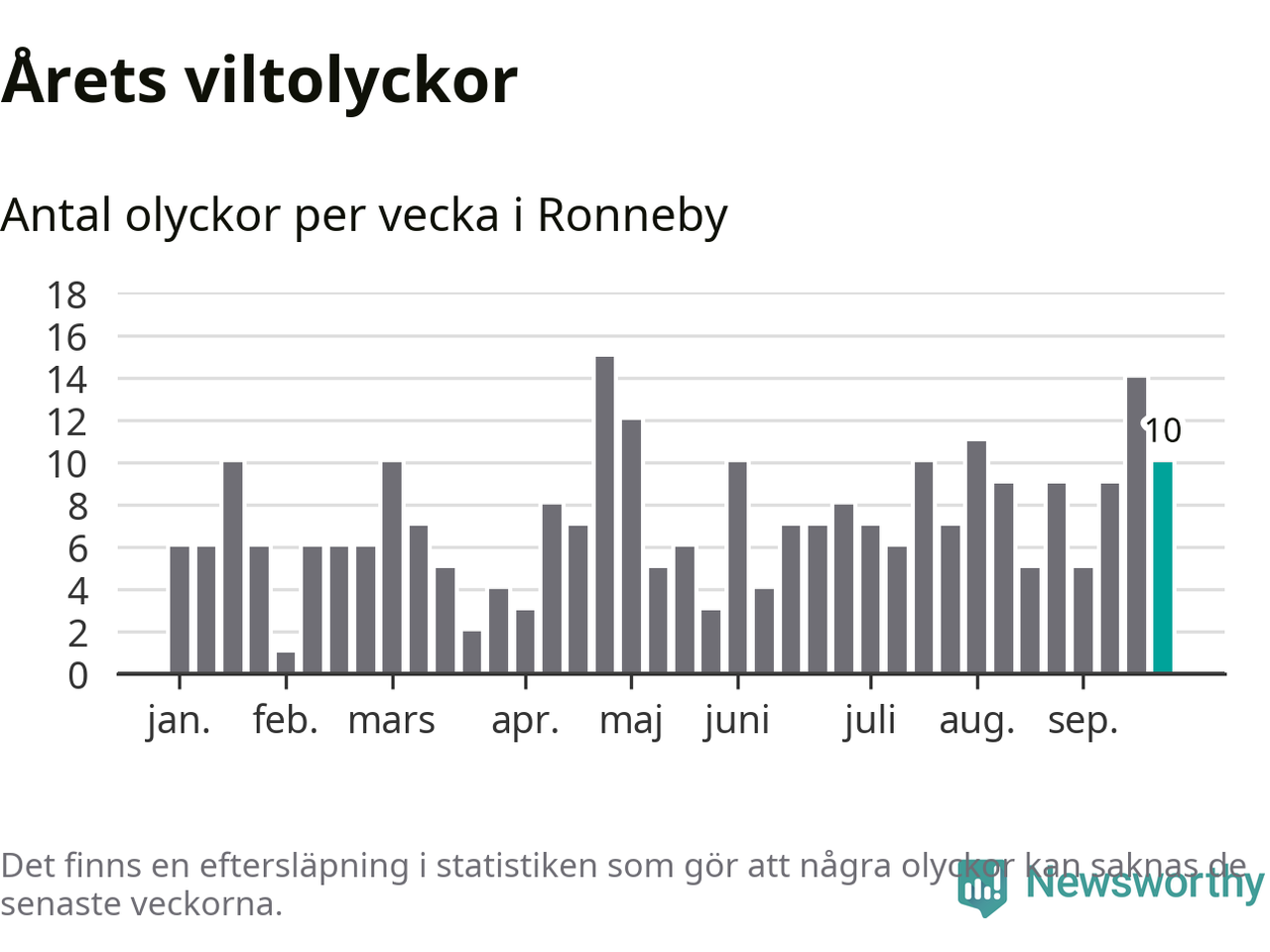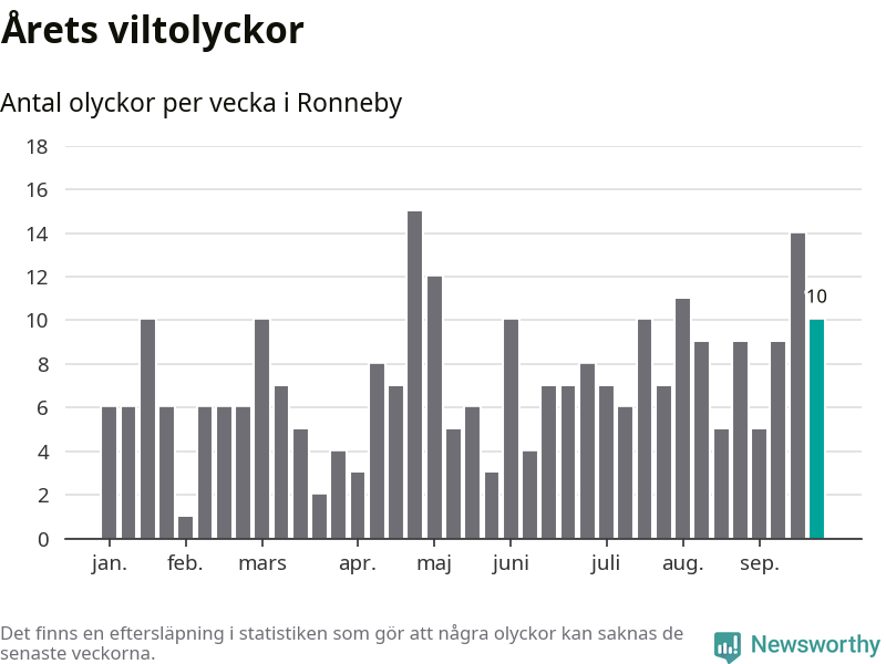 Hittills har tio viltolyckor rapporterats in i Ronneby kommun från vecka 39. Se listan här.