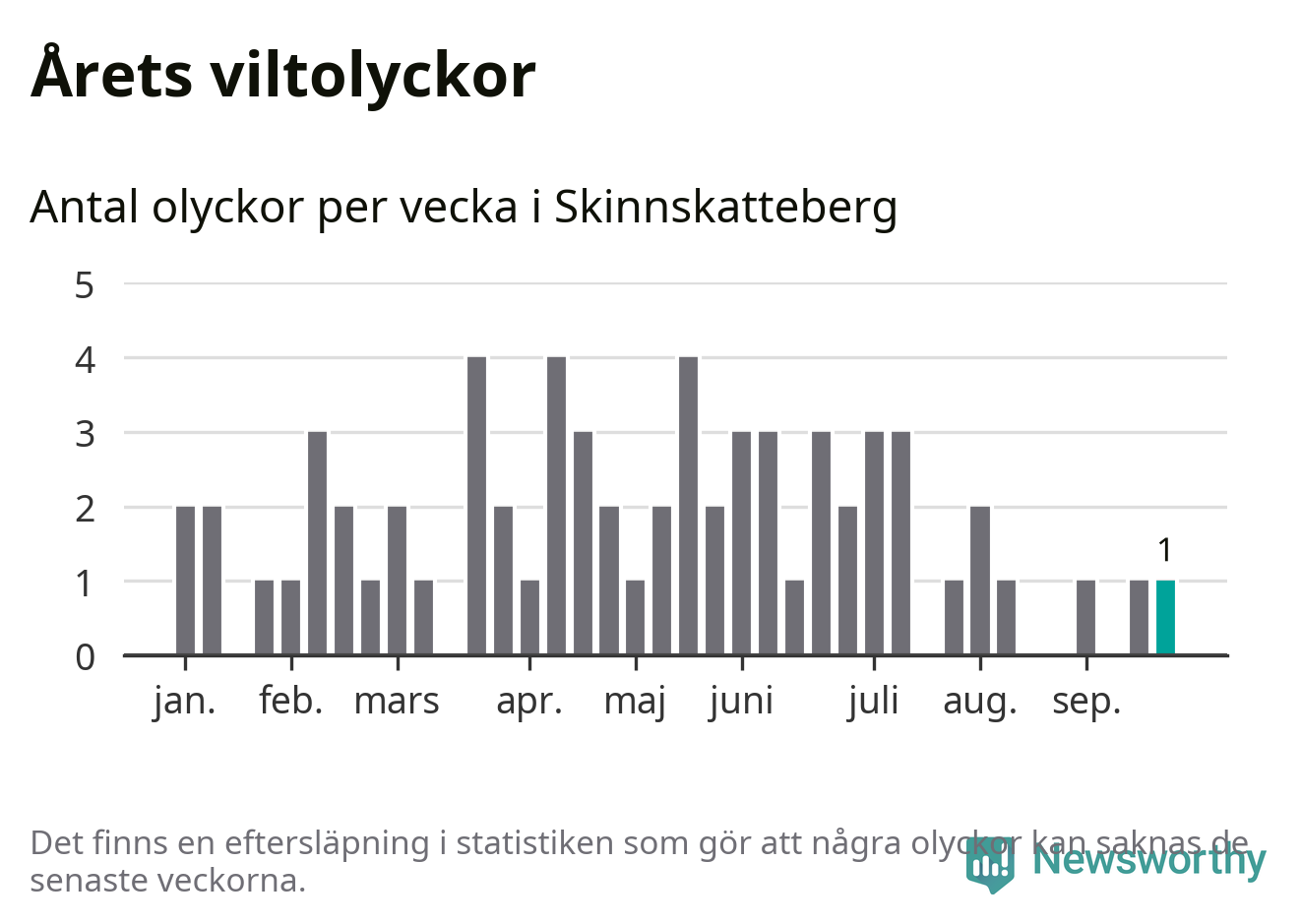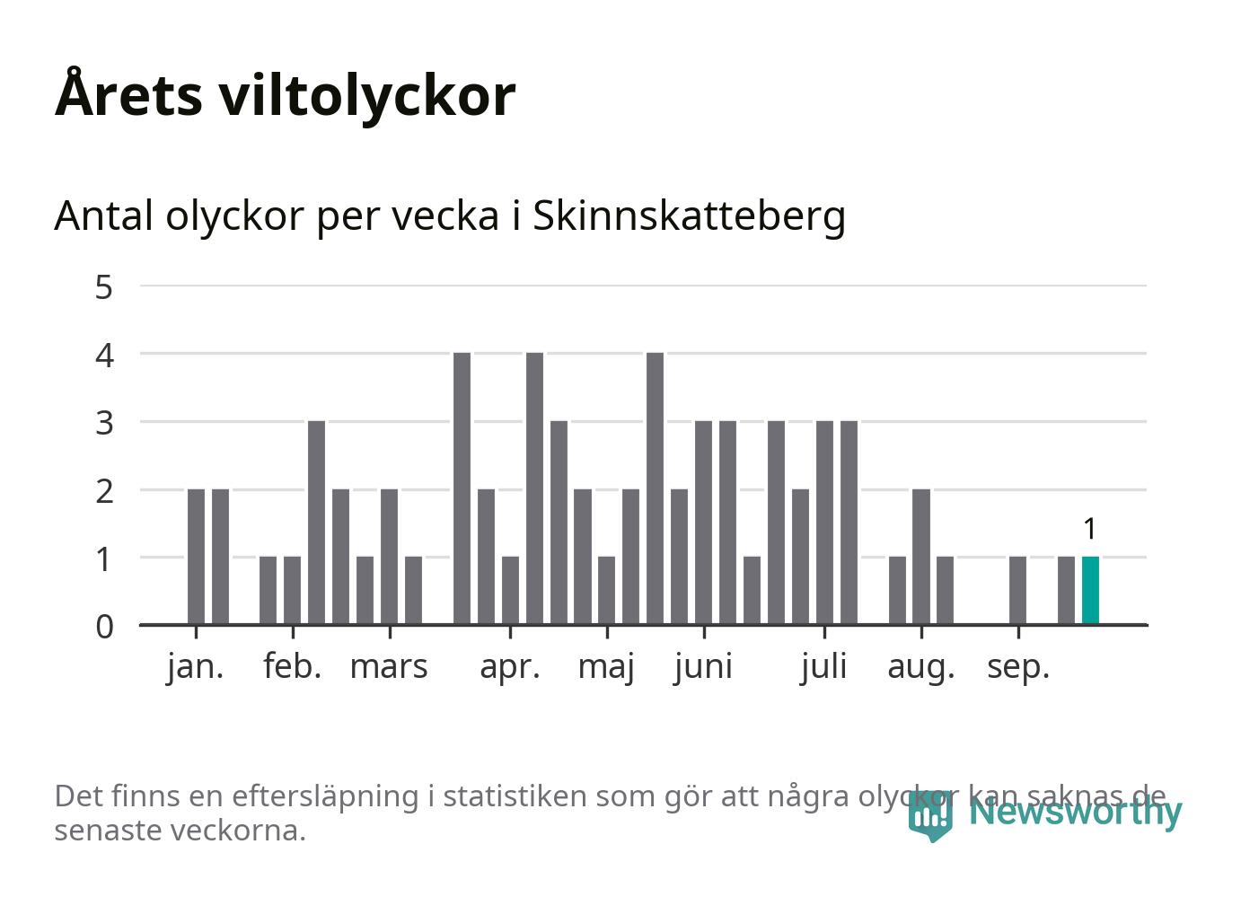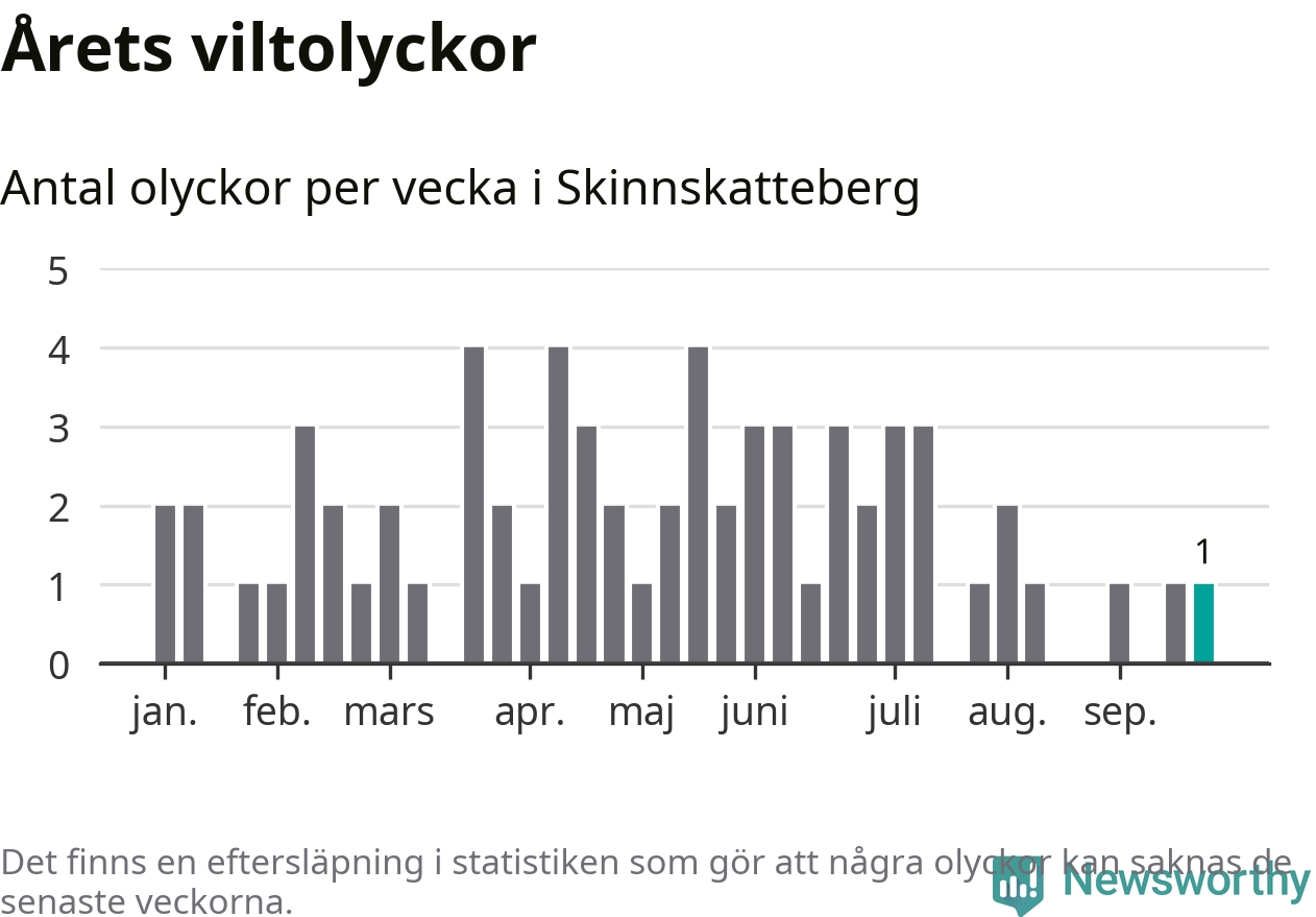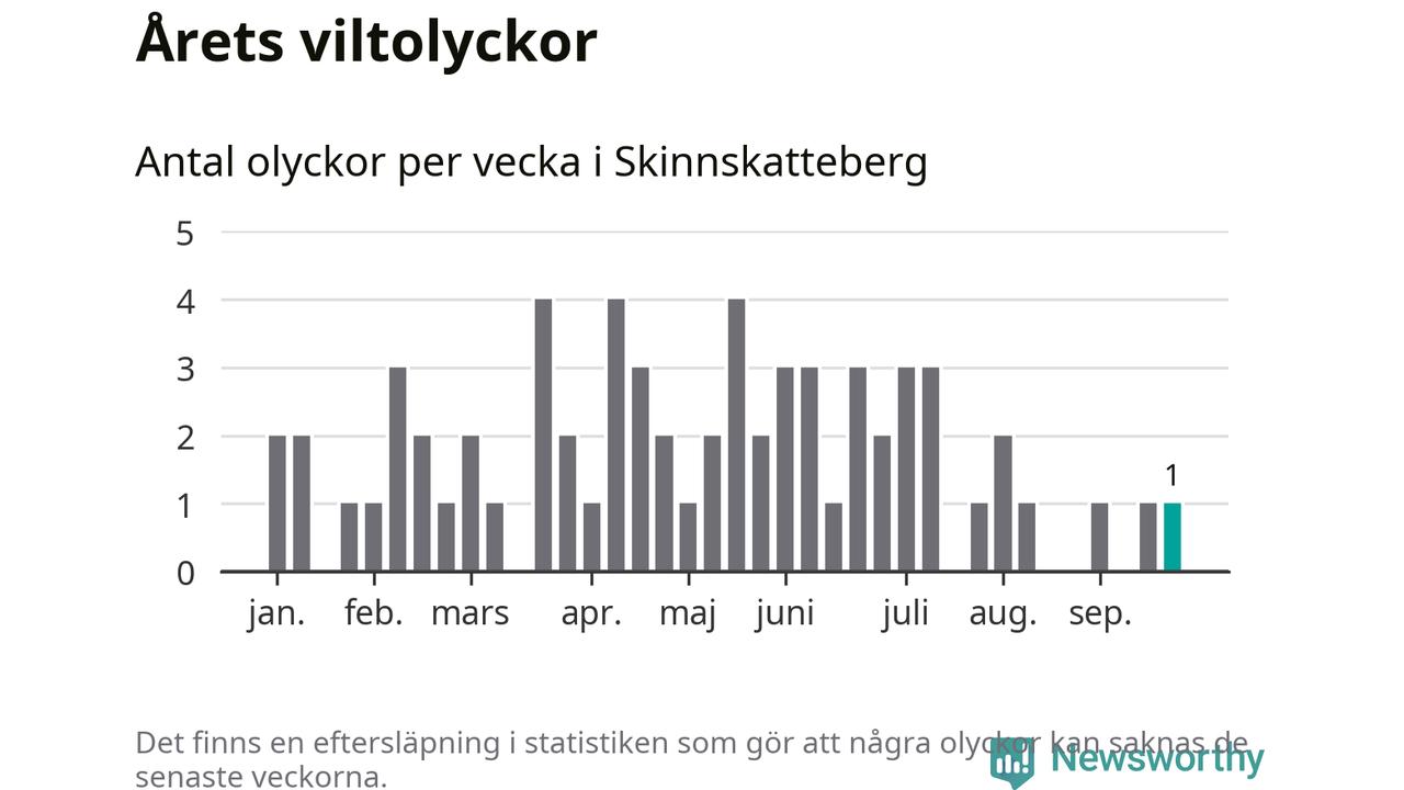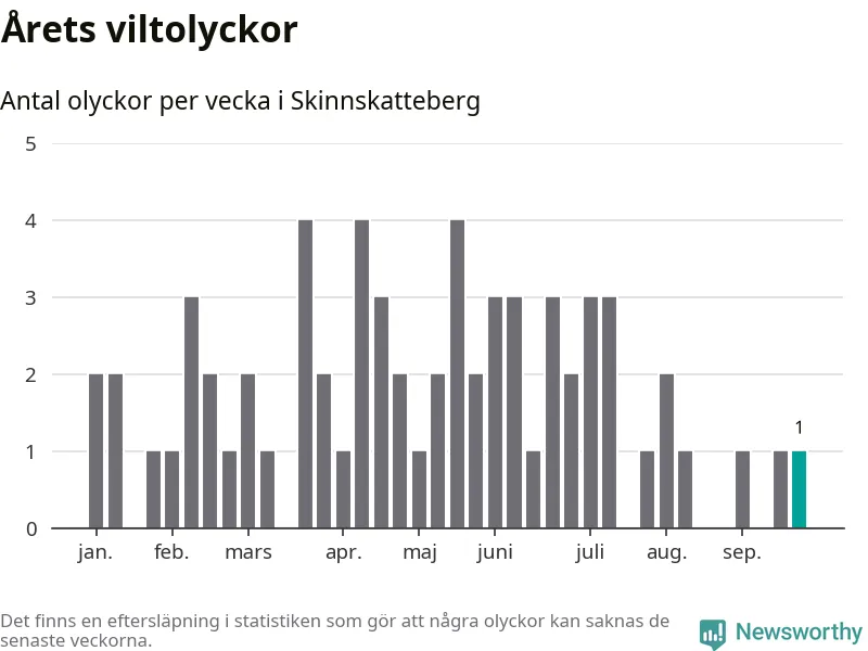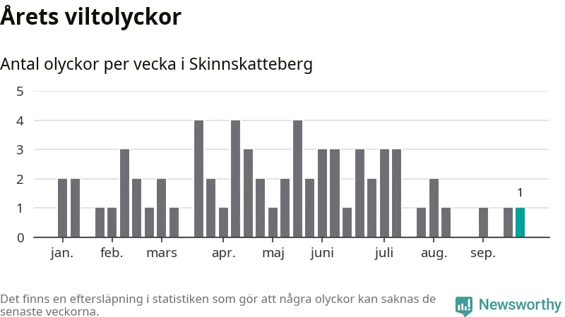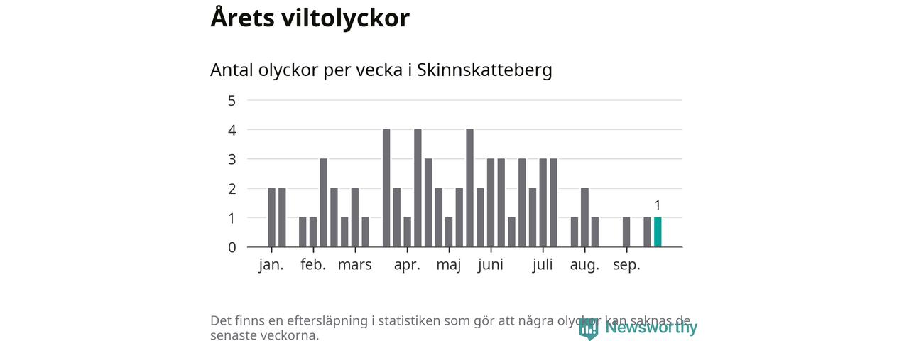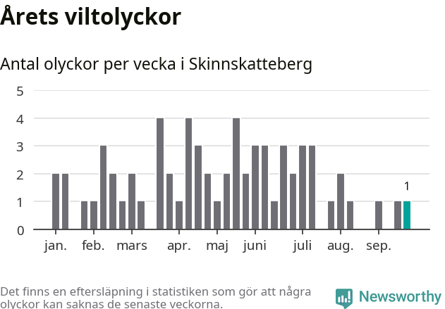 Från förra veckan (vecka 39) har hittills en viltolycka rapporterats in i Skinnskattebergs kommun.