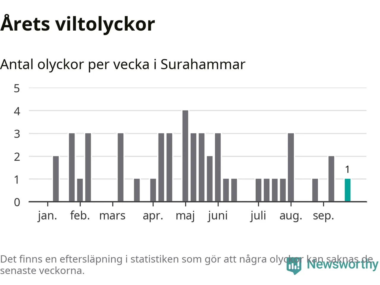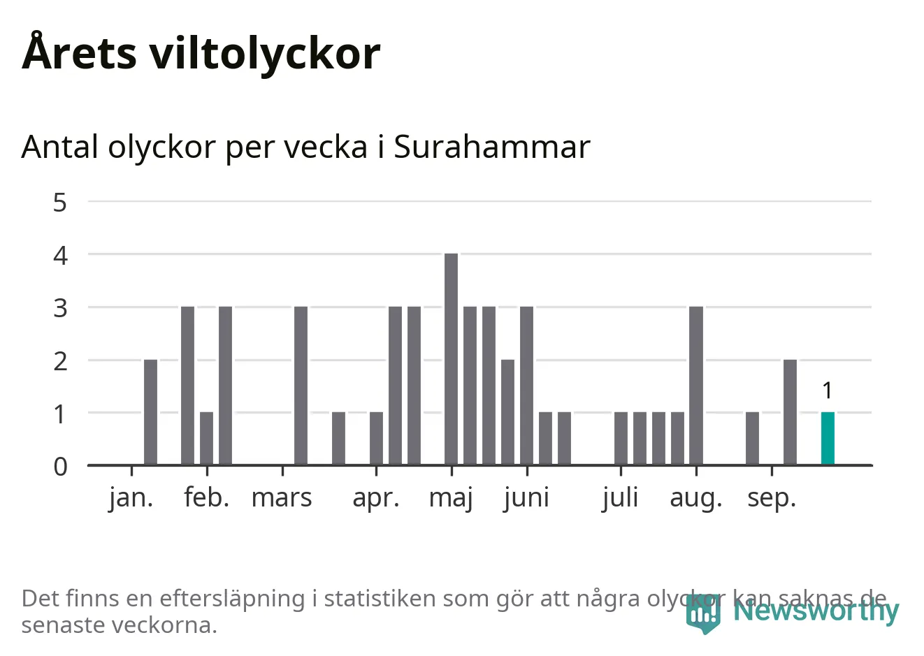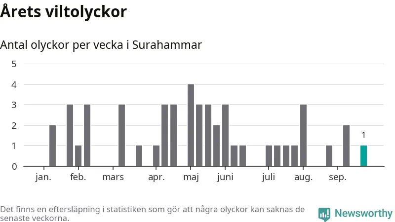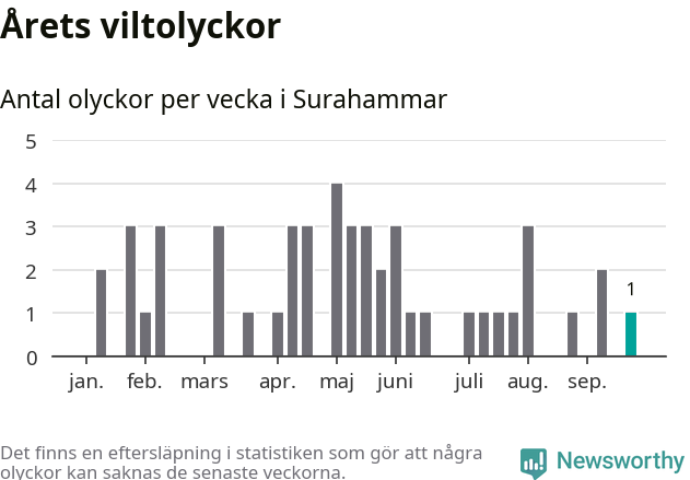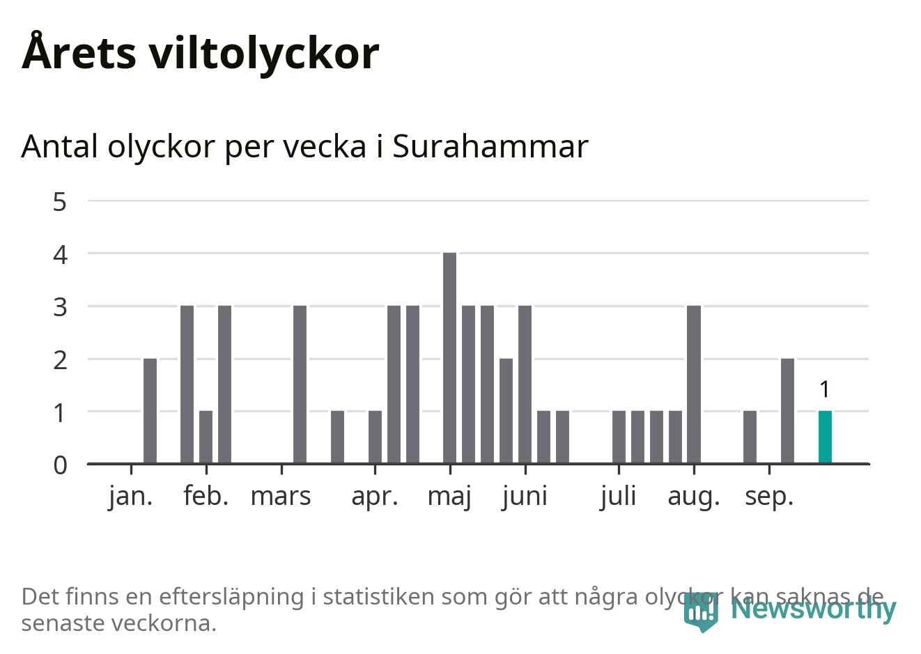 Från förra veckan (vecka 39) har hittills en viltolycka rapporterats in i Surahammars kommun.