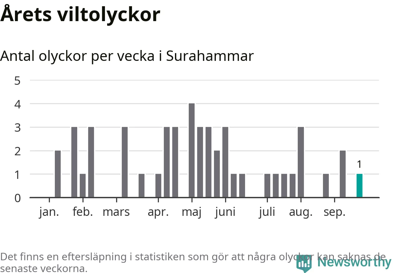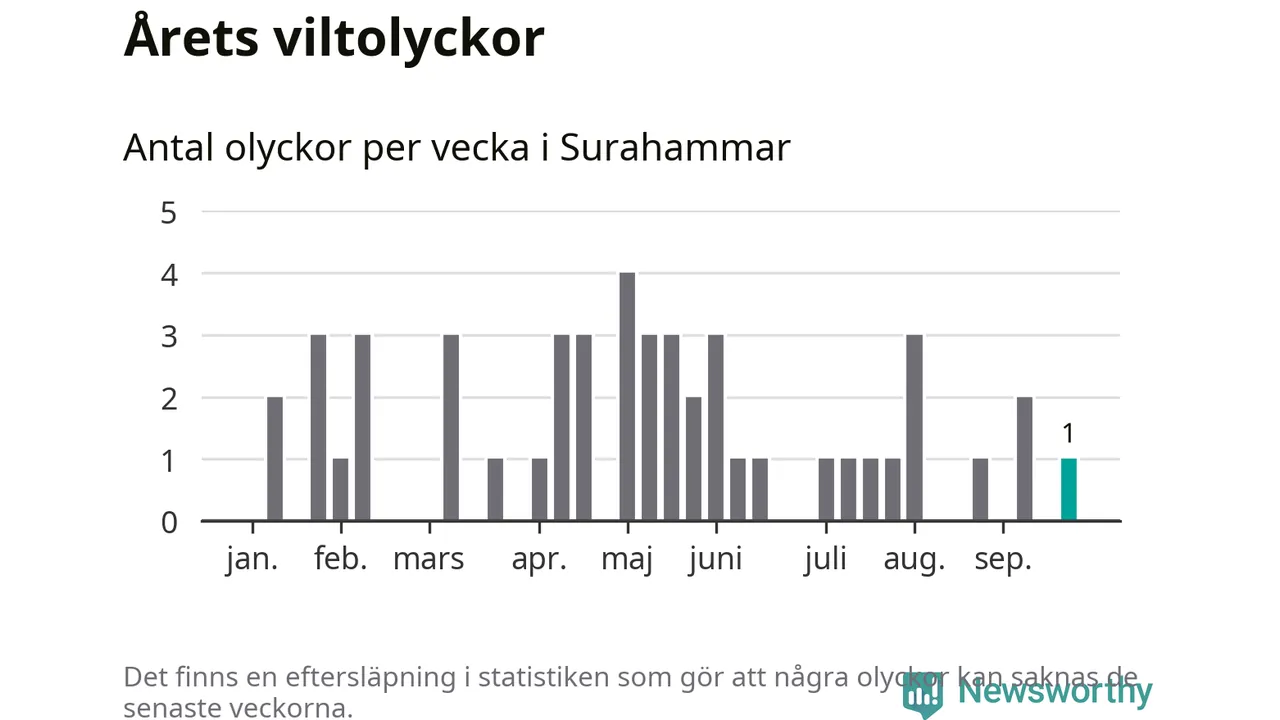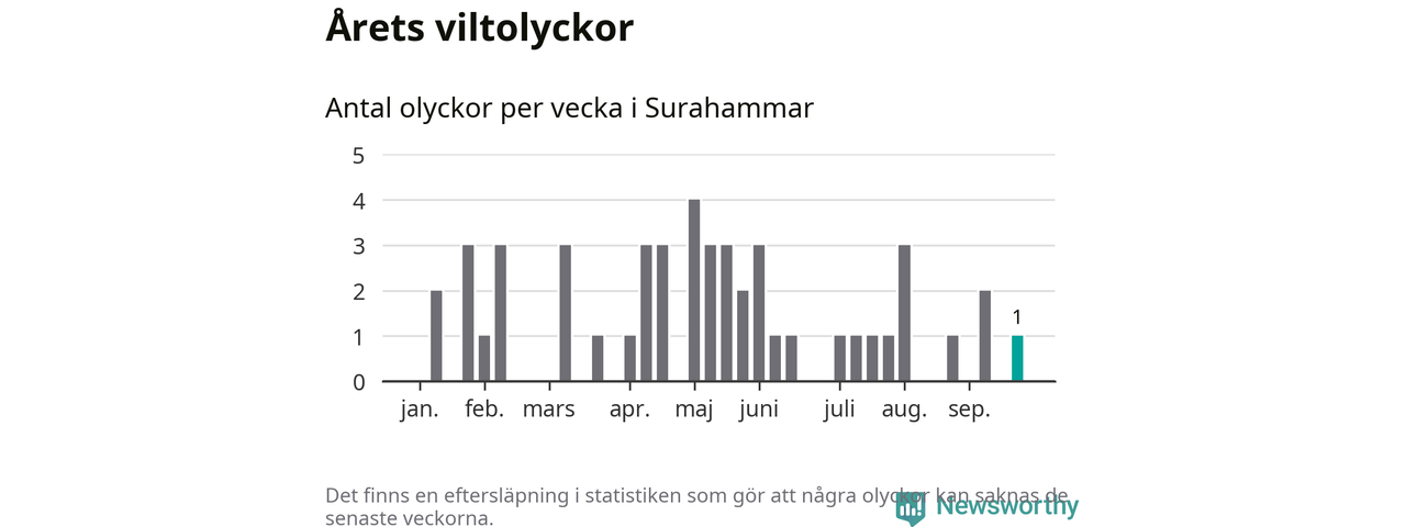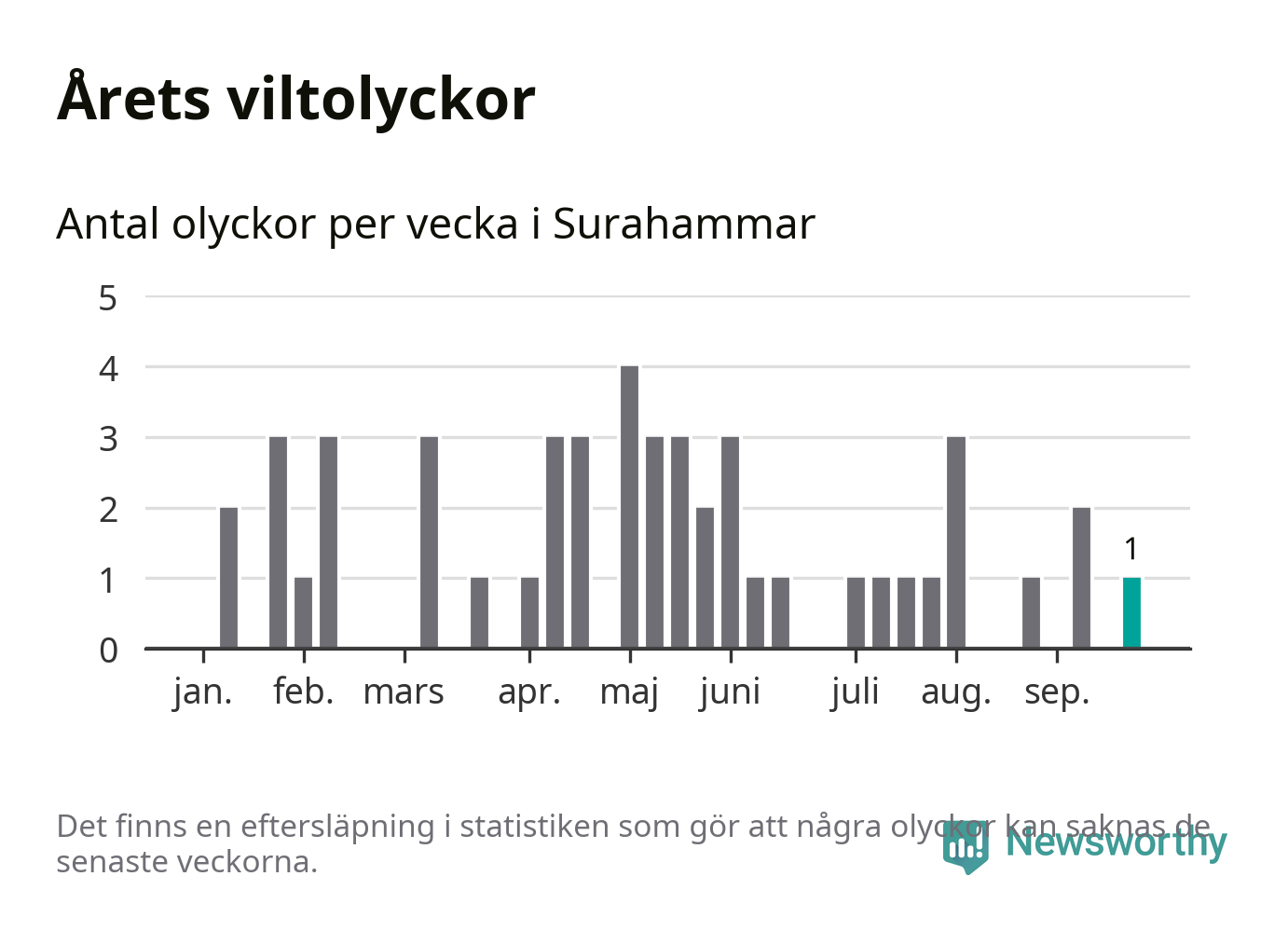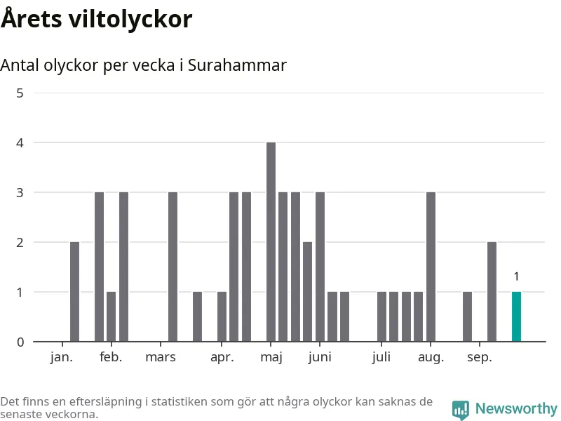 Från förra veckan (vecka 39) har hittills en viltolycka rapporterats in i Surahammars kommun.