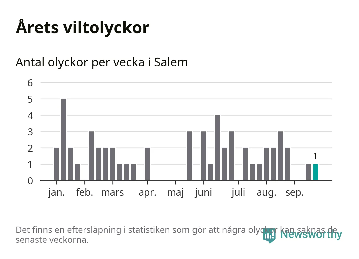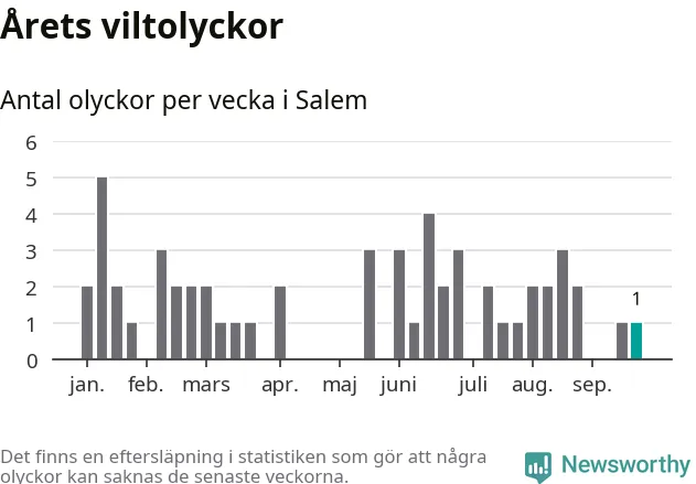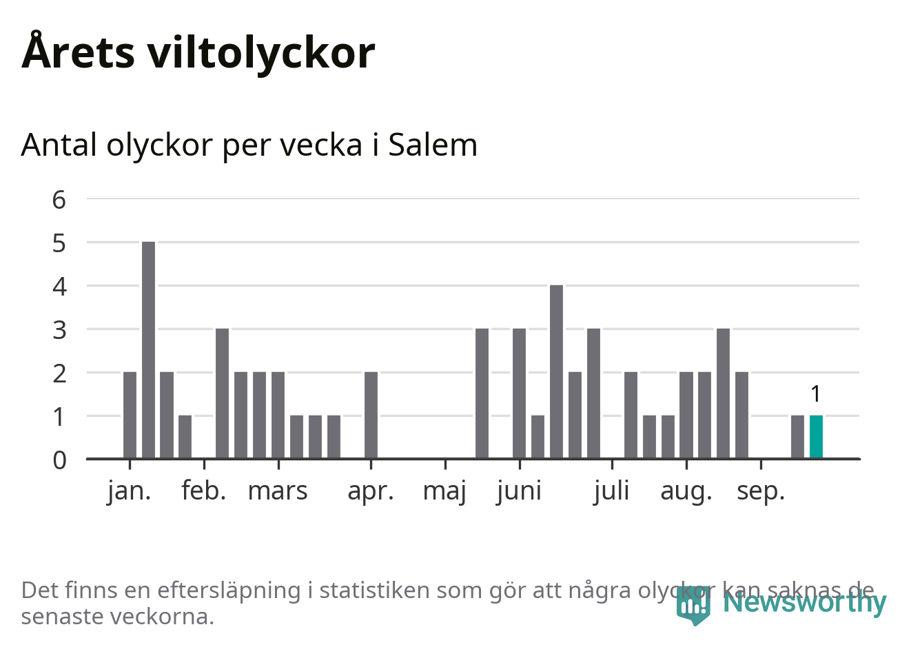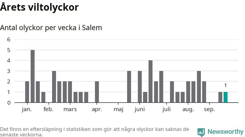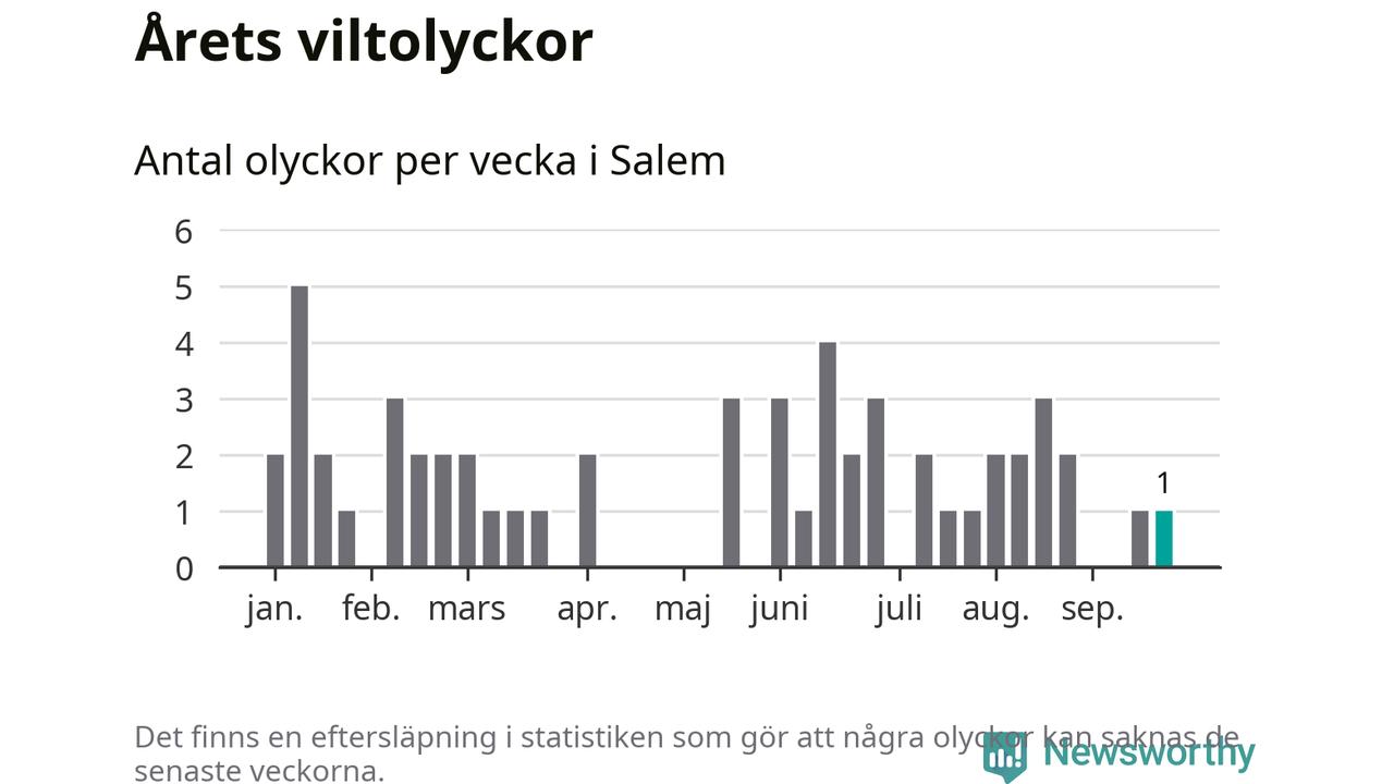 Från förra veckan (vecka 39) har hittills en viltolycka rapporterats in i Salems kommun.