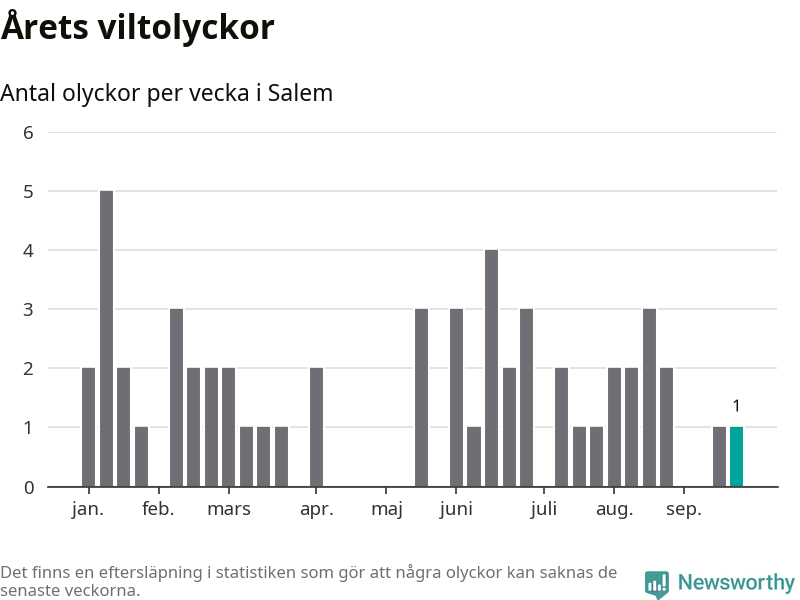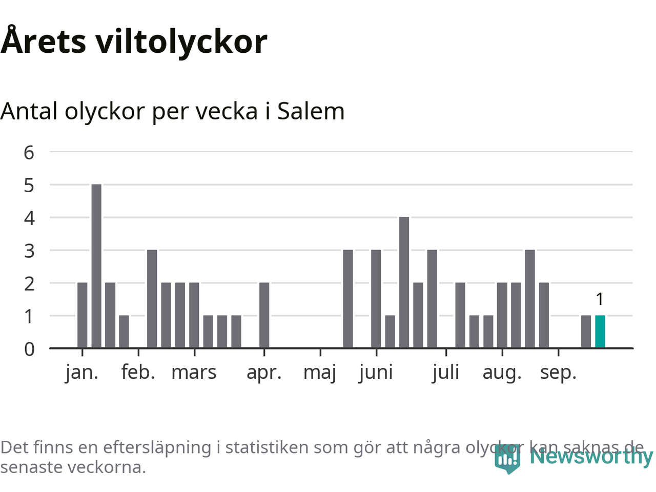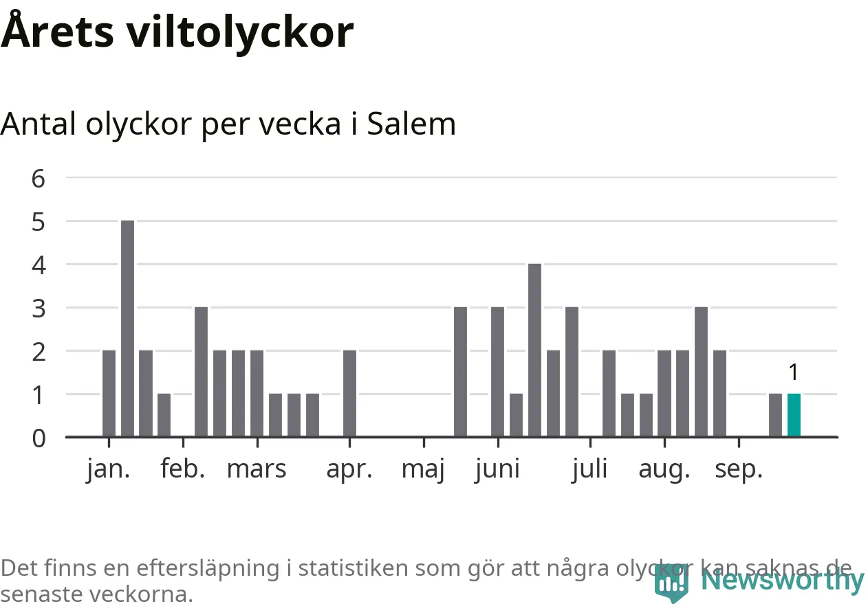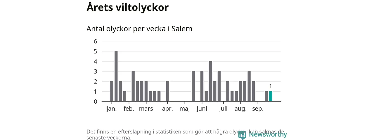 Från förra veckan (vecka 39) har hittills en viltolycka rapporterats in i Salems kommun.