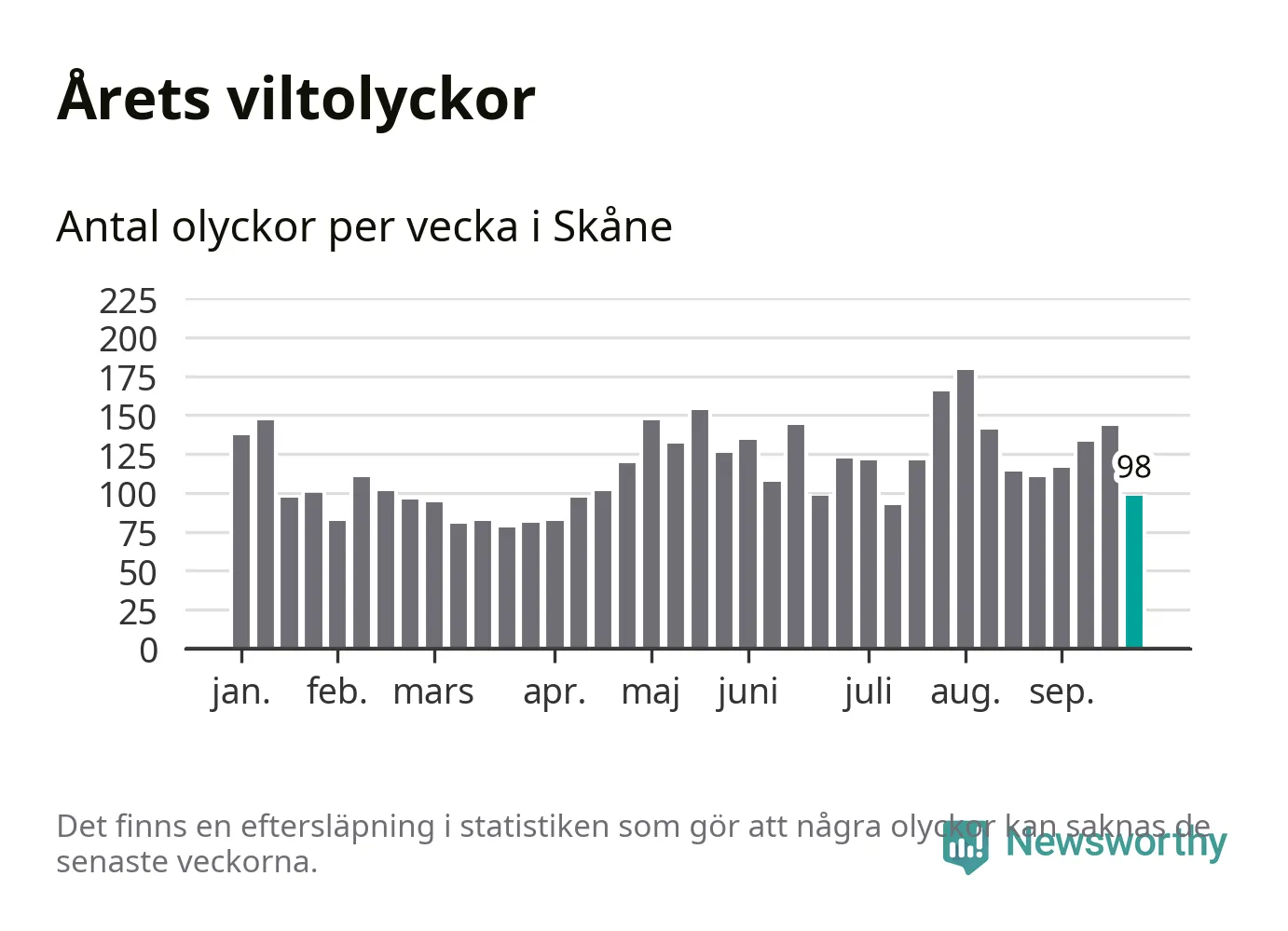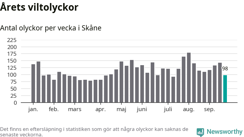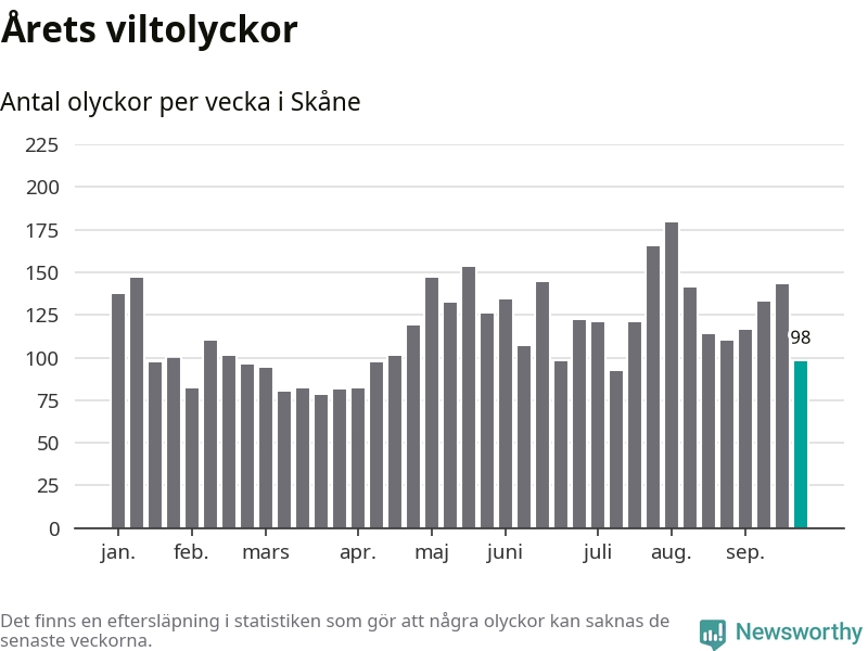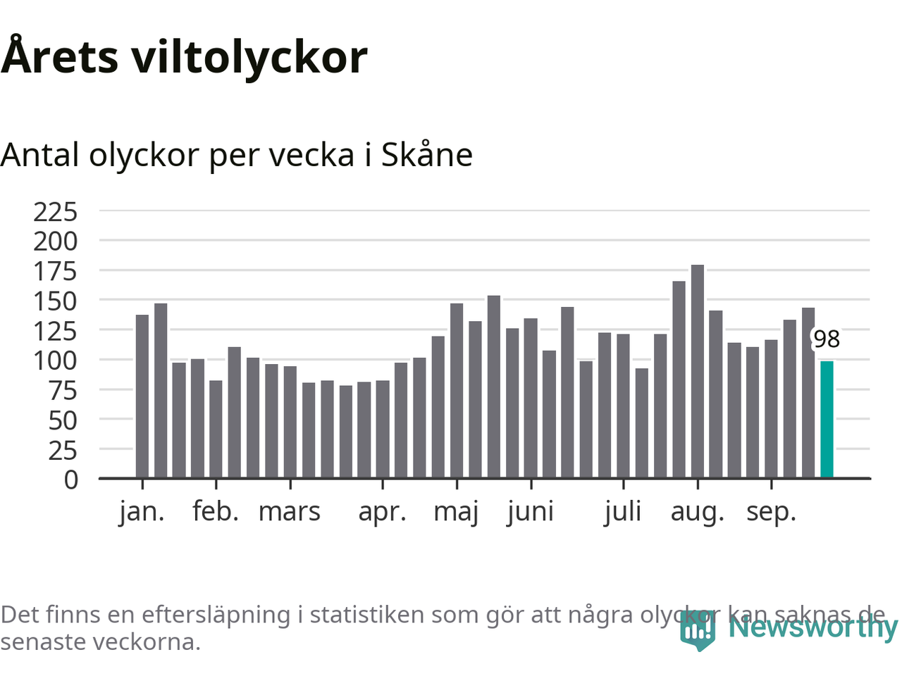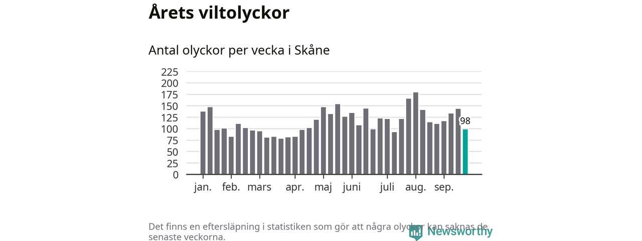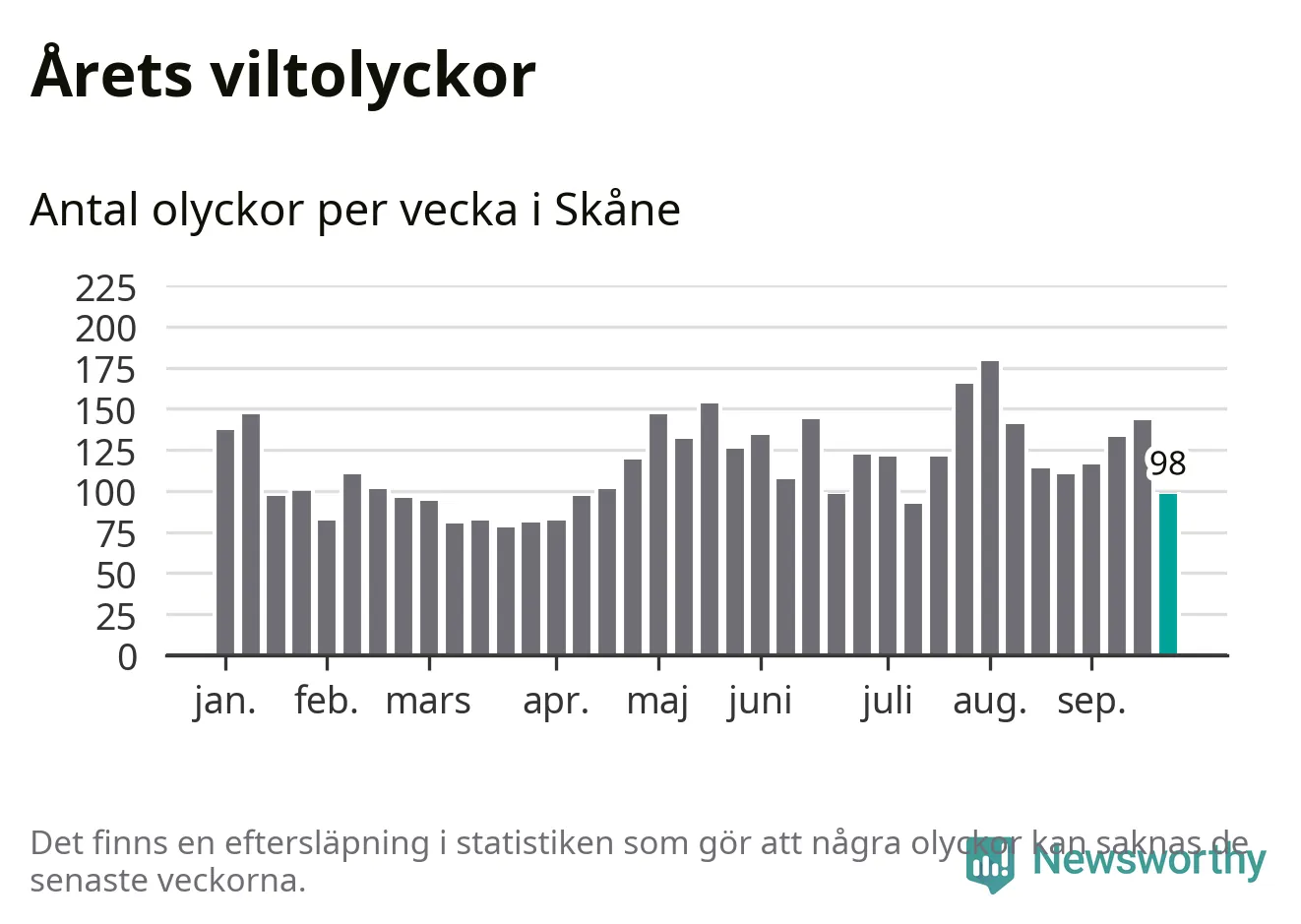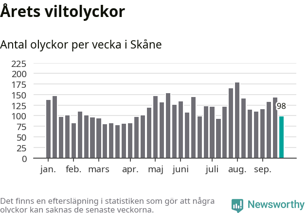 Hittills har 98 viltolyckor rapporterats in i Skåne län från vecka 39. Se listan här.