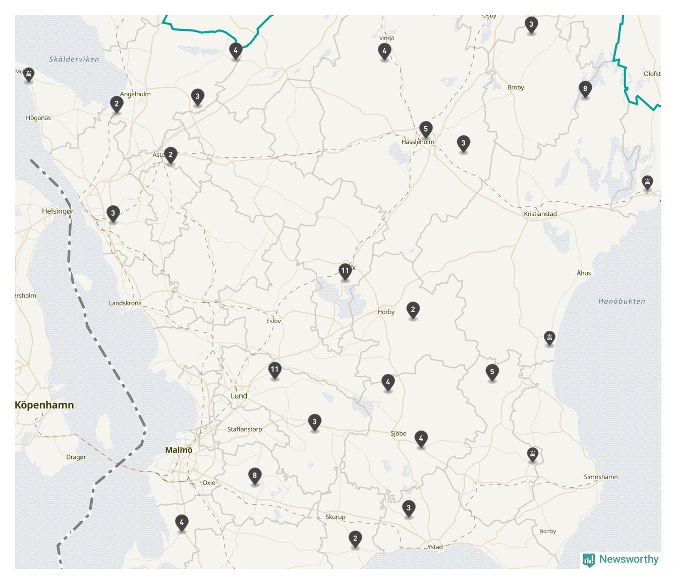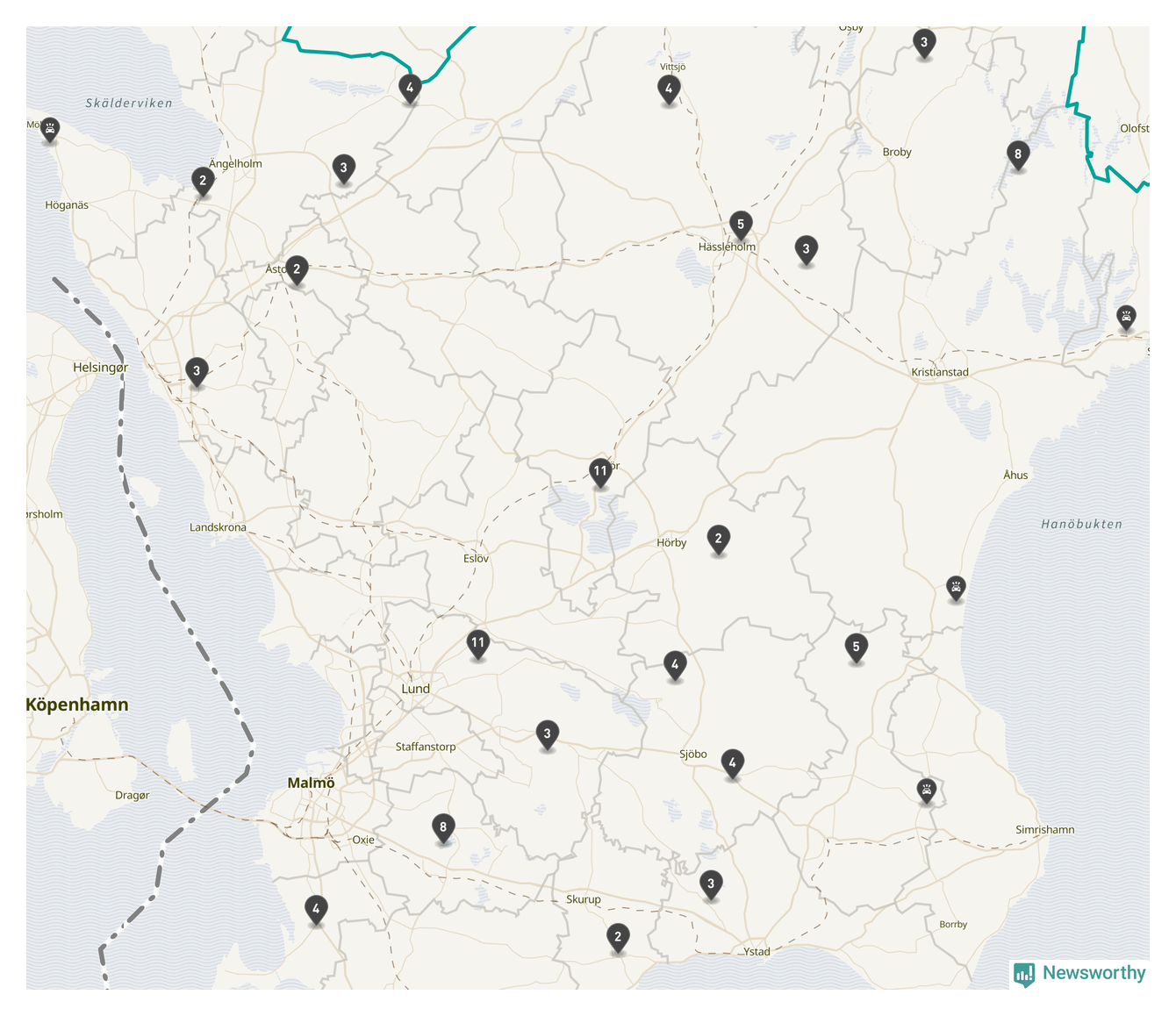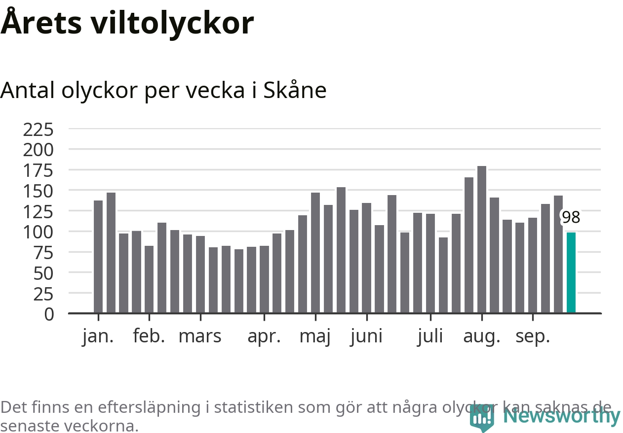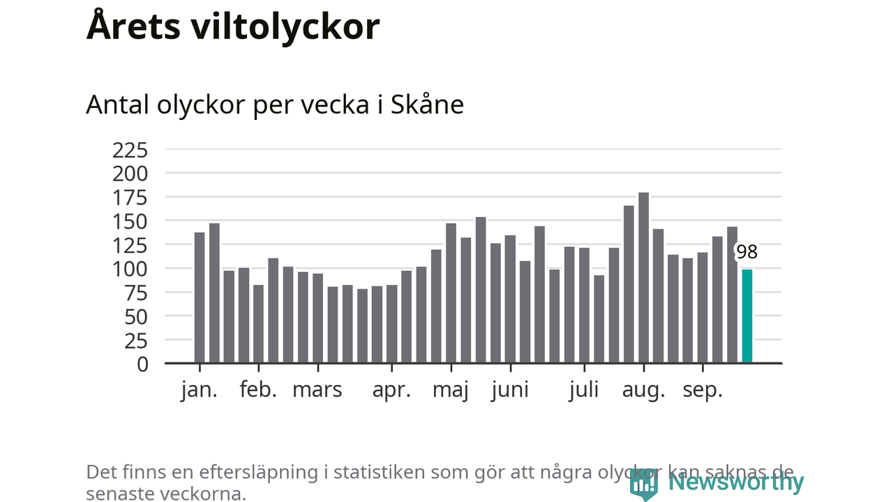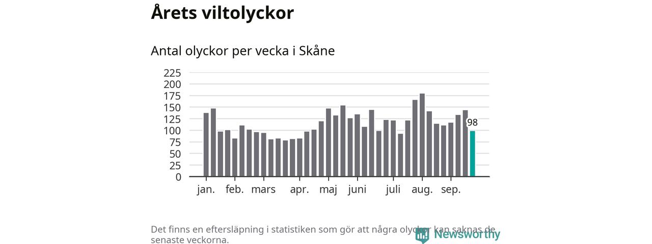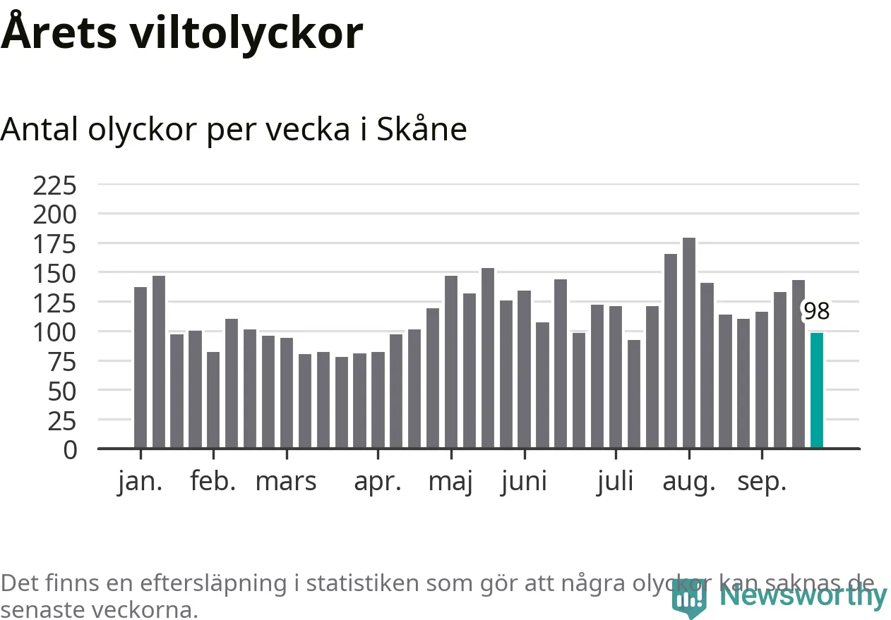 Hittills har 98 viltolyckor rapporterats in i Skåne län från vecka 39. Se listan här.